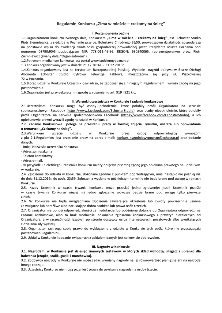 Regulamin Konkursu „Zima w mieście – czekamy na śnieg” I. Postanowienia ogólne 1.1.Organizatorem konkursu zwanego dalej Konkursem „Zima w mieście – czekamy na śnieg” jest Echostar Studio Piotr Ziemniewicz, z siedzibą w Poznaniu przy os. Bolesława Chrobrego 36/50, prowadzącym działalność gospodarczą na podstawie wpisu do ewidencji działalności gospodarczej prowadzonej przez Prezydenta Miasta Poznania pod numerem 03790/90/5 posiadającym NIP: 778-011-46-96, REGON: 630540065, reprezentowanym przez Piotr Ziemniewicz (zwany dalej ”Organizatorem”). 1.2.Patronem medialnym konkursu jest portal www.codziennypoznan.pl 1.3.Konkurs organizowany jest w dniach: 21.12.2016r. - 31.12.2016r. 1.4.Konkurs organizowany jest na terytorium Rzeczpospolitej Polskiej. Wydanie nagród odbywa w Biurze Obsługi Abonenta Echostar Studio Cyfrowa Telewizja Kablowa, mieszczącym się przy ul. Piątkowskiej 72 w Poznaniu. 1.5.Biorąc udział w Konkursie Uczestnik oświadcza, że zapoznał się z niniejszym Regulaminem i wyraża zgodę na jego postanowienia. 1.6.Organizator jest przyrzekającym nagrodę w rozumieniu art. 919 i 921 k.c. II. Warunki uczestnictwa w Konkursie i zadanie konkursowe 2.1.Uczestnikami Konkursu mogą być osoby pełnoletnie, które polubiły profil Organizatora na serwisie społecznościowym Facebook (https://www.facebook.com/EchostarStudio), oraz osoby niepełnoletnie, które polubiły profil Organizatora na serwisie społecznościowym Facebook (https://www.facebook.com/EchostarStudio), a ich opiekunowie prawni wyrazili zgodę na udział w Konkursie. 2.2. Zadanie Konkursowe polega na przesłaniu pracy w formie; zdjęcia, rysunku, wiersza lub opowiadania o tematyce: „Czekamy na śnieg”. 2.3.Warunkiem wzięcia udziału w Konkursie przez osobę odpowiadającą wymogom z pkt 2.1.Regulaminu jest przesłanie pracy na adres e-mail: [email protected] oraz podanie danych: - Imię i Nazwisko uczestnika Konkursu - Adres zamieszkania - Telefon kontaktowy - Adres e-mail. - w przypadku nieletniego uczestnika konkursu należy dołączyć pisemną zgodę jego opiekuna prawnego na udział ww. w konkursie. 2.4. Zgłoszenie do udziału w Konkursie, dokonane zgodnie z punktem poprzedzającym, musi nastąpić nie później niż do dnia 31.12.2016r. do godz. 23:59. Zgłoszenia wysłane w późniejszym terminie nie będą brane pod uwagę w ramach Konkursu. 2.5. Każdy Uczestnik w czasie trwania Konkursu może przesłać jedno zgłoszenie; jeżeli Uczestnik prześle w czasie trwania Konkursu więcej niż jedno zgłoszenie wówczas będzie brane pod uwagę tylko pierwsze z nich. 2.6. W Konkursie nie będą uwzględniane zgłoszenia zawierające określenia lub zwroty powszechnie uznane za wulgarne lub obraźliwe albo naruszające dobra osobiste lub prawa osób trzecich. 2.7. Organizator nie ponosi odpowiedzialności za niedotarcie lub opóźnione dotarcie do Organizatora odpowiedzi na zadanie konkursowe, albo za brak możliwości dokonania zgłoszenia konkursowego z przyczyn niezależnych od Organizatora, a w szczególności leżących po stronie dostawcy usług internetowych, pocztowych albo wynikających z działania siły wyższej. 2.8. Organizator zastrzega sobie prawo do wykluczenia z udziału w Konkursie tych osób, które nie przestrzegają postanowień Regulaminu. 2.9. Udział w Konkursie i podanie związanych z udziałem danych jest całkowicie dobrowolne. III. Nagrody w Konkursie 3.1. Nagrodami w Konkursie jest dziesięć zimowych zestawów, w których skład wchodzą: ślizgacz i ubranko dla bałwanka (czapka, szalik, guziki i marchewka). 3.2. Zdobywca nagrody w Konkursie nie może żądać wymiany nagrody na jej równowartość pieniężną ani na nagrodę innego rodzaju. 3.3. Uczestnicy Konkursu nie mogą przenieść prawa do uzyskania nagrody na osoby trzecie. IV. Zasady przyznawania i wydawania nagród w Konkursie 4.1. Wyłonienie finalistów Konkursu nastąpi dnia 03.01.2017r. i będzie polegało na wyłonieniu 10 zwycięzców, którzy jako pierwsi nadeślą swoje zgłoszenia. Komisja Konkursowa w składzie: Anna Rzysko, Magdalena Łaniecka. 4.2. Lista zwycięzców Konkursu zostanie ogłoszona na fanpage’u Organizatora w portalu Facebook oraz na stronie internetowej partnera medialnego www.codziennypoznan.pl w dniu 04.01.2017r. do godz. 20:00. 4.3 Uczestnicy Konkursu wyrażają zgodę na opublikowanie ich danych osobowych, oraz wizerunku na stronach www: http://www.codziennypoznan.pl/ http://www.echostar.pl/ https://www.facebook.com/EchostarStudio 4.4. Każdy ze zwycięzców nagrody w Konkursie zostanie powiadomiony o swojej wygranej telefonicznie lub za pomocą informacji e-mail, w terminie nie później niż 1 dzień roboczy od dnia wyłonienia zwycięzców Konkursu. Nagrody zostaną wydane zwycięzcom w Biurze Obsługi Abonenta Echostar Studio Cyfrowa Telewizja Kablowa mieszczącym się przy ul. Piątkowskiej 72 w Poznaniu (odbiór nagrody będzie możliwy w godzinach od 9:00 do 15:00 w dniach: 04.01.2017r. - 13.01.2017r. lub w innych godzinach po wcześniejszym uzgodnieniu). 4.5. Organizator nie ponosi odpowiedzialności za brak możliwości wydania Uczestnikowi nagrody z przyczyn leżących po stronie Uczestnika, a w szczególności z powodu nie odebrania telefonu lub wiadomości e-mailowej z informacją o wygranej przed terminem wydania nagrody. V. Postępowanie reklamacyjne 5.1. Reklamacje, co do przebiegu Konkursu mogą być zgłaszane pisemnie na adres Organizatora: Echostar Studio ul. Piątkowska 72, 60-649 Poznań, z dopiskiem: „Reklamacja”, do dnia 15.01.2017r. O zachowaniu terminu składania reklamacji decyduje data dotarcia reklamacji pod wskazany w niniejszym punkcie adres. 5.2. Prawo złożenia reklamacji przysługuje jedynie Uczestnikom Konkursu. 5.3. Pisemna reklamacja powinna zawierać imię, nazwisko i dokładny adres Uczestnika, jak również dokładny opis i wskazanie przyczyny reklamacji. 5.4. Reklamacje rozpatrywane są przez Organizatora w 