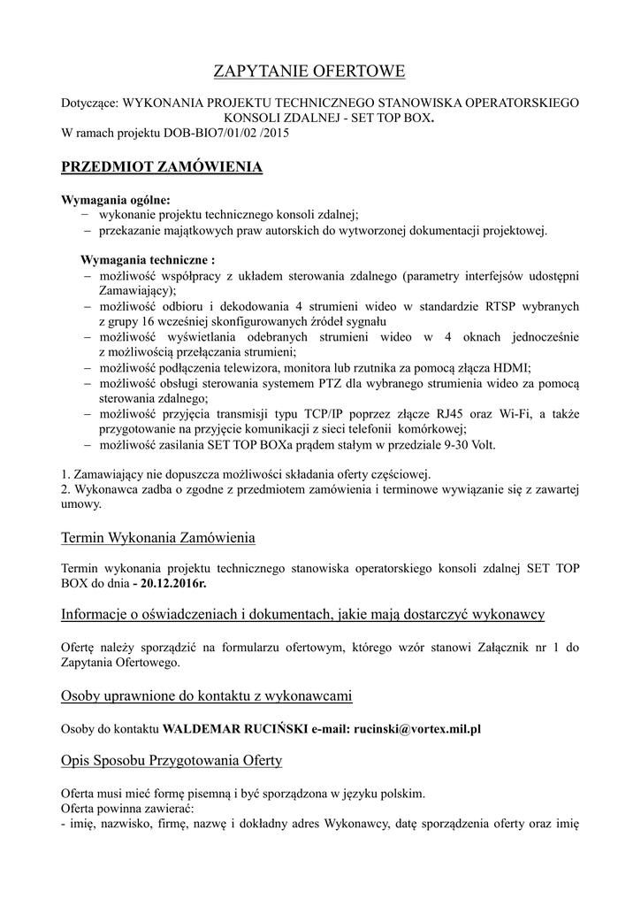 ZAPYTANIE OFERTOWE Dotyczące: WYKONANIA PROJEKTU TECHNICZNEGO STANOWISKA OPERATORSKIEGO KONSOLI ZDALNEJ - SET TOP BOX. W ramach projektu DOB-BIO7/01/02 /2015 PRZEDMIOT ZAMÓWIENIA Wymagania ogólne: − wykonanie projektu technicznego konsoli zdalnej; przekazanie majątkowych praw autorskich do wytworzonej dokumentacji projektowej. Wymagania techniczne : możliwość współpracy z układem sterowania zdalnego (parametry interfejsów udostępni Zamawiający); możliwość odbioru i dekodowania 4 strumieni wideo w standardzie RTSP wybranych z grupy 16 wcześniej skonfigurowanych źródeł sygnału możliwość wyświetlania odebranych strumieni wideo w 4 oknach jednocześnie z możliwością przełączania strumieni; możliwość podłączenia telewizora, monitora lub rzutnika za pomocą złącza HDMI; możliwość obsługi sterowania systemem PTZ dla wybranego strumienia wideo za pomocą sterowania zdalnego; możliwość przyjęcia transmisji typu TCP/IP poprzez złącze RJ45 oraz Wi-Fi, a także przygotowanie na przyjęcie komunikacji z sieci telefonii komórkowej; możliwość zasilania SET TOP BOXa prądem stałym w przedziale 9-30 Volt. 1. Zamawiający nie dopuszcza możliwości składania oferty częściowej. 2. Wykonawca zadba o zgodne z przedmiotem zamówienia i terminowe wywiązanie się z zawartej umowy. Termin Wykonania Zamówienia Termin wykonania projektu technicznego stanowiska operatorskiego konsoli zdalnej SET TOP BOX do dnia - 20.12.2016r. Informacje o oświadczeniach i dokumentach, jakie mają dostarczyć wykonawcy Ofertę należy sporządzić na formularzu ofertowym, którego wzór stanowi Załącznik nr 1 do Zapytania Ofertowego. Osoby uprawnione do kontaktu z wykonawcami Osoby do kontaktu WALDEMAR RUCIŃSKI e-mail: [email protected] Opis Sposobu Przygotowania Oferty Oferta musi mieć formę pisemną i być sporządzona w języku polskim. Oferta powinna zawierać: - imię, nazwisko, firmę, nazwę i dokładny adres Wykonawcy, datę sporządzenia oferty oraz imię i nazwisko osoby uprawnionej do reprezentowania Wykonawcy; - własnoręczny podpis Wykonawcy bądź osób mających prawo zaciągania zobowiązań w jego imieniu. Oferta na „Projekt techniczny konsoli zdalnej SET TOP BOX”. Adres: Vortex Spółka z o.o., al. Grunwaldzka 28/6, 80-229 Gdańsk Oferty Można Składać - pocztą lub osobiście na adres powyższy; - przesłać podpisany formularz ofertowy: na nr fax. 58 355 51 21 lub adres mailowy: [email protected] w nieprzekraczalnym terminie do: 15 LISTOPADA 2016 r. do godz. 15.00 Opis Kryteriów, Którymi Zamawiający Będzie Kierował Się Przy Wyborze Oferty, Wraz Z Podaniem Znaczenia Tych Kryteriów. Zamawiający zleci realizację zamówienia Wykonawcy, co do którego oferty ustalono, iż odpowiada ona wymaganiom przedstawionym w niniejszej dokumentacji, oraz który zaoferował najkorzystniejszą - najniższą cenę ofertową brutto. Inne Postanowienia - Zamawiający zastrzega sobie prawo do zamknięcia postępowania bez wyboru oferty. Załącznik nr 1 Formularz ofertowy ………………………… (miejscowość, data) ……………………….. (pieczęć oferenta) OFERTA Na wykonanie projektu technicznego stanowiska operatorskiego konsoli zdalnej SET TOP BOX. Dane dotyczące oferenta: Nazwa: ………………………………… Siedziba: ………………………………. Nr Telefonu/faksu: ……………………. NIP: ……………………………………. Oferujemy wykonanie projektu technicznego stanowiska operatorskiego konsoli zdalnej SET TOP BOX zgodnie z zapytaniem ofertowym za łączną kwotę: Netto: …………………… zł. (słownie: ………………………………………………………. zł.) Brutto: …………………… zł. (słownie: …………………………………………………….... zł.) w tym podatek VAT w wysokości ….. % tj. …...... zł. (słownie: ……………………………… zł.) Oświadczamy, że oferowana cena za całość zamówienia zawiera wszystkie koszty związane z realizacją przedmiotu zamówienia. Oświadczamy, że zapoznaliśmy się z treścią zapytania i nie wnosimy do niej zastrzeżeń. Oświadczamy, że posiadamy niezbędną wiedzę i doświadczenie oraz dysponujemy potencjałem technicznym i osobami zdolnymi do wykonania zamówienia. Oświadczamy, że znajdujemy się w sytuacji ekonomicznej i finansowej zapewniającej wykonanie zamówienia. …………………………………….. (podpis upoważnionego przedstawiciela oferenta)