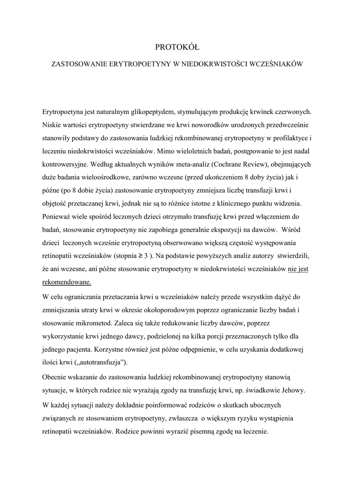 PROTOKÓŁ ZASTOSOWANIE ERYTROPOETYNY W NIEDOKRWISTOŚCI WCZEŚNIAKÓW Erytropoetyna jest naturalnym glikopeptydem, stymulującym produkcję krwinek czerwonych. Niskie wartości erytropoetyny stwierdzane we krwi noworodków urodzonych przedwcześnie stanowiły podstawy do zastosowania ludzkiej rekombinowanej erytropoetyny w profilaktyce i leczeniu niedokrwistości wcześniaków. Mimo wieloletnich badań, postępowanie to jest nadal kontrowersyjne. Według aktualnych wyników meta-analiz (Cochrane Review), obejmujących duże badania wieloośrodkowe, zarówno wczesne (przed ukończeniem 8 doby życia) jak i późne (po 8 dobie życia) zastosowanie erytropoetyny zmniejsza liczbę transfuzji krwi i objętość przetaczanej krwi, jednak nie są to różnice istotne z klinicznego punktu widzenia. Ponieważ wiele spośród leczonych dzieci otrzymało transfuzję krwi przed włączeniem do badań, stosowanie erytropoetyny nie zapobiega generalnie ekspozycji na dawców. Wśród dzieci leczonych wcześnie erytropoetyną obserwowano większą częstość występowania retinopatii wcześniaków (stopnia ≥ 3 ). Na podstawie powyższych analiz autorzy stwierdzili, że ani wczesne, ani późne stosowanie erytropoetyny w niedokrwistości wcześniaków nie jest rekomendowane. W celu ograniczania przetaczania krwi u wcześniaków należy przede wszystkim dążyć do zmniejszania utraty krwi w okresie okołoporodowym poprzez ograniczanie liczby badań i stosowanie mikrometod. Zaleca się także redukowanie liczby dawców, poprzez wykorzystanie krwi jednego dawcy, podzielonej na kilka porcji przeznaczonych tylko dla jednego pacjenta. Korzystne również jest późne odpępnienie, w celu uzyskania dodatkowej ilości krwi („autotransfuzja”). Obecnie wskazanie do zastosowania ludzkiej rekombinowanej erytropoetyny stanowią sytuacje, w których rodzice nie wyrażają zgody na transfuzję krwi, np. świadkowie Jehowy. W każdej sytuacji należy dokładnie poinformować rodziców o skutkach ubocznych związanych ze stosowaniem erytropoetyny, zwłaszcza o większym ryzyku wystąpienia retinopatii wcześniaków. Rodzice powinni wyrazić pisemną zgodę na leczenie. Z uwagi na prawdopodobny udział erytropoetyny w neowaskularyzacji siatkówki, nie powinna ona być stosowana w okresie przypadającym na fazę proliferacyjną retinopatii wcześniaków, czyli powyżej 34 tygodnia wieku skorygowanego. Leczenie: Erytropoetyna – 250 - 300 U/ kg masy ciała, podskórnie, 3 x w tygodniu (np. poniedziałek, środa, piątek) Żelazo – początkowo 6 mg/ kg masy ciała (podzielone na 2 – 3 dawki), należy zwiększyć do 9 – 12 mg/kg masy ciała, jeżeli ferrytyna < 100 ng/ml Vit. E – 2 krople 1 x dziennie Monitorowanie leczenia: 1. Badania wyjściowe: morfologia krwi z rozmazem, retykulocyty, ferrytyna 2. W trakcie leczenia: Morfologia krwi z rozmazem – 1 raz w tygodniu Retykulocyty – 1 raz w tygodniu Ferrytyna – raz na dwa tygodnie; jeżeli zmieniła się podaż żelaza, należy oznaczyć ferrytynę po tygodniu Ciśnienie tętnicze krwi – codziennie Możliwe efekty uboczne: Niedobór żelaza Trombocytopenia Trombocytoza Neutropenia Nadciśnienie tętnicze Retinopatia wcześniaków Odczyny miejscowe w okolicy podania leku .
