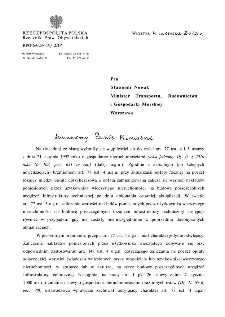 W ocenie Rzecznika, treść art. 77 ust. 4 u.g.n. w brzmieniu obowiązującym od dnia