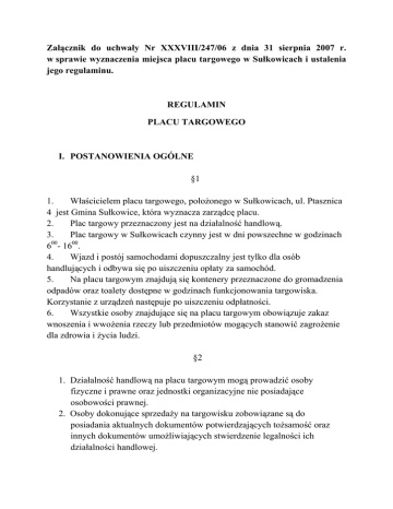 Załącznik do uchwały Nr XXXVIII/247/06 z dnia 31 sierpnia 2007 r. w sprawie wyznaczenia miejsca placu targowego w Sułkowicach i ustalenia jego regulaminu. REGULAMIN PLACU TARGOWEGO I. POSTANOWIENIA OGÓLNE §1 1. Właścicielem placu targowego, położonego w Sułkowicach, ul. Ptasznica 4 jest Gmina Sułkowice, która wyznacza zarządcę placu. 2. Plac targowy przeznaczony jest na działalność handlową. 3. Plac targowy w Sułkowicach czynny jest w dni powszechne w godzinach 00 6 - 1600. 4. Wjazd i postój samochodami dopuszczalny jest tylko dla osób handlujących i odbywa się po uiszczeniu opłaty za samochód. 5. Na placu targowym znajdują się kontenery przeznaczone do gromadzenia odpadów oraz toalety dostępne w godzinach funkcjonowania targowiska. Korzystanie z urządzeń następuje po uiszczeniu odpłatności. 6. Wszystkie osoby znajdujące się na placu targowym obowiązuje zakaz wnoszenia i wwożenia rzeczy lub przedmiotów mogących stanowić zagrożenie dla zdrowia i życia ludzi. §2 1. Działalność handlową na placu targowym mogą prowadzić osoby fizyczne i prawne oraz jednostki organizacyjne nie posiadające osobowości prawnej. 2. Osoby dokonujące sprzedaży na targowisku zobowiązane są do posiadania aktualnych dokumentów potwierdzających tożsamość oraz innych dokumentów umożliwiających stwierdzenie legalności ich działalności handlowej. 3. Osoby dokonujące sprzedaży na placu targowym są zobowiązane do przestrzegania niniejszego regulaminu, innych przepisów prawnych regulujących zakres prowadzonej działalności handlowej, a także przepisów sanitarnych, pożarowych, BHP oraz do zachowania ogólnie przyjętych norm współżycia społecznego. 4. Osoby dokonujące sprzedaży na placu targowym zobowiązane są we własnym zakresie i na swój koszt do zabezpieczenia swojego stoiska przed kradzieżą, włamaniem lub innymi zdarzeniami losowymi. 5. Osoby dokonujące sprzedaży na placu targowym są zobowiązane w zakresie objętym niniejszym regulaminem do podporządkowania się poleceniom gospodarza obiektu. II. SPRZEDAŻ TOWARÓW NA PLACU TARGOWYM §3 1. Zabrania się dokonania handlu (nawet w przypadku doraźnej sprzedażysporadycznie) na ciągach komunikacyjnych, chodnikach, przejściach dla pieszych lub w inny sposób utrudniający ruch. 2. Zabrania się odstępowania miejsca sprzedaży osobom, które nie uiściły opłaty targowej lub za postój samochodu. 3. Podmiotom prowadzącym działalność na terenie placu targowego zabrania się posiadania, instalowania i używania butli gazowych. §4 1. Na placu targowym zabrania się sprzedaży następujących towarów: a) środków odurzających lub psychotropowych, b) napojów alkoholowych, c) spirytusu /denaturatu/ skażonego, nafty i benzyny, d) substancji trujących i środków leczniczych, e) kamieni i metali szlachetnych oraz wykonywanych z nich wyrobów bez wymaganej cechy probierczej, f) zagranicznych banknotów i monet będących w obiegu w danym kraju, g) papierów wartościowych, h) broni palnej, pneumatycznej i białej, przedmiotów do miotania chemicznych środków obezwładniających oraz służących do ostrzeliwania amunicji alarmowej, sygnałowej przeznaczonych do obezwładnienia osób za pomocą ładunków lub innych środków energii, amunicji, materiałów wybuchowych oraz artykułów pirotechnicznych, i) przedmiotów ekwiwalentu wojskowego, j) przedmiotów z nielegalnych źródeł, k) innych artykułów, produktów i przedmiotów, których sprzedaż jest zabroniona nap odstawie odrębnych przepisów, l) drobiu i innych zwierząt, m) środków spożywczych bez opakowań jednostkowych takich jak: - mleko nie pasteryzowane oraz przetwory mleczne - tłuszcze roślinne i zwierzęce -mięso i przetwory mięsne, - drób bity i przetwory drobiowe, -przetwory rybne, - mrożone środki spożywcze, - pieczywo i wyroby ciastkarskie. 2. Grzyby surowe dziko rosnące zakwalifikowane do sprzedaży przez klasyfikatora- wolno sprzedawać pod warunkiem umieszczenia informacji o gatunku grzybów, miejscu ich pochodzenia (lasu, terenu) oraz nazwiska i adresu sprzedawcy. 3. Handel artykułami spożywczymi może być prowadzony wyłącznie na stanowiskach spełniających wymagania przewidziane w handlu tymi artykułami. §5 1. Narzędzia pomiarowe /wagi/używane na placu targowym powinny mieć ważną cechę legalizacyjną oraz powinny być ustawione lub użytkowane w ten sposób, aby kupujący mieli możliwość stwierdzenia prawidłowości i rzetelności oraz mierzenia. 2. Osoba prowadząca handel na placu targowym jest zobowiązana uwidocznić na towarach wystawionych do sprzedaży ceny, w sposób zapewniający prostą informację o ich wysokościach. §6 Sprzedaż towaru objętego zakazem o którym mowa w §4 zostanie wstrzymana przez osobę upoważnioną przez właściciela lub zarządzającego placem targowym. O zaistniałym przypadku powiadamia się odpowiednio wg właściwości: - Komendę Powiatową Policji w Myślenicach - Powiatowego Inspektora Weterynarii w Myślenicach - Powiatowego Inspektora Sanitarnego w Myślenicach - Państwową Inspekcję Handlową III. OPŁATY §7 1. Od osób prowadzących handel na placu targowym pobiera się dzienną opłatę targową za pośrednictwem inkasenta placu targowego, według stawek ustalonych uchwałą Rady Miejskiej w Sułkowicach. 2. Wysokość opłat o których mowa w ust. 1, jest podana do wiadomości na tablicy ogłoszeń na placu targowym. 3. Należności przewidziane za korzystanie z innych usług świadczonych przez zarządzającego placem targowym pobiera się niezależnie od opłaty targowej. IV. KONTROLE 1. Do dokonania kontroli przestrzegania zasad niniejszego regulaminu upoważnieni są pracownicy wskazani przez Urząd Miejski Sułkowice i posiadający stosowne upoważnienia i legitymacje. 2. Do dokonania kontroli uiszczenia opłaty targowej mają prawo pracownicy Urzędu Miejskiego w Sułkowicach upoważnieni przez Burmistrza Gminy 