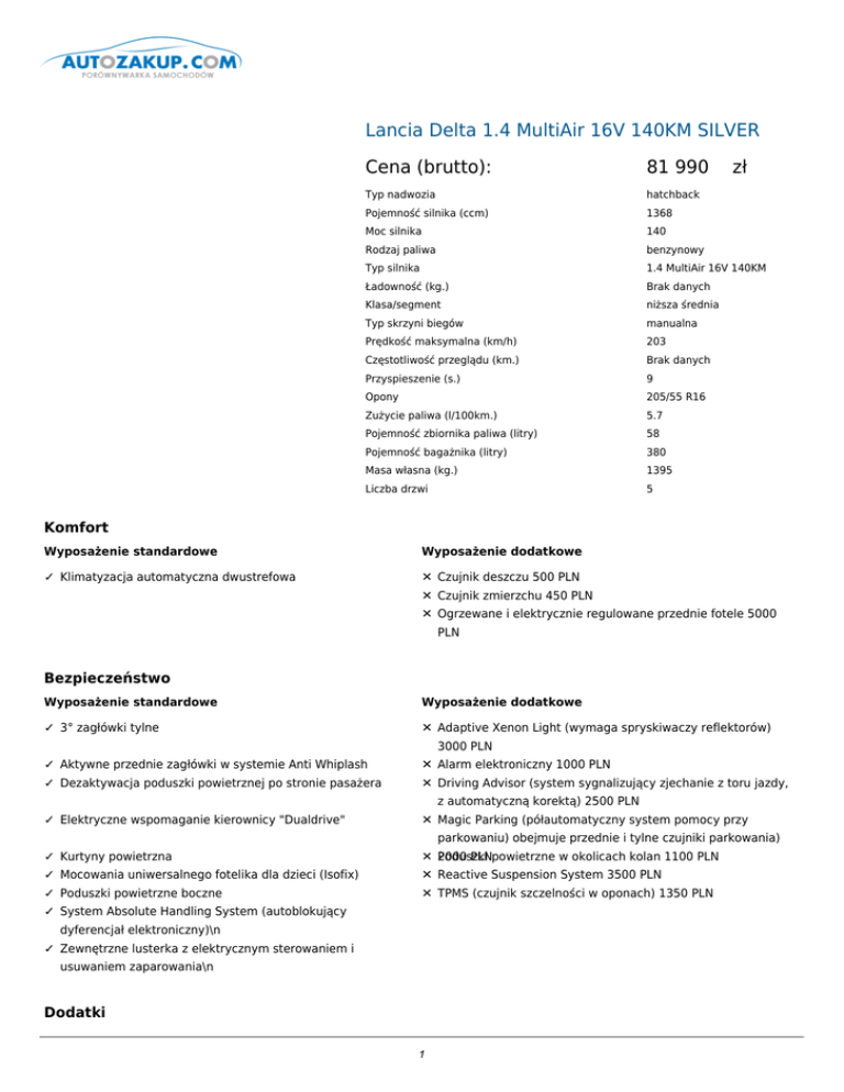 Lancia Delta 1.4 MultiAir 16V 140KM SILVER Cena (brutto): 81 990 zł Typ nadwozia hatchback Pojemność silnika (ccm) 1368 Moc silnika 140 Rodzaj paliwa benzynowy Typ silnika 1.4 MultiAir 16V 140KM Ładowność (kg.) Brak danych Klasa/segment niższa średnia Typ skrzyni biegów manualna Prędkość maksymalna (km/h) 203 Częstotliwość przeglądu (km.) Brak danych Przyspieszenie (s.) 9 Opony 205/55 R16 Zużycie paliwa (l/100km.) 5.7 Pojemność zbiornika paliwa (litry) 58 Pojemność bagażnika (litry) 380 Masa własna (kg.) 1395 Liczba drzwi 5 Komfort Wyposażenie standardowe Wyposażenie dodatkowe ✓ Klimatyzacja automatyczna dwustrefowa ✕ Czujnik deszczu 500 PLN ✕ Czujnik zmierzchu 450 PLN ✕ Ogrzewane i elektrycznie regulowane przednie fotele 5000 PLN Bezpieczeństwo Wyposażenie standardowe Wyposażenie dodatkowe ✓ 3° zagłówki tylne ✕ Adaptive Xenon Light (wymaga spryskiwaczy reflektorów) 3000 PLN ✓ Aktywne przednie zagłówki w systemie Anti Whiplash ✕ Alarm elektroniczny 1000 PLN ✓ Dezaktywacja poduszki powietrznej po stronie pasażera ✕ Driving Advisor (system sygnalizujący zjechanie z toru jazdy, ✓ Elektryczne wspomaganie kierownicy "Dualdrive" ✕ Magic Parking (półautomatyczny system pomocy przy ✓ Kurtyny powietrzna ✕ Poduszki 2000 PLNpowietrzne w okolicach kolan 1100 PLN ✓ Mocowania uniwersalnego fotelika dla dzieci (Isofix) ✕ Reactive Suspension System 3500 PLN ✓ Poduszki powietrzne boczne ✕ TPMS (czujnik szczelności w oponach) 1350 PLN z automatyczną korektą) 2500 PLN parkowaniu) obejmuje przednie i tylne czujniki parkowania) ✓ System Absolute Handling System (autoblokujący dyferencjał elektroniczny)\n ✓ Zewnętrzne lusterka z elektrycznym sterowaniem i usuwaniem zaparowania\n Dodatki 1 Wyposażenie standardowe Wyposażenie dodatkowe ✓ Adaptive Daytime Led (światła dzienne LED) + Światła ✕ 6 przycisków sterowania na kierownicy 200 PLN przeciwmgielne z funkcją doświetlania zakrętów ✓ Elektryczne otwieranie szyb przednich i tylnych ✕ Blue&MeTM z wejściem Aux-In i 8 przyciskami sterującymi na kierownicy 1200 PLN ✓ Fotel przednie z regulowaną wysokością ✕ Chromowana podwójna rura wydechowa 500 PLN ✓ Gniazdko 12 V na środkowym tunelu i w bagażniku + zestaw ✕ Cruise Control - Tempomat 1200 PLN dla palących ✓ Koła ze stopu 16" (431) z ogumieniem 205/55 ✕ Czujnik parkowania tyłem 1000 PLN ✓ Przesuwana kanapa tylna 2/3-1/3 z regulowanym oparciem ✕ Dodatkowe dywaniki 400 PLN ✓ Przesuwany podłokietnik przedni z chłodzącym schowkiem ✕ Elektrycznie otwierany dach GranLuce 4500 PLN ✓ Radio z odtwarzaczem CD i MP3 ✕ Instant Nav (radionawigacja satelitarna) 3500 PLN ✓ Regulacja odcinka lędźwiowego fotela kierowcy ✕ Koła ze stopu 17" (439/434(1)) z ogumieniem 225/45 3000 PLN ✓ Skórzane obszycie kierownicy i gałki skrzyni biegów ✕ Koła ze stopu 17" diamentowane (432/433(1)) z ogumieniem 225/45 2500 PLN ✓ Szyby Privacy ✕ Koła ze stopu 18" „Sport" diamentowane (435) z ogumieniem 225/40 Nero Opaco 3000 PLN ✓ Tapicerka z tkaniny ✕ Koło zapasowe w normalnych wymiarach 16" 800 PLN ✓ Wielofunkcyjny pilot z funkcją otwieranie/zamykanie drzwi ✕ Lakier B-colore Hard Black body Nero Cosmo, dach Nero Eclissi Lucido 9500 PLN ✕ Lakier metaliczny 2000 PLN ✕ Lakier pastelowy poza standardem 2000 PLN ✕ Lakier perłowy 2000 PLN ✕ Lusterko fotochromatyczne wsteczne 450 PLN ✕ Nadwozie B-colore (dach w czarnym matowym kolorze Nero Lava) 5500 PLN ✕ Ogrzewane przednie fotele 1100 PLN ✕ Podłokietnik tylnej kanapy 500 PLN ✕ Przystosowanie do zmieniarki CD 300 PLN ✕ System audio BOSE 2000 PLN ✕ Tapicerka se skóry i Alcantary® 3500 PLN ✕ Tapicerka ze skóry Poltrona Frau® 5000 PLN ✕ Zewnętrzne lusterka z elektrycznym sterowaniem i usuwaniem zaparowania, składane elektrycznie 400 PLN Doprecyzowanie oferty ✕ Pakiet BLACK - 6500 PLN chromowane obudowy lusterek felgi aluminiowe Sport 18" nadwozie w kolorze czarnym Nero Cosmo ✕ Pakiet HARD BLACK - 10000 PLN chromowane obudowy lusterek dach w kolorze lśniącym czarnym Nero Eclissi 2 nadwozie pokryte czarnym matowym lakierem Nero Cosmo pakiet Look Black ✕ Pakiet LOOK - 2800 PLN Chromowana podwójna rura wydechowa koła ze stopu 18" „Sport" ✕ Pakiet LOOK BLACK - 3000 PLN Chromowana podwójna rura wydechowa czarny matowy kolor Nero Opaco koła ze stopu 18" „Sport" ✕ Pakiet INFOTAINMENT - 4000 PLN Istant Nav i Blue&MeTM ✕ Pakiet SKÓRA POLTRONA FRAU® 6500 PLN tapicerka i deska rozdzielcza w skórze Frau® Kontakt: Nazwa użytkownika: admin Nazwa firmy: qqq Adres: qqq 12, 41-706 qqq1, NIP: 954 REGON: 1 Telefon: 123, 1 Fax: 1 Email: 1 www: 3