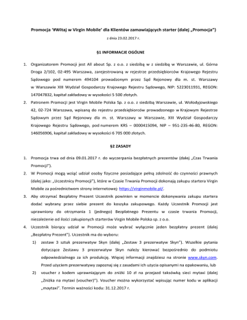 Promocja ‘#Witaj w Virgin Mobile’ dla Klientów zamawiających starter (dalej „Promocja”) z dnia 23.02.2017 r. §1 INFORMACJE OGÓLNE 1. Organizatorem Promocji jest All about Sp. z o.o. z siedzibą w z siedzibą w Warszawie, ul. Górna Droga 2/102, 02-495 Warszawa, zarejestrowaną w rejestrze przedsiębiorców Krajowego Rejestru Sądowego pod numerem 494104 prowadzonym przez Sąd Rejonowy dla m. st. Warszawy w Warszawie XIII Wydział Gospodarczy Krajowego Rejestru Sądowego, NIP: 5223011931, REGON: 147047832, kapitał zakładowy w wysokości 5 500 złotych. 2. Patronem Promocji jest Virgin Mobile Polska Sp. z o.o. z siedzibą Warszawie, ul. Wołodyjowskiego 42, 02-724 Warszawa, wpisaną do rejestru przedsiębiorców prowadzonego w Krajowym Rejestrze Sądowym przez Sąd Rejonowy dla m. st. Warszawy w Warszawie, XIII Wydział Gospodarczy Krajowego Rejestru Sądowego, pod numerem KRS – 0000415094, NIP – 951-235-46-80, REGON: 146056906, kapitał zakładowy w wysokości 6 705 000 złotych. §2 ZASADY 1. Promocja trwa od dnia 09.01.2017 r. do wyczerpania bezpłatnych prezentów (dalej „Czas Trwania Promocji”). 2. W Promocji mogą wziąć udział osoby fizyczne posiadające pełną zdolność do czynności prawnych (dalej jako: „Uczestnicy Promocji”), które w Czasie Trwania Promocji dokonają zakupu startera Virgin Mobile za pośrednictwem strony internetowej: https://virginmobile.pl/. 3. Aby otrzymać Bezpłatny Prezent Uczestnik powinien w momencie dokonywania zakupu startera dodać wybrany przez siebie prezent do koszyka zakupowego. Każdy Uczestnik Promocji jest uprawniony do otrzymania 1 (jednego) Bezpłatnego Prezentu w czasie trwania Promocji, niezależenie od ilości zakupionych starterów Virgin Mobile Polska sp. z o.o. 4. Uczestnik biorący udział w Promocji może wybrać wyłącznie jeden bezpłatny prezent (dalej „Bezpłatny Prezent”). Uczestnik ma do wyboru: 1) zestaw 3 sztuk prezerwatyw Skyn (dalej „Zestaw 3 prezerwatyw Skyn”). Wszelkie pytania dotyczące Zestawu 3 prezerwatyw Skyn należy kierować bezpośrednio do podmiotu odpowiedzialnego za ich produkcję. Więcej informacji znajdziesz na stronie www.skyn.com. Przed użyciem prezerwatywy zapoznaj się z zasadami ich użycia opisanymi na opakowaniu, lub 2) voucher z kodem uprawniającym do zniżki 10 zł na przejazd taksówką sieci mytaxi (dalej „Zniżka na mytaxi (voucher)”). Voucher można wykorzystać wpisując numer kodu w aplikacji „maytaxi”. Termin ważności kodu: 31.12.2017 r. 5. Uczestnik Promocji nie ma możliwości wymiany Bezpłatnego Prezentu na ekwiwalent pieniężny. 6. Liczba Bezpłatnych Prezentów jest ograniczona. § 3 REKLAMACJE 1. Każdy Uczestnik Promocji ma prawo złożyć reklamację dotyczącą przebiegu Promocji. Reklamacja powinna zawierać dane osoby wnoszącej reklamację [tj. imię, nazwisko, adres korespondencyjny oraz powód reklamacji z określeniem żądania reklamacyjnego, a także informację, że dotyczy Promocji „#Witaj w Virgin Mobile”. Reklamacja powinna zostać złożona: 1) na adres pocztowy: All About, ul. Czerniowiecka 9/31, 02-705 Warszawa, 2) na adres mailowy: [email protected], nie później niż w terminie 14 (czternastu) dni roboczych od zakończenia Promocji. 2. Organizator rozpatruje reklamacje w terminie nie późniejszym niż 14 (czternaście) dni roboczych od dnia ich otrzymania. Organizator poinformuje Uczestnika Promocji o sposobie rozpatrzenia reklamacji w sposób w jaki reklamacja została zgłoszona oraz na adres podany w reklamacji. 3. Powyższe postępowanie reklamacyjne nie wyłącza innych praw Uczestnika Promocji przysługujących mu na podstawie powszechnie obowiązujących przepisów prawa. § 4 POSTANOWIENIA KOŃCOWE 1. Treść Regulaminu jest dostępna w siedzibie Organizatora oraz pod adresem www [email protected]. 2. Organizator oraz Patron Promocji nie odpowiadają za użycie Bezpłatnych Zestawów w sposób niezgodny z ich przeznaczeniem. 3. Administratorami danych osobowych uczestników Promocji są Organizator i Patron. Administratorzy przetwarzają dane osobowe w celu organizacji i przeprowadzenia Promocji, w tym do wydania Nagród, rozpatrzenia ewentualnych reklamacji dotyczących przebiegu Promocji lub wyjaśnienia wątpliwości związanych z warunkami udziału w Promocji. Uczestnicy Promocji mają prawo do wglądu do swoich danych oraz do ich poprawiania. 4. Przystępując do Promocji jej Uczestnik jest zobowiązany przestrzegać postanowień niniejszego Regulaminu oraz powszechnie obowiązujących przepisów prawa. 5. Organizatorowi Promocji przysługuje prawo do zmiany Regulaminu, a także do przerwania lub zawieszenia Promocji lub do jej wcześniejszego zakończenia. W przypadku zaistnienia takiej sytuacji Organizator opublikuje informację na Stronie, ze stosownym wyprzedzeniem. Organizator zobowiązuje się, że w przypadku zmian w Regulaminie, zmiany te nie będą naruszać praw już nabytych przez Uczestników.