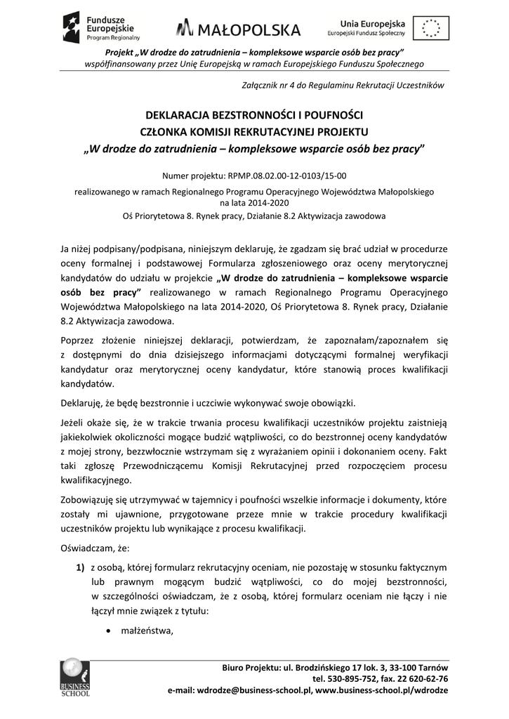 Projekt „W drodze do zatrudnienia – kompleksowe wsparcie osób bez pracy” współfinansowany przez Unię Europejską w ramach Europejskiego Funduszu Społecznego Załącznik nr 4 do Regulaminu Rekrutacji Uczestników DEKLARACJA BEZSTRONNOŚCI I POUFNOŚCI CZŁONKA KOMISJI REKRUTACYJNEJ PROJEKTU „W drodze do zatrudnienia – kompleksowe wsparcie osób bez pracy” Numer projektu: RPMP.08.02.00-12-0103/15-00 realizowanego w ramach Regionalnego Programu Operacyjnego Województwa Małopolskiego na lata 2014-2020 Oś Priorytetowa 8. Rynek pracy, Działanie 8.2 Aktywizacja zawodowa Ja niżej podpisany/podpisana, niniejszym deklaruję, że zgadzam się brać udział w procedurze oceny formalnej i podstawowej Formularza zgłoszeniowego oraz oceny merytorycznej kandydatów do udziału w projekcie „W drodze do zatrudnienia – kompleksowe wsparcie osób bez pracy” realizowanego w ramach Regionalnego Programu Operacyjnego Województwa Małopolskiego na lata 2014-2020, Oś Priorytetowa 8. Rynek pracy, Działanie 8.2 Aktywizacja zawodowa. Poprzez złożenie niniejszej deklaracji, potwierdzam, że zapoznałam/zapoznałem się z dostępnymi do dnia dzisiejszego informacjami dotyczącymi formalnej weryfikacji kandydatur oraz merytorycznej oceny kandydatur, które stanowią proces kwalifikacji kandydatów. Deklaruję, że będę bezstronnie i uczciwie wykonywać swoje obowiązki. Jeżeli okaże się, że w trakcie trwania procesu kwalifikacji uczestników projektu zaistnieją jakiekolwiek okoliczności mogące budzić wątpliwości, co do bezstronnej oceny kandydatów z mojej strony, bezzwłocznie wstrzymam się z wyrażaniem opinii i dokonaniem oceny. Fakt taki zgłoszę Przewodniczącemu Komisji Rekrutacyjnej przed rozpoczęciem procesu kwalifikacyjnego. Zobowiązuję się utrzymywać w tajemnicy i poufności wszelkie informacje i dokumenty, które zostały mi ujawnione, przygotowane przeze mnie w trakcie procedury kwalifikacji uczestników projektu lub wynikające z procesu kwalifikacji. Oświadczam, że: 1) z osobą, której formularz rekrutacyjny oceniam, nie pozostaję w stosunku faktycznym lub prawnym mogącym budzić wątpliwości, co do mojej bezstronności, w szczególności oświadczam, że z osobą, której formularz oceniam nie łączy i nie łączył mnie związek z tytułu: małżeństwa, Biuro Projektu: ul. Brodzińskiego 17 lok. 3, 33-100 Tarnów tel. 530-895-752, fax. 22 620-62-76 e-mail: [email protected], www.business-school.pl/wdrodze Projekt „W drodze do zatrudnienia – kompleksowe wsparcie osób bez pracy” współfinansowany przez Unię Europejską w ramach Europejskiego Funduszu Społecznego pokrewieństwa lub powinowactwa (w linii prostej albo w linii bocznej do drugiego stopnia), i/lub przysposobienia, opieki lub kurateli. W razie zaistnienia okoliczności opisanej wyżej zobowiązuję się do wyłączenia się od oceny formularza. Zobowiązuję się nie ujawniać informacji związanych z oceną formularza oraz do tego, że dołożę należytej staranności dla zapewnienia, aby informacje dotyczące ocenianego przeze mnie formularza nie zostały przekazane osobom nieuprawnionym. 2) Przed upływem 3 lat do daty wszczęcia procedury konkursowej nie pozostawałem/łam w stosunku pracy lub zlecenia z ww. osobami. …………………………………………………………… Miejscowość i data ………………………………………………………… Imię i Nazwisko Biuro Projektu: ul. Brodzińskiego 17 lok. 3, 33-100 Tarnów tel. 530-895-752, fax. 22 620-62-76 e-mail: [email protected], www.business-school.pl/wdrodze