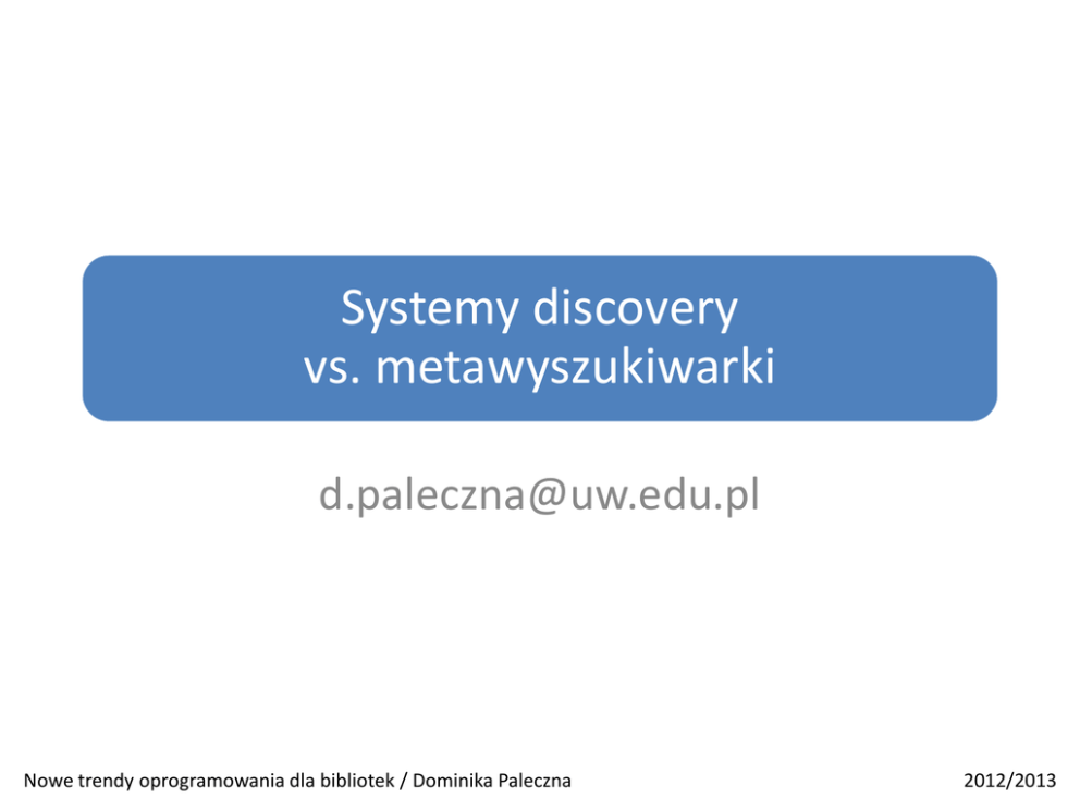 Systemy discovery vs. metawyszukiwarki [email protected] Nowe trendy oprogramowania dla bibliotek / Dominika Paleczna 2012/2013 Terminologia • Discovery systems • Discovery and delivery systems • Search and discovery systems Nowe trendy oprogramowania dla bibliotek / Dominika Paleczna 2012/2013 Jak to będzie po polsku? Nowe trendy oprogramowania dla bibliotek / Dominika Paleczna 2012/2013 Terminologia • Systemy do odkrywania zasobów? • Wyszukiwarki (biblioteczne)? • Systemy discovery? • Multiwyszukiwarki? Nowe trendy oprogramowania dla bibliotek / Dominika Paleczna 2012/2013 Terminologia System discovery Metawyszukiwarka Nowe trendy oprogramowania dla bibliotek / Dominika Paleczna 2012/2013 Metawyszukiwarka vs. System discovery • Metawyszukiwarka – odpytuje serwery w czasie rzeczywistym – Długi czas oczekiwania na wyniki – Brak wyników, jeżeli serwer nie odpowiada w danej chwili • System discovery – przeszukuje indeks (jak Google) Nowe trendy oprogramowania dla bibliotek / Dominika Paleczna 2012/2013 Metawyszukiwarki • KaRo – Katalog Rozproszony Bibliotek Polskich • Fidkar – Bazy Biblioteki Narodowej • MetaLib – Mazowiecki System Informacji Bibliotecznej • EHIS Nowe trendy oprogramowania dla bibliotek / Dominika Paleczna 2012/2013 Systemy discovery Nowe trendy oprogramowania dla bibliotek / Dominika Paleczna 2012/2013 System discovery Pozwala na przeszukiwanie jednocześnie: • katalogu • e-zasobów: – subskrybowanych baz elektronicznych – baz i czasopism Open Access – bibliotek i repozytoriów cyfrowych Nowe trendy oprogramowania dla bibliotek / Dominika Paleczna 2012/2013 System discovery • • • • • • • • • szybkie i łatwe w użyciu jeden interfejs do wszystkich zasobów zawężanie fasetowe sortowanie wg relewancji „Czy chodziło Ci o…?” kanały RSS e-półka interfejs mobilny FRBR (tylko w Primo) Nowe trendy oprogramowania dla bibliotek / Dominika Paleczna 2012/2013 Systemy discovery • EBSCO Discovery Service (EDS) – BUW (konieczność logowania) – University of Georgia Library • Primo – Biblioteka Główna Politechniki Śląskiej – Die Sächsische Landesbibliothek – Staats- und Universitätsbibliothek Dresden (SLUB) • Summon – Biblioteka Uniwersytecka w Poznaniu – Queen’s University Library • VuFind – Western Michigan University Library Nowe trendy oprogramowania dla bibliotek / Dominika Paleczna 2012/2013