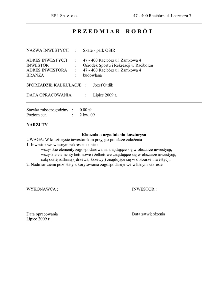 Płyta Skate-park przedmiar V2 - Ośrodek Sportu i Rekreacji w