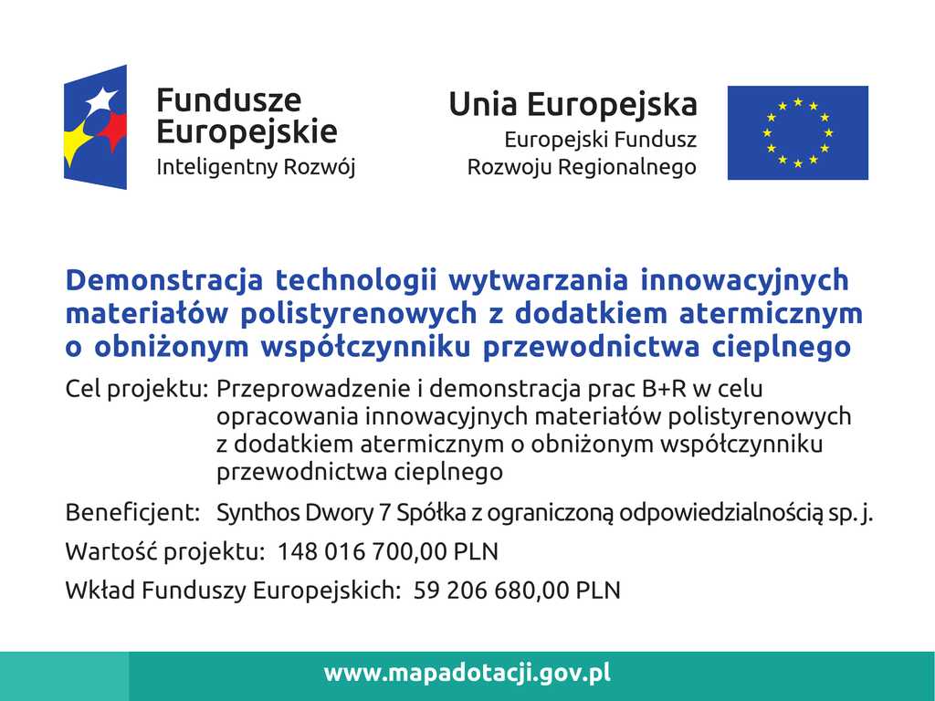Demonstracja technologii wytwarzania innowacyjnych materiałów polistyrenowych z dodatkiem atermicznym o obniżonym współczynniku przewodnictwa cieplnego Cel projektu: Przeprowadzenie i demonstracja prac B+R w celu opracowania innowacyjnych materiałów polistyrenowych z dodatkiem atermicznym o obniżonym współczynniku przewodnictwa cieplnego Beneficjent: Synthos Dwory 7 Spółka z ograniczoną odpowiedzialnością sp. j. Wartość projektu: 148 016 700,00 PLN Wkład Funduszy Europejskich: 59 206 680,00 PLN www.mapadotacji.gov.pl Opracowanie innowacyjnych materiałów zwiększających funkcjonalność opon samochodowych Cel projektu: Przeprowadzenie prac B+R w celu opracowania innowacyjnego w skali świata produktu poprawiającego funkcjonalność opon samochodowych Beneficjent: SYNTHOS S.A. Wartość projektu: 28 647 034,41 PLN Wkład Funduszy Europejskich: 12 069 709,36 PLN www.mapadotacji.gov.pl
