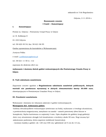 załącznik nr 3 do Regulaminu Gdynia, 2.11.2016 r. Rozeznanie cenowe I Część – Zamawiający I. Zamawiający: Powiat m. Gdynia – Powiatowy Urząd Pracy w Gdyni ul. H. Kołłątaja 8 81-332 Gdynia tel: 58 620 49 54; fax: 58 621 06 95 Osoba uprawniona do kontaktów z Wykonawcami: Justyna Pałka e-mail: [email protected] tel. 58 621 11 50 w. 112 zaprasza do złożenia ofert na: wykonanie i dostawę dwóch gablot wolnostojących dla Powiatowego Urzędu Pracy w Gdyni. II. Tryb udzielania zamówienia Zapytanie cenowe zgodnie z Regulaminem udzielania zamówień publicznych, których wartość nie przekracza wyrażonej w złotych równowartości kwoty 30.000 euro, obowiązującym w Powiatowym Urzędzie Pracy w Gdyni. III. Przedmiot zamówienia Wykonanie i dostawa we własnym zakresie 2 gablot wolnostojących. Wymagania dot. wykonania gablot: Gabloty dwuskrzydłowe wolnostojące (otwierane na boki), wykonane z trwałego aluminium, z powierzchnią magnetyczną, zamykane na zamki – zamek patentowy (dwa klucze w komplecie). Szyba hartowana co najmniej 4 mm. Opis słupków do gabloty (nogi gabloty): dwie rury aluminiowe okrągłe lub kwadratowe o średnicy około 50 mm. Nogi muszą być zakończone podstawą, która zapewni stabilność konstrukcji. - wymiary każdej z gablot: ok: 120 cm/100 cm/ głębokość od 5 cm do 13 cm, - wymiary każdej z gablot z słupkami (nogi): wysokość łączna ok 200 cm/ szerokość ok 120 cm. 1. Wykonawca zobowiązany jest do współpracy z Zamawiającym w kwestii opracowania projektu gablot wolnostojących. Projekt musi zostać zaakceptowana przez Zamawiającego. 2. Wykonawca przygotuje minimum 3 projekty graficzne każdego z elementów gabloty. 3. Projekty należy dostarczyć na adres mailowy [email protected] w wersji podglądowej w formacie PDF lub JPG. IV. Wymagane dokumenty 1. Wypełniony Formularz oferty – wzór stanowi załącznik nr 1 do niniejszego zapytania. 2. Oferty niespełniające wymagań, o których mowa wyżej, nie zostaną rozpatrzone. V. Sposób przygotowania oferty 1. Ofertę należy sporządzić wg Formularza oferty, którego wzór stanowi załącznik nr 1 do niniejszego zapytania. 2. Wykonawca może złożyć tylko jedną ofertę. Złożenie większej liczby ofert spowoduje odrzucenie wszystkich ofert złożonych przez danego Wykonawcę. 3. Oferta Wykonawcy wraz z załącznikami musi zostać podpisana przez Wykonawcę lub osobę upoważnioną przez Wykonawcę w miejscu do tego wskazanym. Poprawki powinny być naniesione poprzez skreślenie dotychczasowej treści i wpisanie nowej, z zachowaniem czytelności błędnego zapisu oraz podpisane przez Wykonawcę. 4. Ofertę należy sporządzić w formie pisemnej, w języku polskiem. VI. Kryteria wyboru oferty 1. Wybór najkorzystniejszej oferty dokonany będzie w oparciu o następujące kryterium: cena brutto VII. Miejsce oraz termin składania ofert: 1. Ofertę z dopiskiem: „Wykonanie i dostawa gablot wolnostojących” należy złożyć w siedzibie Zamawiającego: Powiatowy Urząd Pracy w Gdyni, ul. Kołłątaja 8, 81-332 Gdynia, w pokoju nr 101 kancelaria (I piętro) od poniedziałku do piątku od 8.0015.00. 2. Termin składania ofert upływa dnia 17.11.2016 r. o godz. 13.30. Liczy się data i godzina wpływu do Urzędu. 3. Oferty złożone po terminie zostaną odrzucone. VIII. Uwagi końcowe 1. Niezwłocznie po zakończeniu postępowania, Zamawiający zamieści na stronie internetowej informacje o wyniku przeprowadzonego rozeznania cenowego, w której zamieszczone zostaną dane wykonawców, którzy ubiegali się o udzielenie zamówienia oraz oferowane przez nich ceny. 2. Wykonawcy nie przysługują środki ochrony prawnej określone w przepisach ustawy z dnia 29 stycznia 2004r. Prawo zamówień publicznych (tekst jednolity Dz. U. z 2015r., poz. 2164 z poźn. zm.).