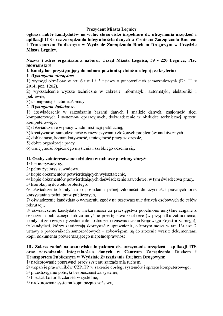 Prezydent Miasta Legnicy ogłasza nabór kandydatów na wolne stanowisko inspektora ds. utrzymania urządzeń i aplikacji ITS oraz zarządzania integralnością danych w Centrum Zarządzania Ruchem i Transportem Publicznym w Wydziale Zarządzania Ruchem Drogowym w Urzędzie Miasta Legnicy. Nazwa i adres organizatora naboru: Urząd Miasta Legnica, 59 - 220 Legnica, Plac Słowiański 8 I. Kandydaci przystępujący do naboru powinni spełniać następujące kryteria: 1. Wymagania niezbędne: 1) wymogi określone w art. 6 ust 1 i 3 ustawy o pracownikach samorządowych (Dz. U. z 2014, poz. 1202), 2) wykształcenie wyższe techniczne w zakresie informatyki, automatyki, elektroniki i pokrewne, 3) co najmniej 3-letni staż pracy. 2. Wymagania dodatkowe: 1) doświadczenie w zarządzaniu bazami danych i analizie danych, znajomość sieci komputerowych i systemów operacyjnych, doświadczenie w obsłudze technicznej sprzętu komputerowego, 2) doświadczenie w pracy w administracji publicznej, 3) kreatywność, samodzielność w rozwiązywaniu złożonych problemów analitycznych, 4) dokładność, komunikatywność, umiejętność pracy w zespole, 5) dobra organizacja pracy, 6) umiejętność logicznego myślenia i szybkiego uczenia się. . II. Osoby zainteresowane udziałem w naborze powinny złożyć: 1/ list motywacyjny, 2/ pełny życiorys zawodowy, 3/ kopie dokumentów potwierdzających wykształcenie, 4/ kopie dokumentów potwierdzających doświadczenie zawodowe, w tym świadectwa pracy, 5/ kserokopię dowodu osobistego, 6/ oświadczenie kandydata o posiadaniu pełnej zdolności do czynności prawnych oraz korzystania z pełni praw publicznych, 7/ oświadczenie kandydata o wyrażeniu zgody na przetwarzanie danych osobowych do celów rekrutacji, 8/ oświadczenie kandydata o niekaralności za przestępstwa popełnione umyślnie ścigane z oskarżenia publicznego lub za umyślne przestępstwa skarbowe (w przypadku zatrudnienia, kandydat zobowiązany zostanie do dostarczenia zaświadczenia Krajowego Rejestru Karnego), 9/ kandydaci, którzy zamierzają skorzystać z uprawnienia, o którym mowa w art. 13a ust. 2 ustawy o pracownikach samorządowych – zobowiązani są do złożenia wraz z dokumentami kopii dokumentu potwierdzającego niepełnosprawność. III. Zakres zadań na stanowisku inspektora ds. utrzymania urządzeń i aplikacji ITS oraz zarządzania integralnością danych w Centrum Zarządzania Ruchem i Transportem Publicznym w Wydziale Zarządzania Ruchem Drogowym: 1/ nadzorowanie poprawnej pracy systemu zarządzania ruchem, 2/ wsparcie pracowników CZRiTP w zakresie obsługi systemów i sprzętu komputerowego, 3/ przestrzeganie polityki bezpieczeństwa systemu, 4/ bieżąca kontrola zdarzeń w systemie, 5/ nadzorowanie systemu kopii bezpieczeństwa, 6/ zarządzanie repozytorium danych ZSZRiTP, dbanie o jego spójność i bezpieczeństwo, 7/ wykonywanie zestawień i pozyskiwanie danych z systemu zarządzania ruchem na potrzeby pracowników CZRiTP oraz UM, 8/ usuwanie na bieżąco usterek sprzętu i oprogramowania w podstawowym zakresie, 9/ nadzorowanie poprawności realizacji umów gwarancyjnych i serwisowych, 10/ planowanie i realizacja przeglądów technicznych systemu, 11/ planowanie zakupów w zakresie IT, i CCTV dla ZSZRiTP, 12/ prowadzenie rejestrów (środków trwałych IT, usterek i napraw, licencji, zdarzeń systemowych), 13/ ścisła współpraca z Referatem Informatyki w zakresie systemów łączności i Centrum Przetwarzania Danych oraz innych realizowanych wspólnie zadań. IV. Warunki pracy na stanowisku inspektora ds. utrzymania urządzeń i aplikacji ITS oraz zarządzania integralnością danych w Centrum Zarządzania Ruchem i Transportem Publicznym w Wydziale Zarządzania Ruchem Drogowym: 1/ praca w warunkach biurowych oraz związana z wykorzystaniem komputera i innych urządzeń biurowych, 2/ stanowisko objęte naborem znajduje się w pomieszczeniu na II piętrze w budynku przy ul. Mickiewicza 2, w którym nie ma windy. Wskaźnik zatrudnienia osób niepełnosprawnych w Urzędzie Miasta Legnicy, w rozumieniu przepisów o rehabilitacji zawodowej i społecznej oraz zatrudnianiu osób niepełnosprawnych za czerwiec 2015 roku wynosi powyżej 6%. Oferty należy składać w zamkniętych kopertach z dopiskiem "Nabór na stanowisko inspektora ds. utrzymania urządzeń i aplikacji ITS oraz zarządzania integralnością danych w Centrum Zarządzania Ruchem i Transportem Publicznym” do dnia 24 lipca 2015r. w Kancelarii Urzędu Miasta Legnicy przy pl. Słowiańskim 8 w Legnicy. Oferty złożone po terminie nie będą rozpatrywane. Na rozmowy kwalifikacyjne zostanie zaproszonych nie więcej niż pięciu najlepszych kandydatów spełniających wymagania niezbędne oraz w największym stopniu wymagania dodatkowe. Oferty kandydatów po trzech miesiącach od dnia ogłoszenia wyniku naboru są niszczone.