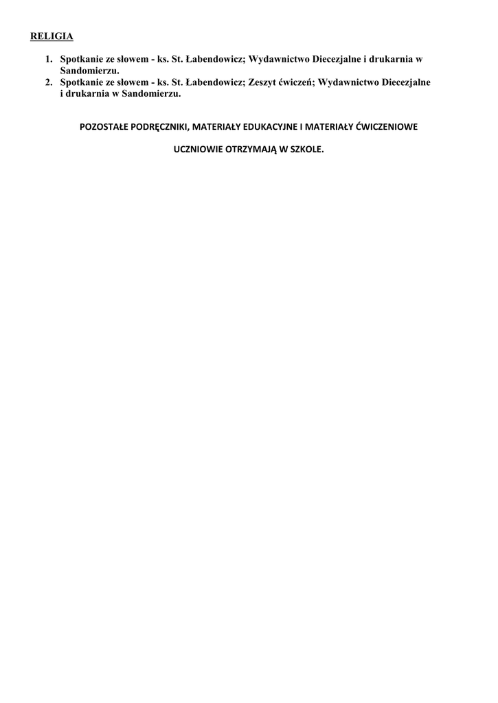 RELIGIA 1. Spotkanie ze słowem - ks. St. Łabendowicz; Wydawnictwo Diecezjalne i drukarnia w Sandomierzu. 2. Spotkanie ze słowem - ks. St. Łabendowicz; Zeszyt ćwiczeń; Wydawnictwo Diecezjalne i drukarnia w Sandomierzu. POZOSTAŁE PODRĘCZNIKI, MATERIAŁY EDUKACYJNE I MATERIAŁY ĆWICZENIOWE UCZNIOWIE OTRZYMAJĄ W SZKOLE.