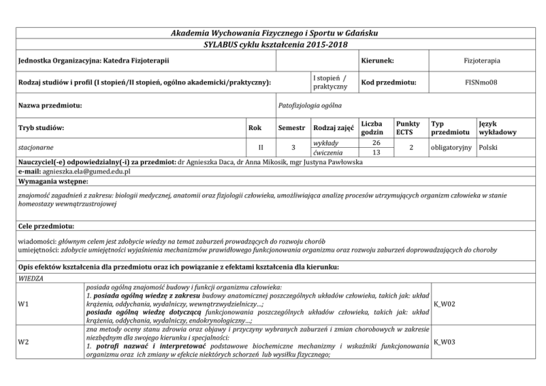 Akademia Wychowania Fizycznego i Sportu w Gdańsku SYLABUS cyklu kształcenia 2015-2018 Jednostka Organizacyjna: Katedra Fizjoterapii I stopień / praktyczny Rodzaj studiów i profil (I stopień/II stopień, ogólno akademicki/praktyczny): Fizjoterapia Kod przedmiotu: FISNmo08 Patofizjologia ogólna Nazwa przedmiotu: Tryb studiów: Kierunek: Rok Semestr Rodzaj zajęć Liczba godzin wykłady ćwiczenia Nauczyciel(-e) odpowiedzialny(-i) za przedmiot: dr Agnieszka Daca, dr Anna Mikosik, mgr Justyna Pawłowska e-mail: [email protected] Wymagania wstępne: stacjonarne II 3 26 13 Punkty ECTS 2 Typ przedmiotu Język wykładowy obligatoryjny Polski znajomość zagadnień z zakresu: biologii medycznej, anatomii oraz fizjologii człowieka, umożliwiająca analizę procesów utrzymujących organizm człowieka w stanie homeostazy wewnątrzustrojowej Cele przedmiotu: wiadomości: głównym celem jest zdobycie wiedzy na temat zaburzeń prowadzących do rozwoju chorób umiejętności: zdobycie umiejętności wyjaśnienia mechanizmów prawidłowego funkcjonowania organizmu oraz rozwoju zaburzeń doprowadzających do choroby Opis efektów kształcenia dla przedmiotu oraz ich powiązanie z efektami kształcenia dla kierunku: WIEDZA W1 W2 posiada ogólną znajomość budowy i funkcji organizmu człowieka: 1. posiada ogólną wiedzę z zakresu budowy anatomicznej poszczególnych układów człowieka, takich jak: układ krążenia, oddychania, wydalniczy, wewnątrzwydzielniczy…; K_W02 posiada ogólną wiedzę dotyczącą funkcjonowania poszczególnych układów człowieka, takich jak: układ krążenia, oddychania, wydalniczy, endokrynologiczny…; zna metody oceny stanu zdrowia oraz objawy i przyczyny wybranych zaburzeń i zmian chorobowych w zakresie niezbędnym dla swojego kierunku i specjalności: K_W03 1. potrafi nazwać i interpretować podstawowe biochemiczne mechanizmy i wskaźniki funkcjonowania organizmu oraz ich zmiany w efekcie niektórych schorzeń lub wysiłku fizycznego; 2. zna podstawowe procesy metaboliczne na poziomie komórkowym, narządowym, ustrojowym, w tym zjawiska regulacji hormonalnej, reprodukcji i procesów starzenia się ustroju oraz ich zmian pod wpływem wysiłku fizycznego lub w efekcie niektórych schorzeń w zakresie niezbędnym dla swojego kierunku; 3. zna podstawowe reakcje człowieka na chorobę w zakresie niezbędnym dla swojego kierunku; 4. zna podstawowe pojęcia z zakresu patologii ogólnej i głównych zmian patofizjologicznych w stopniu ułatwiającym zrozumienie istoty zmian patologicznych w różnych schorzeniach dla racjonalnego planowania procesu usprawniania; 5. zna metody opisu i interpretacji podstawowych jednostek i zespołów chorobowych w stopniu umożliwiającym racjonalne stosowanie środków fizjoterapii i planowanie procesu rehabilitacji; 6. posiada wiedzę z zakresu zmian patologicznych w różnych schorzeniach oraz zaburzeniach strukturalnych wywołanych chorobą, urazem, lub inną formą niepełnosprawności; UMIEJĘTNOŚCI U1 potrafi podjąć działania diagnostyczne/profilaktyczne/pielęgnacyjne/terapeutyczne/edukacyjne odpowiadające potrzebom jednostek/grup społecznych właściwe dla swojego kierunku i specjalności studiów K_U05 1. potrafi interpretować wyniki podstawowych badań klinicznych; 2. potrafi rozpoznać stany zagrożenia życia; KOMPETENCJE K1 K2 K3 rozumie potrzebę uczenia się przez całe życie: 1. rozumie potrzebę uczenia się przez całe życie; potrafi pracować w grupie, przyjmując w niej różne role: 1. potrafi brać odpowiedzialności za pracę własną; 2. potrafi przyjąć odpowiedzialności za udział w decyzjach; 3. potrafi pracować w zespole jest świadomy potrzeby ustawicznego doskonalenia zawodowego: 1. uznaje konieczność ustawicznego kształcenia się i rozwoju zawodowego; K_K01 K_K02 K_K06 Kryteria i metody oceny osiągniętych efektów kształcenia: Zaliczenie na ocenę testu pisemnego (sprawdzian wiedzy) Zaliczenie na ocenę – kolokwium ustne Aby uzyskać zaliczenie przedmiotu na ocenę dostateczną student musi osiągnąć wszystkie wymienione w sylabusie efekty kształcenia Metody i formy realizacji przedmiotu: Wykład (przekaz słowny i prezentacja multimedialna) Ćwiczenia - w trakcie ćwiczeń odbywa się dyskusja oraz praca studentów pod kierunkiem osoby prowadzącej zajęcia. Treści kształcenia: Wykłady: 1. Podstawowe pojęcia patofizjologiczne. Wprowadzenie do zapaleń. 2. Gospodarka wodno-elektrolitowa. 3. Gospodarka kwasowo-zasadowa. 4. Gospodarka wapniowo-fosforanowa. 5. Choroby układu ruchu. 6. Choroby układu sercowo-naczyniowego. Miażdżyca 7. Choroby układu nerwowego. 8. Wtórne niedobory odporności. Zaburzenia proliferacji komórek. 9. Choroby układu wydalniczego. 10. Choroby układu oddechowego. 11. Gospodarka węglowodanowa. 12. Zaburzenia endokrynologiczne. 13. Choroby układu pokarmowego. 14. Choroby genetyczne. Ćwiczenia: 1. Choroby układu ruchu I. 2. Choroby układu ruchu II + osteoporoza. 3. Nadwrażliwość i alergie. 4. Choroby układu sercowo-naczyniowego. 5. Miażdżyca 6. Patofizjologia układu nerwowego. 7. Zaburzenia układu krzepnięcia. 8. Zaburzenia układu biało- i czerwonokrwinkowego. 9. Patofizjologia chorób nerek. 10. Patofizjologia układu oddechowego. 11. Autoimmunizacja. 12. Elementy endokrynologii. 13. Choroby układu pokarmowego. 14. Nowotwory. Forma zaliczenia: Literatura: Podstawowa: brak Uzupełniająca: Ivan Damjanov „Patofizjologia” zaliczenie z oceną Bilans punktów ECTS (1 pkt ECTS – 25-30 godz. pracy studenta): Aktywność Udział w wykładach Samodzielne studiowanie tematyki wykładów Udział w ćwiczeniach Przygotowanie się do ćwiczeń Konsultacje Obciążenie studenta 26 godz. 11 godz. 13 godz. 10 godz. Całkowite obciążenie pracą studenta Punkty ECTS za przedmiot 60 godz. 2 ECTS