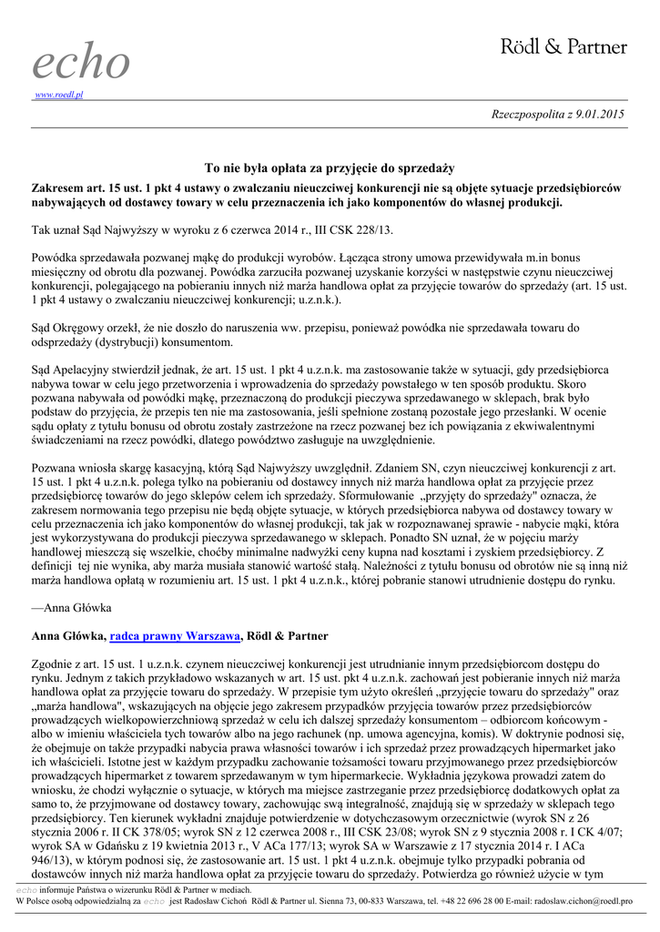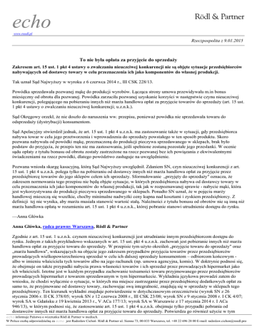 echo www.roedl.pl Rzeczpospolita z 9.01.2015 To nie była opłata za przyjęcie do sprzedaży Zakresem art. 15 ust. 1 pkt 4 ustawy o zwalczaniu nieuczciwej konkurencji nie są objęte sytuacje przedsiębiorców nabywających od dostawcy towary w celu przeznaczenia ich jako komponentów do własnej produkcji. Tak uznał Sąd Najwyższy w wyroku z 6 czerwca 2014 r., III CSK 228/13. Powódka sprzedawała pozwanej mąkę do produkcji wyrobów. Łącząca strony umowa przewidywała m.in bonus miesięczny od obrotu dla pozwanej. Powódka zarzuciła pozwanej uzyskanie korzyści w następstwie czynu nieuczciwej konkurencji, polegającego na pobieraniu innych niż marża handlowa opłat za przyjęcie towarów do sprzedaży (art. 15 ust. 1 pkt 4 ustawy o zwalczaniu nieuczciwej konkurencji; u.z.n.k.). Sąd Okręgowy orzekł, że nie doszło do naruszenia ww. przepisu, ponieważ powódka nie sprzedawała towaru do odsprzedaży (dystrybucji) konsumentom. Sąd Apelacyjny stwierdził jednak, że art. 15 ust. 1 pkt 4 u.z.n.k. ma zastosowanie także w sytuacji, gdy przedsiębiorca nabywa towar w celu jego przetworzenia i wprowadzenia do sprzedaży powstałego w ten sposób produktu. Skoro pozwana nabywała od powódki mąkę, przeznaczoną do produkcji pieczywa sprzedawanego w sklepach, brak było podstaw do przyjęcia, że przepis ten nie ma zastosowania, jeśli spełnione zostaną pozostałe jego przesłanki. W ocenie sądu opłaty z tytułu bonusu od obrotu zostały zastrzeżone na rzecz pozwanej bez ich powiązania z ekwiwalentnymi świadczeniami na rzecz powódki, dlatego powództwo zasługuje na uwzględnienie. Pozwana wniosła skargę kasacyjną, którą Sąd Najwyższy uwzględnił. Zdaniem SN, czyn nieuczciwej konkurencji z art. 15 ust. 1 pkt 4 u.z.n.k. polega tylko na pobieraniu od dostawcy innych niż marża handlowa opłat za przyjęcie przez przedsiębiorcę towarów do jego sklepów celem ich sprzedaży. Sformułowanie „przyjęty do sprzedaży" oznacza, że zakresem normowania tego przepisu nie będą objęte sytuacje, w których przedsiębiorca nabywa od dostawcy towary w celu przeznaczenia ich jako komponentów do własnej produkcji, tak jak w rozpoznawanej sprawie - nabycie mąki, która jest wykorzystywana do produkcji pieczywa sprzedawanego w sklepach. Ponadto SN uznał, że w pojęciu marży handlowej mieszczą się wszelkie, choćby minimalne nadwyżki ceny kupna nad kosztami i zyskiem przedsiębiorcy. Z definicji tej nie wynika, aby marża musiała stanowić wartość stałą. Należności z tytułu bonusu od obrotów nie są inną niż marża handlowa opłatą w rozumieniu art. 15 ust. 1 pkt 4 u.z.n.k., której pobranie stanowi utrudnienie dostępu do rynku. —Anna Główka Anna Główka, radca prawny Warszawa, Rödl & Partner Zgodnie z art. 15 ust. 1 u.z.n.k. czynem nieuczciwej konkurencji jest utrudnianie innym przedsiębiorcom dostępu do rynku. Jednym z takich przykładowo wskazanych w art. 15 ust. pkt 4 u.z.n.k. zachowań jest pobieranie innych niż marża handlowa opłat za przyjęcie towaru do sprzedaży. W przepisie tym użyto określeń „przyjęcie towaru do sprzedaży" oraz „marża handlowa", wskazujących na objęcie jego zakresem przypadków przyjęcia towarów przez przedsiębiorców prowadzących wielkopowierzchniową sprzedaż w celu ich dalszej sprzedaży konsumentom – odbiorcom końcowym albo w imieniu właściciela tych towarów albo na jego rachunek (np. umowa agencyjna, komis). W doktrynie podnosi się, że obejmuje on także przypadki nabycia prawa własności towarów i ich sprzedaż przez prowadzących hipermarket jako ich właścicieli. Istotne jest w każdym przypadku zachowanie tożsamości towaru przyjmowanego przez przedsiębiorców prowadzących hipermarket z towarem sprzedawanym w tym hipermarkecie. Wykładnia językowa prowadzi zatem do wniosku, że chodzi wyłącznie o sytuacje, w których ma miejsce zastrzeganie przez przedsiębiorcę dodatkowych opłat za samo to, że przyjmowane od dostawcy towary, zachowując swą integralność, znajdują się w sprzedaży w sklepach tego przedsiębiorcy. Ten kierunek wykładni znajduje potwierdzenie w dotychczasowym orzecznictwie (wyrok SN z 26 stycznia 2006 r. II CK 378/05; wyrok SN z 12 czerwca 2008 r., III CSK 23/08; wyrok SN z 9 stycznia 2008 r. I CK 4/07; wyrok SA w Gdańsku z 19 kwietnia 2013 r., V ACa 177/13; wyrok SA w Warszawie z 17 stycznia 2014 r. I ACa 946/13), w którym podnosi się, że zastosowanie art. 15 ust. 1 pkt 4 u.z.n.k. obejmuje tylko przypadki pobrania od dostawców innych niż marża handlowa opłat za przyjęcie towaru do sprzedaży. Potwierdza go również użycie w tym echo informuje Państwa o wizerunku Rödl & Partner w mediach. W Polsce osobą odpowiedzialną za echo jest Radosław Cichoń Rödl & Partner ul. Sienna 73, 00-833 Warszawa, tel. +48 22 696 28 00 E-mail: [email protected] samym przepisie określenia „marża handlowa", która według art. 3 ust. 1 pkt 6 ustawy o cenach oznacza różnicę między ceną płaconą przez kupującego a ceną uprzednio zapłaconą przez przedsiębiorcę wynikającą z kosztów i zysku przedsiębiorcy; marża handlowa może być wyrażona kwotowo lub w procentach. Chodzi zatem zawsze o różnicę ceny za ten sam towar. Jak zauważył SA w Poznaniu w wyroku z 11 września 2014 r., I ACa 589/14, dla oceny, czy świadczenia pieniężne uiszczane przez dostawcę mają charakter niedozwolonych opłat za przyjęcie towaru do sprzedaży w rozumieniu art. 15 ust. 1 pkt 4 u.z.n.k., nie mają decydującego znaczenia zarówno forma zastrzeżenia tego rodzaju świadczeń, jak i użyte dla ich określenia nazewnictwo. W uchwale NSA z 25 czerwca 2012 r., I FPS 2/12, przyjęto, że wypłata kontrahentowi bonusu warunkowego (premii pieniężnej) z tytułu osiągnięcia określonej wielkości sprzedaży stanowi rabat w rozumieniu ustawy o podatku od towarów i usług, zmniejszający podstawę opodatkowania. Premia pieniężna za dany okres sprowadza