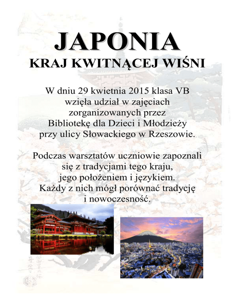 JAPONIA KRAJ KWITNĄCEJ WIŚNI W dniu 29 kwietnia 2015 klasa VB wzięła udział w zajęciach zorganizowanych przez Bibliotekę dla Dzieci i Młodzieży przy ulicy Słowackiego w Rzeszowie. Podczas warsztatów uczniowie zapoznali się z tradycjami tego kraju, jego położeniem i językiem. Każdy z nich mógł porównać tradycję i nowoczesność. Dotknąć prawdziwego, samurajskiego miecza. Zobaczyć zdjęcia najdziwniejszych potraw serwowanych w Tokio. Na koniec wszyscy wykonali mnóstwo kolorowy motyli metodą Origami. Zajęcia były elementem realizowanego w szkole innowacyjnego programu „Abecadło Mistrza”. Zorganizowane zostały przez Panie Katarzynę Chmiel i Annę Pasek-Depę.