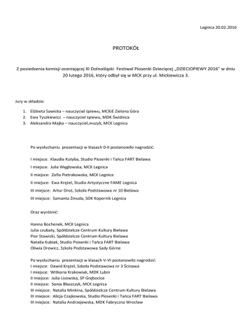 Legnica 20.02.2016 PROTOKÓŁ Z posiedze ia ko isji o e iają ej XI Dol ośląski Festiwal Piose ki Dzie ię ej „DZIECIOPIEWY 20 lutego 6, który od ył się w MCK przy ul. Mi kiewi za . Jury w składzie: 1. Elż ieta Sawi ka – au zy iel śpiewu, MCKiE Zielona Góra 2. Ewa Tyszkiewicz – au zy iel śpiewu, MDK Świd i a 3. Aleksandra Majka – nauczyciel,muzyk, MCK Legnica Po wysłu ha iu preze ta ji w klasa h 0-II posta owiło agrodzić: I miejsce: Klaudia Kuty a, Studio Piose ki i Tań a FART Bielawa I miejsce: Julia Węgłowska, MCK Leg i a II miejsce: Zofia Pietrakowska, MCK Legnica II iejs e: Ewa Krężel, Studio Artysty z e FAME Leg i a III miejsce: Artur Droś, Szkoła Podstawowa r Bielawa III miejsce: Sa a ta Ż uda, SDK Koper ik Leg i a Oraz wyróż ić: Hanna Bochenek, MCK Legnica Julia zu aty, Spółdziel ze Ce tru Kultury Bielawa Pior Stawi ki, Spółdziel ze Ce tru Kultury Bielawa Natalia Ku iak, Studio Piose ki i Tań a FART Bielawa Oliwia Drewi z, Szkoła Podstawowa Sady Gór e Po wysłu ha iu preze ta ji w klasa h V-VI posta owiło agrodzić: I iejs e: Dawid Krężel, Szkoła Podstawowa r Ś i awa I miejsce: Witkoria Krakowiak, MDK Lubin II iejs e: Julia Lisowska, SP Grę o i e II iejs e: So ia Błasz zyk, MCK Leg i a III miejs e: Natalia Mi ki a, Spółdziel ze Ce tru Kultury Bielawa III iejs e: Ali ja Czajkowska, Studio Piose ki i Tań a FART Bielawa III iejs e: Natalia A drzejewska, MDK Fa ry z a Wro ław 6” w d iu Oraz wyróż ić: Wiktoria Michalska, MCK Legnica Matylda Kartkowska, MCK Legnica Liwia O odyńska, MDK Śród ieś ie Wro ław Malwina Bosek, Studio Artystyczne FAME Legnica Małgorzata Petry iak, Szkoła Podstawowa r Bielawa Laura Bień, MCK Leg i a A elia Wilk, Szkoła Podstawowa r Leg i a Wero ika Pawlikowska, Szkoła Podstawowa r Ś i awa Na ty protokół zakoń zo o.
