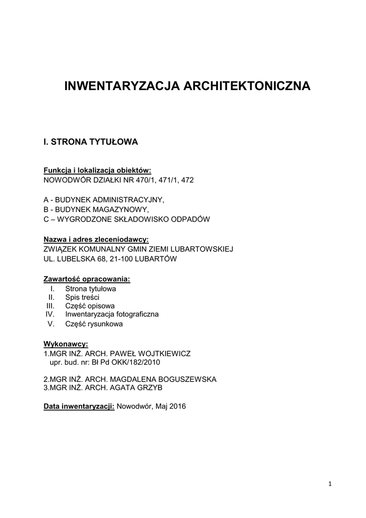 INWENTARYZACJA ARCHITEKTONICZNA I. STRONA TYTUŁOWA Funkcja i lokalizacja obiektów: NOWODWÓR DZIAŁKI NR 470/1, 471/1, 472 A - BUDYNEK ADMINISTRACYJNY, B - BUDYNEK MAGAZYNOWY, C – WYGRODZONE SKŁADOWISKO ODPADÓW Nazwa i adres zleceniodawcy: ZWIĄZEK KOMUNALNY GMIN ZIEMI LUBARTOWSKIEJ UL. LUBELSKA 68, 21-100 LUBARTÓW Zawartość opracowania: I. Strona tytułowa II. Spis treści III. Część opisowa IV. Inwentaryzacja fotograficzna V. Część rysunkowa Wykonawcy: 1.MGR INŻ. ARCH. PAWEŁ WOJTKIEWICZ upr. bud. nr: Bł Pd OKK/182/2010 2.MGR INŻ. ARCH. MAGDALENA BOGUSZEWSKA 3.MGR INŻ. ARCH. AGATA GRZYB Data inwentaryzacji: Nowodwór, Maj 2016 1 II. SPIS TREŚCI I. STRONA TYTUŁOWA ............................................................................................................. 1 II. SPIS TREŚCI ........................................................................................................................... 2 III. OPIS OBIEKTÓW ................................................................................................................... 3 Budynek A ..................................................................................................................................... 3 Budynek B ..................................................................................................................................... 5 Obiekt C ......................................................................................................................................... 6 IV. INWENTARYZACJA FOTOGRAFICZNA........................................................................... 7 V. CZĘŚĆ RYSUNKOWA ........................................................................................................... 8 1. Sytuacja 1:500 rys. Z1 2. Budynek A rzut parteru 1:50 rys. A1 3. Budynek A rzut dachu 1:50 rys. A2 4. Budynek A przekrój I-I 1:50 rys.A3 5. Budynek A elewacje 1:100 rys. A4 6. Budynek B rzut parteru 1:100 rys. B1 7. Budynek B rzut dachu 1:100 rys. B 2 8. Budynek B przekrój I-I 1:100 rys. B 3 9. Budynek B elewacje 1:100 rys. B4 10. Obiekt C rzut 1:100 rys. C1 2 III. OPIS OBIEKTÓW Budynek A 1.DANE OGÓLNE Budynek zlokalizowany jest w Nowodworze, na działkach nr 470/1, 471/1, 472. Obiekt jest budynkiem administracyjnym 1 - kondygnacyjnym. Charakterystyczne wielkości: - powierzchnia zabudowy 32, 84 m2 - powierzchnia netto 21,77 m2 - kubatura 94,91 m3 - liczba kondygnacji nadziemnych 1 - długość obiektu 5,14 m - szerokość obiektu 6,39 m - wysokość obiektu 3,10 m 2.OPIS TECHNICZNY Przegrody zewnętrzne i wewnętrzne - ściany zewnętrzne o grubościach: 39 - 40 cm wykonane z cegły ceramicznej pełnej - ściany wewnętrzne o grubościach: 13-15 cm wykonane z cegły ceramicznej pełnej Dach Dach jednospadowy o kącie nachylenia 4o. Konstrukcja zasłonięta. Kryty papą. Komin - murowany z cegły ceramicznej pełnej, posiada kołnierz z papy i obróbkę blacharską na wykończeniu daszku Stolarka drzwiowa i okienna - drzwi: drewniane płycinowe i zewnętrze płycinowe z okładziną z blachy - okna : drewniane skrzynkowe z zamontowanymi na zewnątrz kratami stalowymi Parapety Parapety zewnętrzne z blachy stalowej, wewnętrzne drewniane. Wykończenie wewnętrzne 1.Ściany wewnętrzne tynkowane z lamperią do wysokosci 155cm. 2.Ściany w pomieszczeniach higieniczno – sanitarnych z glazurą do wysokości 150-210cm. 3.Sufity wyprawione tynkiem. 4.Podłogi: - w pomieszczeniu biurowym linoleum - płytki lastrykowe w pozostałych Wykończenie zewnętrzne 1.Ściany zewnętrzne otynkowane 2.Stolarka okienna i drzwiowa stalowa 3.Rynny i rury spustowe, obróbki blacharskie z blachy 4.Opaska betonowa wokół budynku 52cm 3 Schody zewnętrzne Z płyty betonowej. Spocznik obłożony gresem. Na spoczniku spadek 2%. Instalacje Obiekt posiada instalację elektryczna wewnętrzna i zewnętrzną, instalację wodnokanalizacyjną, wentylację grawitacyjną oraz wywiewkę kanalizacyjna wyprowadzona na elewacji północnej na wysokości 218cm. 3. ZBIORCZE ZESTAWIENIE POWIERZCHNI POMIESZCZEŃ nr. pom. funkcja 01 02 03 04 05 06 korytarz magazyn Pom. Soc. prysznic wc biuro powierzchnia netto [m2] 3,79 2,64 8,87 1,06 2,64 3,01 suma = 21,77 m2 4 Budynek B 1.DANE OGÓLNE Budynek zlokalizowany jest w Nowodworze, na działkach nr 470/1, 471/1, 472 . Obiekt jest budynkiem magazynowym 1 - kondygnacyjnym. Charakterystyczne wielkości: - powierzchnia zabudowy 137,85 m2 - powierzchnia netto 119,05 m2 - kubatura 617,95 m3 - liczba kondygnacji nadziemnych 1 - długość obiektu 18,33 m - szerokość obiektu 7,50 m - wysokość obiektu 4,79 m 2.OPIS TECHNICZNY Przegrody zewnętrzne i wewnętrzne - ściany zewnętrzne o grubościach: 25 - 29 cm wykonane z bloczków gazobetonowych - ściany wewnętrzne o grubościach: 25-27 cm wykonane z bloczków gazobetonowych Dach Dach jednospadowy o kącie nachylenia 4o, konstrukcja z prefabrykowanych płyt żelbetowych wspartych na dwuteowniku 240. Konstrukcja odsłonięta. Kryty papą. Stolarka drzwiowa i okienna - wrota: stalowe - okna : stalowe z zamontowanymi na zewnątrz kratami stalowymi Wykończenie wewnętrzne 5.Ściany wewnętrzne tynkowane. 6.Brak sufitu, odsłonięta konstrukcja dachu. 7.Podłogi: - wylewka cementowa Wykończenie zewnętrzne 5.Ściany zewnętrzne otynkowane, opaska betonowa wokół budynku 50cm. 6.Stolarka okienna i drzwiowa stalowa 7.Rynny i rury spustowe, obróbki blacharskie z blachy Instalacje Obiekt posiada instalację elektryczna wewnętrzna i zewnętrzną oraz instalację odgromową. 3. ZBIORCZE ZESTAWIENIE POWIERZCHNI POMIESZCZEŃ nr. pom. funkcja 01 02 03 04 magazyn magazyn magazyn magazyn powierzchnia netto [m2] suma = 119,05 m2 29,50 30,06 29,85 29,64 5 Obiekt C 1.DANE OGÓLNE Obiekt zlokalizowany jest w Nowodworze, na działkach nr 470/1, 471/1, 472 . Obiekt jest wygrodzonym składowiskiem odpadów. Charakterystyczne wielkości: - powierzchnia wygrodzenia brutto 116,80 m2 - powierzchnia wygrodzenia netto 1