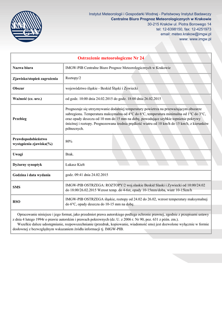 Instytut Meteorologii i Gospodarki Wodnej - Państwowy Instytut Badawczy Centralne Biuro Prognoz Meteorologicznych w Krakowie 30-215 Kraków ul. Piotra Borowego 14 tel: 12-6398150, fax: 12-4251973 email: [email protected] www: www.imgw.pl Ostrzeżenie meteorologiczne Nr 24 Nazwa biura IMGW-PIB Centralne Biuro Prognoz Meteorologicznych w Krakowie Zjawisko/stopień zagrożenia Roztopy/2 Obszar województwo śląskie - Beskid Śląski i Żywiecki Ważność (cz. urz.) od godz. 10:00 dnia 24.02.2015 do godz. 18:00 dnia 26.02.2015 Przebieg Prognozuje się utrzymywanie dodatniej temperatury powietrza na przeważającym obszarze subregionu. Temperatura maksymalna od 4°C do 6°C, temperatura minimalna od 1°C do 3°C, oraz opady deszczu od 10 mm do 15 mm na dobę, powodujące szybkie topnienie pokrywy śnieżnej i roztopy. Prognozowana średnia prędkość wiatru od 10 km/h do 15 km/h, z kierunków północnych. Prawdopodobieństwo wystąpienia zjawiska(%) 80% Uwagi Brak. Dyżurny synoptyk Łukasz Kiełt Godzina i data wydania godz. 09:41 dnia 24.02.2015 SMS IMGW-PIB OSTRZEGA: ROZTOPY/2 woj.slaskie Beskid Slaski i Zywiecki od 10:00/24.02 do 18:00/26.02.2015 Wzrost temp. do 4-6st, opady 10-15mm/doba, wiatr 10-15km/h RSO IMGW-PIB OSTRZEGA śląskie, roztopy od 24.02 do 26.02, wzrost temperatury maksymalnej do 6°C, opady deszczu do 10-15 mm na dobę. Opracowanie niniejsze i jego format, jako przedmiot prawa autorskiego podlega ochronie prawnej, zgodnie z przepisami ustawy z dnia 4 lutego 1994r o prawie autorskim i prawach pokrewnych (dz. U. z 2006 r. Nr 90, poz. 631 z późn. zm.). Wszelkie dalsze udostępnianie, rozpowszechnianie (przedruk, kopiowanie, wiadomość sms) jest dozwolone wyłącznie w formie dosłownej z bezwzględnym wskazaniem źródła informacji tj. IMGW-PIB.