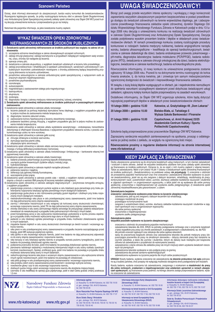 Szanowni Państwo UWAGA ŚWIADCZENIODAWCY! Dzisiaj, obok informacji skierowanych do ubezpieczonych, bardzo ważny komunikat dla świadczeniodawców. Rozwiązania legislacyjne sprawiły, że próby rozstrzygnięcia konkursu ofert w zakresie Opieki Długoterminowej oraz Ambulatoryjnej Opieki Specjalistycznej postawiły zakłady opieki zdrowotnej oraz Śląski OW NFZ przed trudną decyzją unieważnienia konkursu i przeprowadzenia go po raz kolejny. Biorąc pod uwagę przede wszystkim interes społeczny i wynikającą z niego konieczność zapewnienia wszystkim ubezpieczonym pacjentom bezpieczeństwa w postaci prawidłowego dostępu do świadczeń zdrowotnych na terenie województwa śląskiego, jak i zabezpieczenie prawidłowego finansowania zakładów opieki zdrowotnej, dyrektor Śląskiego Oddziału Wojewódzkiego Narodowego Funduszu Zdrowia w Katowicach podjął w dniu 13 lutego 2008 roku decyzję o unieważnieniu konkursu na realizację świadczeń zdrowotnych w zakresie Opieki Długoterminowej oraz Ambulatoryjnej Opieki Specjalistycznej. Decyzja została podyktowana wysokim procentem braków i błędów w składanych przez świadczeniodawców ofertach. W ramach prowadzonego konkursu zostaną rozstrzygnięte procedury konkursowe w rodzajach: badania medycyny nuklearnej, badania angiograficzne narządu wzroku, badania ultrasonograficzne – kwalifikacja do operacji kardiochirurgicznych, świadczenia w zakresie diabetologii dla dzieci, badania endoskopowe przewodu pokarmowego – pH-metria, diagnostyka laboratoryjna: badania molekularne (PCR/PFGE), badania radiologiczne (RTG), świadczenia w zakresie chirurgii onkologicznej dla dzieci, badania elektrofizjologiczne, świadczenia w zakresie kardiochirurgii, badania echokardiograficzne płodu. Natomiast dla pacjentów informacje, za jakie świadczenia musimy zapłacić. WYKAZ ŚWIADCZEŃ OPIEKI ZDROWOTNEJ NIEFINANSOWANYCH ZE ŚRODKÓW PUBLICZNYCH 1. Świadczenia opieki zdrowotnej niefinansowane ze środków publicznych bez względu na zakres ich zastosowania: 1) szczepienia ochronne niewchodzące w zakres obowiązkowych szczepień ochronnych; 2) zabiegi chirurgii plastycznej i zabiegi kosmetyczne w przypadkach niebędących następstwem wady wrodzonej, urazu, choroby lub następstw jej leczenia; 3) operacje zmiany płci; 4) świadczenia w zakresie akupunktury, z wyjątkiem świadczeń udzielanych w leczeniu bólu przewlekłego; 5) zabiegi przyrodolecznicze i rehabilitacyjne w szpitalach uzdrowiskowych, sanatoriach uzdrowiskowych i ambulatoryjnym lecznictwie uzdrowiskowym niezwiązane z chorobą podstawową będącą bezpośrednią przyczyną skierowania na leczenie uzdrowiskowe; 6) poradnictwo seksuologiczne w zakresie ambulatoryjnej opieki specjalistycznej, z wyłączeniem osób ze znacznym stopniem niepełnosprawności; 7) poradnictwo psychoanalityczne; 8) ozonoterapia; 9) autoszczepionki; 10) magnetoterapia z zastosowaniem stałego pola magnetycznego; 11) laseropunktura; 12) akupresura; 13) zooterapia; 14) diagnostyka i terapia z zakresu medycyny niekonwencjonalnej, ludowej, orientalnej. 2. Świadczenia opieki zdrowotnej niefinansowane ze środków publicznych w poszczególnych zakresach zastosowania: 1) świadczenia opieki zdrowotnej w zakresie układu nerwowego: a) leczenie padaczki za pomocą implantacji stymulatora nerwu błędnego, z wyjątkiem przypadków gdy jest to jedyna możliwa do zastosowania metoda terapeutyczna, b) diagnostyka i leczenie zaburzeń smaku, c) zastosowanie komory hiperbarycznej w leczeniu stwardnienia rozsianego, d) podawanie baclofenu pompą infuzyjną, z wyjątkiem przypadków gdy jest to jedyna możliwa do zastosowania metoda terapeutyczna; 2) świadczenia opieki zdrowotnej w zakresie układu wydzielania wewnętrznego – endoskopowa, transorbitalna dekompresja w oftalmopatii Gravesa-Basedowa z wyłączeniem przypadków ratowania wzroku z powodu udokumentowanego ucisku na nerw wzrokowy; 3) świadczenia opieki zdrowotnej w zakresie gałki ocznej: a) chirurgia refrakcyjna w korekcie wad wzroku, b) stymulacja laserowa plamki żółtej, c) alloplastyka tętnic skroniowych; 4) świadczenia opieki zdrowotnej w zakresie układu sercowo-naczyniowego – wszczepienie defibrylatora dwujamowego z funkcją defibrylacji przedsionkowej i komorowej; 5) świadczenia opieki zdrowotnej w zakresie układu krwiotwórczego i limfatycznego – bankowanie własnej krwi pępowinowej noworodka; 6) świadczenia opieki zdrowotnej w zakresie układu trawiennego: a) badanie przewodu pokarmowego za pomocą kapsułki endoskopowej, b) usunięcie guzków krwawniczych (żylaków odbytu) metodą Longo, c) hydrokolonoterapia; 7) świadczenia opieki zdrowotnej w zakresie męskich narządów płciowych: a) pobierania nasienia z najądrza, b) obliteracja żyły jądrowej metodą fluoroskopową, c) wszczepienie protez prącia; 8) świadczenia opieki zdrowotnej w zakresie powłok ciała – otyłość, z wyjątkiem otyłości patologicznej dużego stopnia u chorych o wartości BMI powyżej 40 leczonej metodami zabiegowymi; 9) świadczenia opieki zdrowotnej w zakresie zabiegów diagnostycznych – pozytronowa tomografia emisyjna, z wyjątkiem przypadków: a) pojedynczego przerzutu o nieznanym punkcie wyjścia w celu lokalizacji guza pierwotnego przy braku potwierdzenia rozpoznania lokalizacji ogniska pierwotnego innymi dostępnymi badaniami, b) pojedynczego guzka płuca w celu różnicowania pomiędzy guzem łagodnym i złośliwym przy braku rozpoznania innymi dostępnymi metodami, c) niedrobnokomórkowego raka płuca w celu przedoperacyjnej oceny zaawansowania, jeżeli inne badania nie dają jednoznacznej oceny stopnia zaawansowania, d) ziarnicy i chłoniaków nieziarniczych w celu wstępnej lub końcowej oceny skuteczności chemioterapii, wczesnego rozpoznania nawrotu, jeżeli TK nie daje jednoznacznej oceny stopnia zaawansowania, e) choroby wieńcowej w celu oceny zamrożonego mięśnia sercowego do precyzyjnego ustalenia wskazań/przeciwwskaza