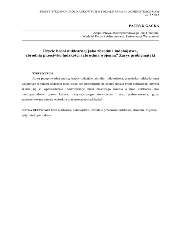 ZESZYT STUDENCKI KÓŁ NAUKOWYCH WYDZIAŁU PRAWA I ADMINISTRACJI UAM 2015 • Nr 5 PATRYK GACKA Zespół Prawa Międzynarodowego „Ius Gentium” Wydział Prawa i Administracji, Uniwersytet Warszawski Użycie broni nuklearnej jako zbrodnia ludobójstwa, zbrodnia przeciwko ludzkości i zbrodnia wojenna? Zarys problematyki STRESZCZENIE Autor przeprowadza analizę trzech rodzajów zbrodni: ludobójstwa, przeciwko ludzkości oraz wojennych z punktu widzenia możliwości ich popełnienia na skutek użycia broni nuklearnej. Artykuł składa się z: wprowadzenia (podrozdziały: broń masowego rażenia a broń nuklearna oraz międzynarodowe prawo karne), merytorycznego rozwinięcia oraz podsumowania, gdzie zaprezentowane zostały wnioski z przeprowadzonych badań. SŁOWA KLUCZOWE: broń nuklearna, ludobójstwo, zbrodnie przeciwko ludzkości, zbrodnie wojenne, sądy międzynarodowe
