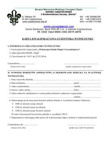 Związek Harcerstwa Polskiego Chorągiew Śląska HUFIEC CZĘSTOCHOWA I Środowiskowy Szczep „Warta” ul. Wilsona 34 fax: +48 343606198 42-201 Częstochowa tel: +48 343871019 kom:+48 696-772-666 www.czestochowa.zhp.pl [email protected] Konto Bankowe: Bank PKO BP S.A. II oddział Częstochowa 95 1020 1664 0000 3402 0019 4878 KARTA KWALIFIKACYJNA UCZESTNIKA WYPOCZYNKU I. INFORMACJA ORGANIZATORA WYPOCZYNKU 1. Forma placówki wypoczynku „Wakacyjna Szkoła Magii i Czarodziejstwa” 2. Adres placówki HOSW „Pająk” 3. Czas trwania od 14.07 do 27.07.2014r. Częstochowa, .......................... (miejscowość, data) .............................................................. (podpis organizatora wypoczynku) II. WNIOSEK RODZICÓW (OPIEKUNÓW) O SKIEROWANIE DZIECKA NA PLACÓWKĘ WYPOCZYNKU 1. Imię i nazwisko dziecka............................................................................................................................ 2. Data urodzenia......................................................................................... pesel........................................ 3. Adres zamieszkania................................................................................. telefon...................................... 4. Nazwa i adres szkoły................................................................................klasa......................................... 5. Adres rodziców (opiekunów) w czasie pobytu dziecka w placówce wypoczynku: ......................................................................................................................telefon...................................... 6. Zobowiązuję się do uiszczenia kosztów pobytu dziecka w wysokości (zaznacz właściwe): 1000 zł, słownie: tysiąc złotych 1100 zł, słownie tysiąc sto złotych 1200 zł, słownie tysiąc dwieście złotych W cenie wliczona jest bezzwrotna zaliczka w wysokości 100 zł. 7. Organizatorzy zastrzegają sobie prawo do wykorzystania zdjęć z kolonii w celach promocyjnych. Częstochowa, dn. ......................... (miejscowość, data) ................................................... (podpis ojca, matki lub opiekuna) III. INFORMACJA RODZICÓW (OPIEKUNÓW) O STANIE ZDROWIA DZIECKA (np. na co dziecko jest uczulone, jak znosi jazdę samochodem, czy przyjmuje stale leki i w jakich dawkach, czy nosi aparat ortodontyczny lub okulary) ........................................................................................................................................................ ................ ........................................................................................................................................................ ................ ........................................................................................................................................................ ................ .......................................................................................................................................................................... .......................................................................................................................................................................... STWIERDZAM, ŻE PODAŁAM (EM) WSZYSTKIE ZNANE MI INFORMACJE O DZIECKU, KTÓRE MOGĄ POMÓC W ZAPEWNIENIU WŁAŚCIWEJ OPIEKI W CZASIE POBYTU DZIECKA W PLACÓWCE WYPOCZYNKU. Oświadczenie rodziców/opiekunów prawnych: Niniejszym oświadczam, że w razie zagrożenia życia mojego dziecka ...................................... ....................................zgadzam się na jego leczenie szpitalne, zabiegi diagnostyczne, operacje. .............................................. .................................................... (data) (podpis matki, ojca lub opiekuna) IV. INFORMACJA PIELĘGNIARKI O SZCZEPIENIACH lub przedstawienie książeczki zdrowia z aktualnym wpisem szczepień Szczepienia ochronne (podać rok): tężec ......................, błonica ......................, dur .........................., inne ........................... .......................................... .......................................................... (data) (podpis pielęgniarki) V. INFORMACJA O DZIECKU WYCHOWAWCY KLASY (w przypadku barku możliwości uzyskania opinii wychowawcy klasy – wypełnia rodzic lub opiekun) .......................................................................................................................................................................... .......................................................................................................................................................................... .......................................................................................................................................................................... ....................................... ............................................................... (data) (podpis wychowawcy lub rodzica - opiekuna) VI. DECYZJA O KWALIFIKACJI UCZESTNIKA Postanawia się: 1. Zakwalifikować i skierować dziecko do udziału w placówce wypoczynku za odpłatnością w wysokości (zaznacz właściwe) 1000 zł, słownie: tysiąc złotych 1100 zł, słownie tysiąc sto złotych 1200 zł, słownie tysiąc dwieście złotych 2. Odmówić skierowania dziecka na placówkę wypoczynku ze względu: ................................................................................................................................................................... ............................................ .................................................. (data) (podpis ) VII. POTWIERRDZENIE POBYTU DZIECKA W PLACÓWCE WYPOCZYNKU Dziecko przebywało na kolonii Szkoła Magii i Czarodziejstwa, w HOSW „Pająk” (forma i adres placówki wypoczynku) od dnia ........................................ do dnia ............................................... 20 .......