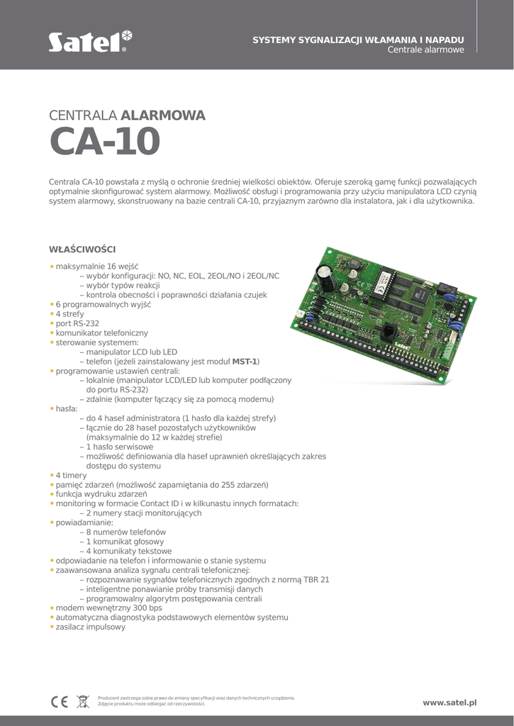 SYSTEMY SYGNALIZACJI WŁAMANIA I NAPADU Centrale alarmowe CENTRALA ALARMOWA CA-10 Centrala CA-10 powstała z myślą o ochronie średniej wielkości obiektów. Oferuje szeroką gamę funkcji pozwalających optymalnie skonfigurować system alarmowy. Możliwość obsługi i programowania przy użyciu manipulatora LCD czynią system alarmowy, skonstruowany na bazie centrali CA-10, przyjaznym zarówno dla instalatora, jak i dla użytkownika. WŁAŚCIWOŚCI ••maksymalnie 16 wejść –– wybór konfiguracji: NO, NC, EOL, 2EOL/NO i 2EOL/NC –– wybór typów reakcji –– kontrola obecności i poprawności działania czujek ••6 programowalnych wyjść ••4 strefy ••port RS-232 ••komunikator telefoniczny ••sterowanie systemem: –– manipulator LCD lub LED –– telefon (jeżeli zainstalowany jest moduł MST-1) ••programowanie ustawień centrali: –– lokalnie (manipulator LCD/LED lub komputer podłączony do portu RS-232) –– zdalnie (komputer łączący się za pomocą modemu) ••hasła: –– do 4 haseł administratora (1 hasło dla każdej strefy) –– łącznie do 28 haseł pozostałych użytkowników (maksymalnie do 12 w każdej strefie) –– 1 hasło serwisowe –– możliwość definiowania dla haseł uprawnień określających zakres dostępu do systemu ••4 timery ••pamięć zdarzeń (możliwość zapamiętania do 255 zdarzeń) ••funkcja wydruku zdarzeń ••monitoring w formacie Contact ID i w kilkunastu innych formatach: –– 2 numery stacji monitorujących ••powiadamianie: –– 8 numerów telefonów –– 1 komunikat głosowy –– 4 komunikaty tekstowe ••odpowiadanie na telefon i informowanie o stanie systemu ••zaawansowana analiza sygnału centrali telefonicznej: –– rozpoznawanie sygnałów telefonicznych zgodnych z normą TBR 21 –– inteligentne ponawianie próby transmisji danych –– programowalny algorytm postępowania centrali ••modem wewnętrzny 300 bps ••automatyczna diagnostyka podstawowych elementów systemu ••zasilacz impulsowy Producent zastrzega sobie prawo do zmiany specyfikacji oraz danych technicznych urządzenia. Zdjęcie produktu może odbiegać od rzeczywistości. www.satel.pl SYSTEMY SYGNALIZACJI WŁAMANIA I NAPADU Centrale alarmowe CENTRALA ALARMOWA CA-10 DANE TECHNICZNE CECHY SYSTEMU Klasa zabezpieczenia Maksymalna liczba wejść w systemie Maksymalna liczba wyjść Współpraca z systemem bezprzewodowym ABAX przy wykorzystaniu magistrali Strefy Klasa C 16 6 tak 4 Użytkownicy: użytkownicy + administratorzy + instalator Moduły rozszerzające 28+4+1 tak Manipulatory z dodatkowymi wejściami tak Pamięć zdarzeń 255 Wydruk zdarzeń tak Timery 4 OBSŁUGA SYSTEMU Manipulatory LCD tak Manipulatory LED tak Współpraca ze sterownikami radiowymi z serii RX/RE tak PŁYTY GŁÓWNE Znamionowe napięcie zasilania (±15%) Typ zasilacza 18 V AC, 50-60 Hz A Nominalne napięcie zasilacza centrali (±10%) Wydajność zasilacza Obciążalność wyjść wysokoprądowych (±10%) 12 V DC 2,2 A 2,2 A Obciążalność wyjść programowalnych niskoprądowych 50 mA Maksymalna pojemność akumulatora 17 Ah Klasa środowiskowa Zakres temperatur pracy Wejścia II -10°C…+55°C 8 Port RS-232 tak Komunikator telefoniczny tak Modem wewnętrzny Wymiary płytki elektroniki (mm) tak 173 x 102 KOMUNIKACJA Monitoring tak Powiadamianie tak Ilość numerów do powiadamiania 8 Komunikaty głosowe 1 Komunikaty na pager/SMS Obsługa przy pomocy programu DLOAD10 Producent zastrzega sobie prawo do zmiany specyfikacji oraz danych technicznych urządzenia. Zdjęcie produktu może odbiegać od rzeczywistości. 4 tak www.satel.pl