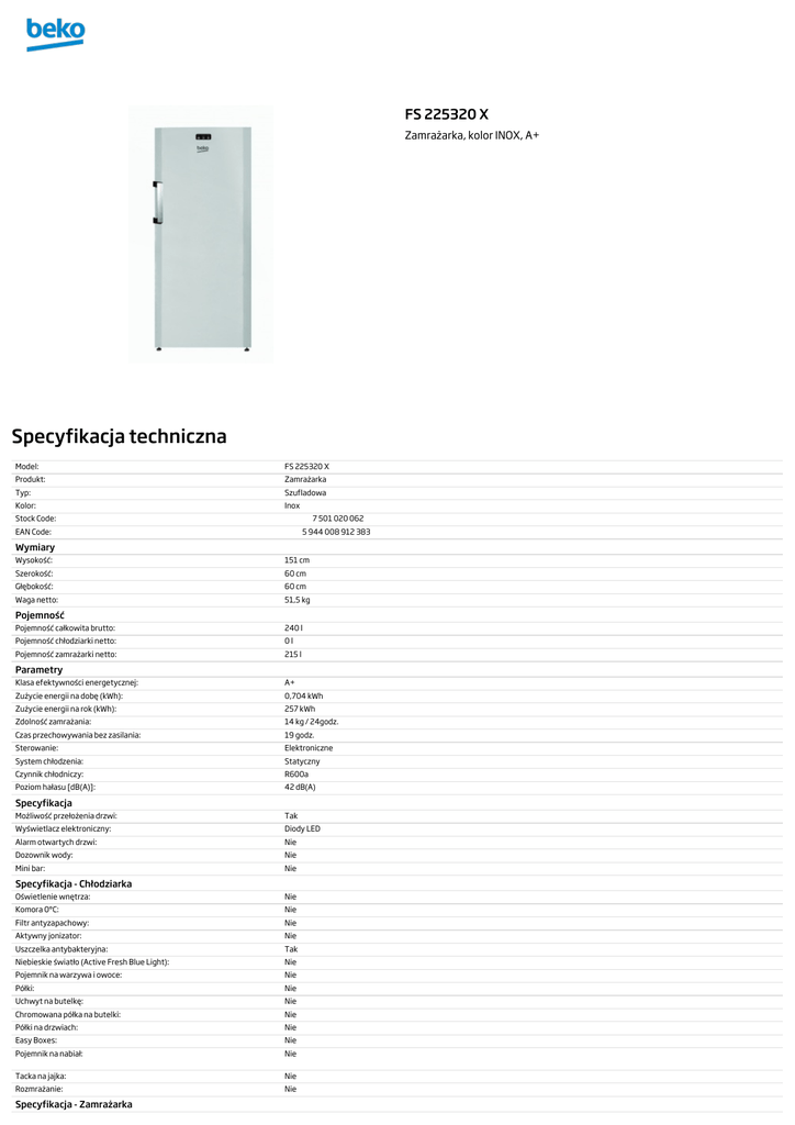 FS 225320 X Zamrażarka, kolor INOX, A+ Specyfikacja techniczna Model: FS 225320 X Produkt: Zamrażarka Typ: Szufladowa Kolor: Inox Stock Code: 7 501 020 062 EAN Code: 5 944 008 912 383 Wymiary Wysokość: 151 cm Szerokość: 60 cm Głębokość: 60 cm Waga netto: 51,5 kg Pojemność Pojemność całkowita brutto: 240 l Pojemność chłodziarki netto: 0l Pojemność zamrażarki netto: 215 l Parametry Klasa efektywności energetycznej: A+ Zużycie energii na dobę (kWh): 0,704 kWh Zużycie energii na rok (kWh): 257 kWh Zdolność zamrażania: 14 kg / 24godz. Czas przechowywania bez zasilania: 19 godz. Sterowanie: Elektroniczne System chłodzenia: Statyczny Czynnik chłodniczy: R600a Poziom hałasu [dB(A)]: 42 dB(A) Specyfikacja Możliwość przełożenia drzwi: Tak Wyświetlacz elektroniczny: Diody LED Alarm otwartych drzwi: Nie Dozownik wody: Nie Mini bar: Nie Specyfikacja - Chłodziarka Oświetlenie wnętrza: Nie Komora 0°C: Nie Filtr antyzapachowy: Nie Aktywny jonizator: Nie Uszczelka antybakteryjna: Tak Niebieskie światło (Active Fresh Blue Light): Nie Pojemnik na warzywa i owoce: Nie Półki: Nie Uchwyt na butelkę: Nie Chromowana półka na butelki: Nie Półki na drzwiach: Nie Easy Boxes: Nie Pojemnik na nabiał: Nie Tacka na jajka: Nie Rozmrażanie: Nie Specyfikacja - Zamrażarka Liczba pełnych szuflad: 6 Liczba komór: Nie Kostki lodu: tacka na lód Komora Multi-Zone: Nie Rozmrażanie: Ręczne Komora szybkiego mrożenia: Tak Technologie Klasa energetyczna A+ Produkty Beko posiadające klasę energetyczną A+ nie tylko przyczyniają się do podreperowania rodzinnego budżetu, ale również dbają o środowisko naturalne. Modele z klasą A+ zużywają jeszcze mniej energii niż identyczne modele w klasie A. Szybkie Mrożenie Zapewnia szybkie zmrażanie nowo włożonego pożywienia, w sposób zdrowszy oraz nie wpływający na temperaturę wcześniej przechowywanego jedzenia. Komora XL Komora XL umieszczona na samej górze zamrażalnika zapewnia większą przestrzeń potrzebna do przechowywania dużych produktów. Przegroda ta ma o 30% więcej miejsca niż standardowe komory. Przezroczyste Szuflady Zamrażalnika Przednia część szuflady zamrażalnika zrobiona jest z przeźroczystego materiału tak, że doskonale widać, jakie produkty znajdują się w środku szuflady bez konieczności wysuwania jej. Icebank - Komora lodowa Wbudowana w zamrażalnik komora lodowa zapewnia dogodne miejsce do przechowywania kostek lodu oraz do mrożenia małych owoców. Uszczelka antybakteryjna - chłodzenie Uszczelki w drzwiach zwykle trudno utrzymać w czystości, co czyni z nich doskonałe środowisko dla rozwoju bakterii. Dzięki dodatkowi substancji antybakteryjnych, uszczelki nie tylko same pozostają wolne od drobnoustrojów, ale tworzą antybakteryjną barierę chroniącą wnętrze chłodziarki przed niepożądanymi mikroorganizmami.