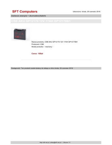 SFT Computers Utworzono: środa, 29 czerwiec 2016 Zasilacze awaryjne > akumulatory/baterie CSB AKU GP12170 12V 17AH GP12170B1 Nazwa produktu: CSB AKU GP12170 12V 17AH GP12170B1 Producent: CSB Model produktu: - nieznany - Cena: 188zł Dostępność: Ten produkt został dodany do sklepu w dniu środa, 29 czerwiec 2016 http://sft.net.pl | [email protected] | | Strona 1/1