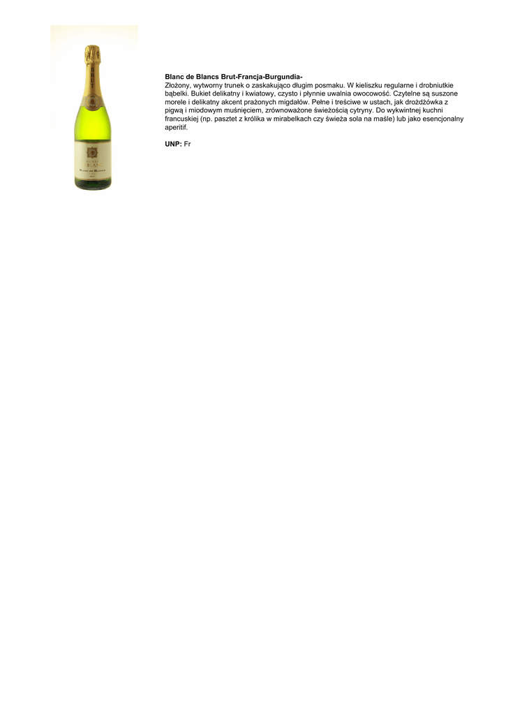 Blanc de Blancs Brut-Francja-BurgundiaZłożony, wytworny trunek o zaskakująco długim posmaku. W kieliszku regularne i drobniutkie bąbelki. Bukiet delikatny i kwiatowy, czysto i płynnie uwalnia owocowość. Czytelne są suszone morele i delikatny akcent prażonych migdałów. Pełne i treściwe w ustach, jak drożdżówka z pigwą i miodowym muśnięciem, zrównoważone świeżością cytryny. Do wykwintnej kuchni francuskiej (np. pasztet z królika w mirabelkach czy świeża sola na maśle) lub jako esencjonalny aperitif. UNP: Fr