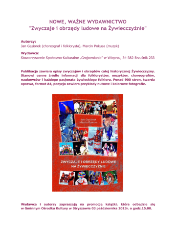 NOWE, WAŻNE WYDAWNICTWO "Zwyczaje i obrzędy ludowe na Żywiecczyźnie" Autorzy: Jan Gąsiorek (choreograf i folklorysta), Marcin Pokusa (muzyk) Wydawca: Stowarzyszenie Społeczno-Kulturalne „Grojcowianie” w Wieprzu, 34-382 Brzuśnik 233 Publikacja zawiera opisy zwyczajów i obrzędów całej historycznej Żywiecczyzny. Stanowi cenne źródło informacji dla folklorystów, muzyków, choreografów, naukowców i każdego pasjonata żywieckiego folkloru. Ponad 900 stron, twarda oprawa, format A4, pozycja zawiera przykłady nutowe i kolorowe fotografie. Wydawca i autorzy zapraszają na promocję książki, która odbędzie się w Gminnym Ośrodku Kultury w Stryszawie 03 października 2013r. o godz.15.00.