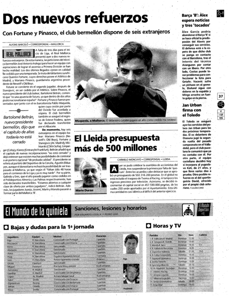 Dos nuevosrefuerzos Barça‘B’:Álex esperanoticias y tres‘tocados’ Con Fortuney Pinasco, el clubbermellóndisponede seisextranjeros Álex García podría abandonarel Barça‘B’si se haceoficialla predis posión del Atavéspor conseguirsusservicios. El defensaestáa la es pera de que dichoclub se ponga en contacto con el Barcélona, trasel interés del técnico Aranguren pór contar con un líbero.Por otro lado, Costaspuedete ner problemas paraçon feccionar la lista;para ALFONSBARCELÓCORRESSPONSAL MALLORCA A falta de tres díasparael ini cío de Liga, el RealMallorca. presentóayera dosnuevosre fuerzosextranjeros. Deestamanera,laspeticionesdeltécni co bermellónJoséAntoniolruleguiparahacetunequipocon aspiracionesde lograrel ascensoa PrimeraDivisiónse han hecho realidad.Losdos últimosllegadosvienenen calidad Je cedidáspor unatemporada.Setratadeldelanterosurafri cano QuentinFortune,cuyosderéchosposeeel Atléticode Madrid, y Mariano Pinasco, guardameta argentino proce dente deÑewell’sOIdBoys. Fotune se conviérteen el segundojugador,despuésde Stanojevic,en sercedidopor el Atlético. SobrePinasco,el nuevopresidentedelclubbalear,BartoloméBetrán,cómen tó que ‘esunaapuestadefuturo, yaquedentrodedosaños podránacionalizarse español Fortuney Pinasco fueronpre sentadosayerjunto con el ex barcelonistaPabloMaqueda, quien cuyacesiónpor parte del Oviedo fce acordadaa víspera. El club bermellón BartoloméBeltrán, tambiénseaseguróel regre so de EsteveFradera,quien nuevopresidente fue declaradotransferible - Getafe: Vuçevíc sufre un pichazoen el geme ló, Ekelundsigue con doloresen la espalda. y Mingo arrastraun fuer te golpeen la pierna.. . “. bermellón,dijo que el capitulodealtas todavíano está cerrado • Jan Urban firma con el Toledo por elAlbacete. momento, De hay seis éxtranjeros enel equipoba lear:Mariano Pinasco(Ne wéll’s OId Boys),Fortuney. .Stanojevic(At. Madrid),Mic htarski (CSKA Sofia),Limper ger (Celta)y Kientz(EintranchtFrankfurt). Beltránañadióque el capítulodé nuevasinco’rporaciones ‘no estácerrado”y dejó entreverqueexistenmuchasposibilidades decontratar a unporteronacional‘de probadacalidad”.Elpresidentese referíaal porterodelDeportivode laCoruña,AgustínEldua yen, aunqueeldonostiarrarechazólaposibilidaddesertras pasado al-Mallorca,ya que segúnél “faltan sólo 48 hoEas para elcomienzodela Ligay ya es muytarde”.Porsu párte, Galindo y Eres,que elaño pasadojugaroncomocedidosen el PolideportivoAlmeríay LasPalmasrespectivamente, han sido declaradostransferibles. “Estamos abiertosa cualquier clase ideóferta por ambosjugad9res”,indicóBeltrán.Ade más, losjugadoresJuanjo,Josemi,Maríny Manolopasarán a El. Lleidápresupuesta. más de 500 millones. formar partedelMallorca‘B’.;1] -. CARMELOMONCAYO • CORRESPONSAL LLEIDA yer se pudocelebrarla asamblea de accionistasdel Lleida,trassuspenderse laprimerapor faltade ‘quo rum’. Entrelosacuerdoscabede’stacar quese apro bó un presupuesto de 502.316.200pesetas.Enel globalno está incluídoeltraspasodeTxemaal Racing,nitampocolos ingresos previstospór televisión.Ásirnismo,se decidió in crementar el capitalsocialen457.590.000peetas, de los cuales 250 seránaportadospor el Ayuntamiento.Estaúlti ma cantidadescasiidénticaaldéficitdelanteriorejercicio. A - 1 El Toledo se asEgiró.. ayer losservicios delpo laco JanUrbanpáratás dos próximastempora das. El ex delanterode Osasunajugóla.segun da vuelta del pasado campeonato el Valla dolid, peroelen club puce lanole comunicó que.ya no contabaconél Por otra parte, el equipo castellanodecidiráhoy si .incorpora al yugosla vo Kati, de 21 años,y que lleva,variosdíasa prueba.Otroposiblere fuerzo es el del sportin guista David, ofrecido por el propioclubasturiano.•JUUÁN CANO - rrur 1 ti ¡.1i!Jíliuií 1 ElMundodoIdquiDield;0] .DegÜrI.iu. 1;0] f;1] P Bajasy dudaspara la 1 jornada D Horasy TV O SEP 1995