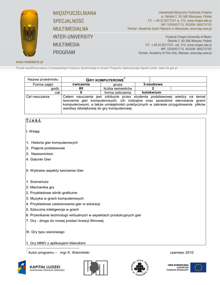 Nazwa przedmiotu GRY KOMPUTEROWE* ćwiczenia 3-osobowe Forma zajęć grupy 60 2 godz. liczba semestrów II kolokwium rok forma zaliczenia Cel nauczania Celem nauczania jest zdobycie przez studenta podstawowej wiedzy na temat tworzenia gier komputerowych, ich rodzajów oraz sposobów sterowania grami komputerowymi, a także umiejętności praktycznych w zakresie przygotowania plików warstwy dźwiękowej do gry komputerowej. Treść I. Wstęp 1. Historia gier komputerowych 2. Pojęcia podstawowe 3. Nazewnictwo 4. Gatunki Gier II. Wybrane aspekty tworzenia Gier 1. Scenariusz 2. Mechanika gry 2. Przykładowe silniki graficzne 3. Muzyka w grach komputerowych 4. Przykładowe zastosowania gier w edukacji 5. Sztuczna inteligencja w grach 6. Przenikanie technologii wirtualnych w aspektach produkcyjnych gier 7. Gry - droga do nowej postaci kreacji filmowej III. Gry typu sieciowego 1. Gry MMO z aplikacjami klienckimi * Autor programu – mgr K. Warmiński czerwiec 2010 2. Gry MMO przeglądarkowe IV. Sterowanie grami 1. Rodzaje interfejsów komunikacyjnych 2. Sterowanie skryptowe V. Podsumowanie 1. Problemy - uzależnienie emocjonalne, modyfikacje zachowań społecznych 2. Szansa - możliwość badania zachowań społecznych i osobniczych w sztucznie wykreowanym otoczeniu, bez dużych konsekwencji dla świata realnego. Nazwa przedmiotu GRY KOMPUTEROWE BIBLIOGRAFIA 1. Aaron Smuts: Are Video Games Art? (ang.). 2005. 2. An interactive videogame history timeline 3. Tom Chatfield writes 4. 5. 6. 7. 8. 9. 10. 11. 12. 13. 14. 15. 16. 17. 18. 19. 20. "Serious Games in Virtual Worlds: The Future of Enterprise Business Intelligence" "How Virtual Reality Military Applications Work" Nazwa przedmiotu FILMOGRAFIA 1. 2. 3. 4. 5. 6. 7. 8. 9. 10. 11. 12. 13. 14. 15. 16. 17. 18. 19. 20. youtube games trailers GRY KOMPUTEROWE Nazwa przedmiotu LINKI WEB 1. http://www.civilization5.com/ 2. http://ruse.us.ubi.com/ 3. http://www.lanoire.net/ 4. http://www.eveonline.com/ 5. http://www.lordofultima.com/en 6. http://www.crytek.com/ 7. http://www.ea.com/pl/ 8. 9. 10. 11. 12. 13. 14. 15. 16. 17. 18. 19. 20. GRY KOMPUTEROWE