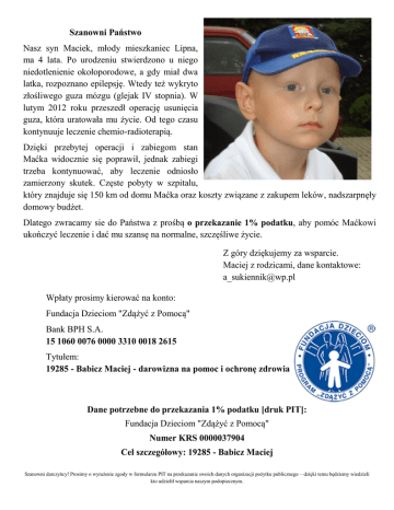 Szanowni Państwo Nasz syn Maciek, młody mieszkaniec Lipna, ma 4 lata. Po urodzeniu stwierdzono u niego niedotlenienie okołoporodowe, a gdy miał dwa latka, rozpoznano epilepsję. Wtedy też wykryto złośliwego guza mózgu (glejak IV stopnia). W lutym 2012 roku przeszedł operację usunięcia guza, która uratowała mu życie. Od tego czasu kontynuuje leczenie chemio-radioterapią. Dzięki przebytej operacji i zabiegom stan Maćka widocznie się poprawił, jednak zabiegi trzeba kontynuować, aby leczenie odniosło zamierzony skutek. Częste pobyty w szpitalu, który znajduje się 150 km od domu Maćka oraz koszty związane z zakupem leków, nadszarpnęły domowy budżet. Dlatego zwracamy sie do Państwa z prośbą o przekazanie 1% podatku, aby pomóc Maćkowi ukończyć leczenie i dać mu szansę na normalne, szczęśliwe życie. Z góry dziękujemy za wsparcie. Maciej z rodzicami, dane kontaktowe: [email protected] Wpłaty prosimy kierować na konto: Fundacja Dzieciom "Zdążyć z Pomocą" Bank BPH S.A. 15 1060 0076 0000 3310 0018 2615 Tytułem: 19285 - Babicz Maciej - darowizna na pomoc i ochronę zdrowia Dane potrzebne do przekazania 1% podatku [druk PIT]: Fundacja Dzieciom "Zdążyć z Pomocą" Numer KRS 0000037904 Cel szczegółowy: 19285 - Babicz Maciej Szanowni darczyńcy! Prosimy o wyrażenie zgody w formularzu PIT na przekazanie swoich danych organizacji pożytku publicznego – dzięki temu będziemy wiedzieli kto udzielił wsparcia naszym podopiecznym.
