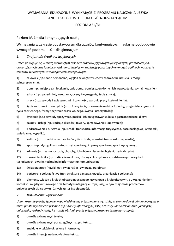 WYMAGANIA EDUKACYJNE WYNIKAJĄCE Z PROGRAMU NAUCZANIA JĘZYKA ANGIELSKIEGO W LICEUM OGÓLNOKSZTAŁCĄCYM POZIOM A2+/B1 Poziom IV. 1 – dla kontynuujących naukę Wymagania w zakresie podstawowym dla uczniów kontynuujących naukę na podbudowie wymagań poziomu III.0 – dla gimnazjum 1. Znajomość środków językowych. Uczeń posługuje się w miarę rozwiniętym zasobem środków językowych (leksykalnych, gramatycznych, ortograficznych oraz fonetycznych), umożliwiającym realizację pozostałych wymagań ogólnych w zakresie tematów wskazanych w wymaganiach szczegółowych. 1) człowiek (np.: dane personalne, wygląd zewnętrzny, cechy charakteru, uczucia i emocje, zainteresowania); 2) dom (np.: miejsce zamieszkania, opis domu, pomieszczeń domu i ich wyposażenia, wynajmowanie,); 3) szkoła (np.: przedmioty nauczania, oceny i wymagania, życie szkoły); 4) praca (np.: zawody i związane z nimi czynności, warunki pracy i zatrudnienia); 5) życie rodzinne i towarzyskie (np.: okresy życia, członkowie rodziny, koledzy, przyjaciele, czynności życia codziennego, formy spędzania czasu wolnego, święta i uroczystości); 6) żywienie (np.: artykuły spożywcze, posiłki i ich przygotowanie, lokale gastronomiczne, diety); 7) zakupy i usługi (np.: rodzaje sklepów, towary, sprzedawanie i kupowanie); 8) podróżowanie i turystyka (np.: środki transportu, informacja turystyczna, baza noclegowa, wycieczki, zwiedzanie, wypadki); 9) kultura (np.: dziedziny kultury, twórcy i ich dzieła, uczestnictwo w kulturze, media); 10) sport (np.: dyscypliny sportu, sprzęt sportowy, imprezy sportowe, sport wyczynowy); 11) zdrowie (np.: samopoczucie, choroby, ich objawy i leczenie, higieniczny tryb życia); 12) nauka i technika (np.: odkrycia naukowe, obsługa i korzystanie z podstawowych urządzeń technicznych, awarie, technologie informacyjno-komunikacyjne); 13) świat przyrody (np.: klimat, świat roślin i zwierząt, krajobraz); 14) państwo i społeczeństwo (np.: struktura państwa, urzędy, organizacje społeczne); 15) elementy wiedzy o krajach obszaru nauczanego języka oraz o kraju ojczystym, z uwzględnieniem kontekstu międzykulturowego oraz tematyki integracji europejskiej, w tym znajomość problemów pojawiających się na styku różnych kultur i społeczności. 2. Rozumienie wypowiedzi. Uczeń rozumie proste, typowe wypowiedzi ustne, artykułowane wyraźnie, w standardowej odmianie języka, a także proste wypowiedzi pisemne (np.: napisy informacyjne, listy, broszury, ulotki reklamowe, jadłospisy, ogłoszenia, rozkłady jazdy, instrukcje obsługi, proste artykuły prasowe i teksty narracyjne): 1) określa główną myśl tekstu; 2) określa główną myśl poszczególnych części tekstu; 3) znajduje w tekście określone informacje; 4) określa intencje nadawcy/autora tekstu; 5) określa kontekst wypowiedzi (np.: nadawcę, odbiorcę, formę tekstu); 6) rozpoznaje związki pomiędzy poszczególnymi częściami tekstu; 7) rozróżnia formalny i nieformalny styl wypowiedzi. 3. Tworzenie wypowiedzi. Uczeń samodzielnie formułuje krótkie, proste, zrozumiałe wypowiedzi ustne i pisemne(np.: wiadomość, opis, notatka, ogłoszenie, zaproszenie, ankieta, pocztówka, e-mail, list prywatny): 1) opisuje ludzi, przedmioty, miejsca, zjawiska i czynności; 2) opowiada o wydarzeniach życia codziennego i komentuje je; 3) przedstawia fakty z przeszłości i teraźniejszości; 4) relacjonuje wydarzenia z przeszłości; 5) wyraża i uzasadnia swoje opinie, poglądy i uczucia; 6) przedstawia opinie innych osób; 7) przedstawia zalety i wady różnych rozwiązań i poglądów; 8) opisuje intencje, marzenia, nadzieje i plany na przyszłość; 9) opisuje doświadczenia swoje i innych osób; 10) wyraża pewność, przypuszczenie, wątpliwości dotyczące zdarzeń z przeszłości, teraźniejszości i przyszłości; 11) wyjaśnia sposób obsługi prostych urządzeń (np.: automatu do napojów, bankomatu); 12) stosuje zasady konstruowania tekstów o różnym charakterze; 13) stosuje formalny lub nieformalny styl wypowiedzi w zależności od sytuacji. 4. Reagowanie na wypowiedzi. Uczeń uczestniczy w rozmowie i w typowych sytuacjach reaguje w sposób zrozumiały, adekwatnie do sytuacji komunikacyjnej, ustnie lub pisemnie (np.: e-mail, wiadomość, list prywatny i prosty list formalny) 1) nawiązuje kontakty towarzyskie (np.: przedstawia siebie i inne osoby, udziela podstawowych informacji na swój temat i pyta o dane rozmówcy i innych osób); 2) rozpoczyna, prowadzi i kończy rozmowę; 3) stosuje formy grzecznościowe; 4) uzyskuje i przekazuje informacje i wyjaśnienia; 5) prowadzi proste negocjacje w typowych sytuacjach życia codziennego (np.: wymiana zakupionego towaru); 6) proponuje, przyjmuje i odrzuca propozycje i sugestie; 7) prosi o pozwolenie, udziela i odmawia pozwolenia; 8) wyraża swoje opinie, intencje, preferencje i życzenia, pyta o opinie, preferencje i życzenia innych; 9) wyraża emocje (np.: radość, niezadowolenie, zdziwienie); 10) prosi o radę i udziela rady; 11) wyraża prośby i podziękowania oraz zgodę lub odmowę wykonania prośby; 12) wyraża skargę, przeprasza, przyjmuje przeprosiny; 13) prosi o powtórzenie bądź wyjaśnienie tego, co powiedział rozmówca. 5. Przetwarzanie wypowiedzi. Uczeń zmienia formę przekazu ustnego lub pisemnego 1) przekazuje w języku obcym informacje zawarte w materiałach wizualnych (np.: wykresach, mapach, symbolach, piktogramach), audiowizualnych (np.: filmach, reklamach) oraz tekstach obcojęzycznych; 2) przekazuje w języku polskim główne myśli lub wybrane informacje z tekstu w języku obcym; 3) przekazuje w języku obcym informacje sformułowane w języku polskim. 6. Znajomość struktur gramatyczno-leksykalnych Uczeń potrafi samodzielnie wykonywać zadania leksykalno-gramatyczne, obejmujące materiał z zakresu podstawowego, typu: 1) transformacja 2) częściowe tłumaczenie zdań 3) słowotwórstwo 4) wypełnianie luk (zadania ot