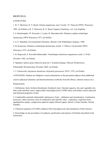 TECH-LAB: EXPERIMENT 31-ME. BIOFUELS. LITERATURE: 1. R. T. Morrison, R. N. Boyd: Chemia organiczna, tom 2 (rozdz. 33: Tłuszcze) PWN, Warszawa 1985. (in Polish) or R. T. Morrison, R. N. Boyd: Organic Chemistry, vol. 2.(in English). 2. S. Bredsznajder, W. Kawecki, J. Leyko, R. Marcinkowski: Podstawy ogólne technologii chemicznej, PWN Warszawa 1973. (in Polish) 3. S. E. Manahan: Environmental Chemistry, Brooks/ Cole Publishing Company, 1984. 4. H. Koneczny: Podstawy technologii chemicznej, (rozdz. V: Paliwa i ich przerób), PWN, Warszawa 1973. (in Polish) 5. R. Bogoczek, E. Kociołek-Balawejder: Technologia chemiczna organiczna, rozdz. 2, WAE, Wrocław 1992. (in Polish) 6. Spalanie i paliwa praca zbiorowa pod red. J. Kordylewskiego, Oficyna Wydawnicza Politechniki Wrocławskiej, Wrocław 2005. (in Polish) 7. J. Ciborowski: Inżynieria chemiczna. Inżynieria procesowa, WNT, 1973. (in Polish) ATTENTION: Student are obliged to search information on the presented subjects from additional sources (physical chemistry and thermochemistry textbooks from the library, internet sources etc.) Requirements 1. Definitions: fuels, biofuels (bioethanol, biodiesel), heat / thermal capacity, fats and vegetable oils, fatty acids and their esters, triglycerides (triacylglycerols), FAME (fatty acid methyl esters), physical and chemical properties of fats. 2. Combustible materials (flammable substances). Fuels – definition and classification. Combustion processes, chain reactions, heat of combustion and calorific value , explosions, explosion limit, sparkignition engine, compression-ignition engine (Diesel engine, diesel). Cetane Number, Octane Number. 3. Chemical equations of FAME synthesis from triacylglycerols and mechanism of this reaction. 4. Knowledge on the procedures of synthesis, purification and analysis of biofuels described in the instruction.