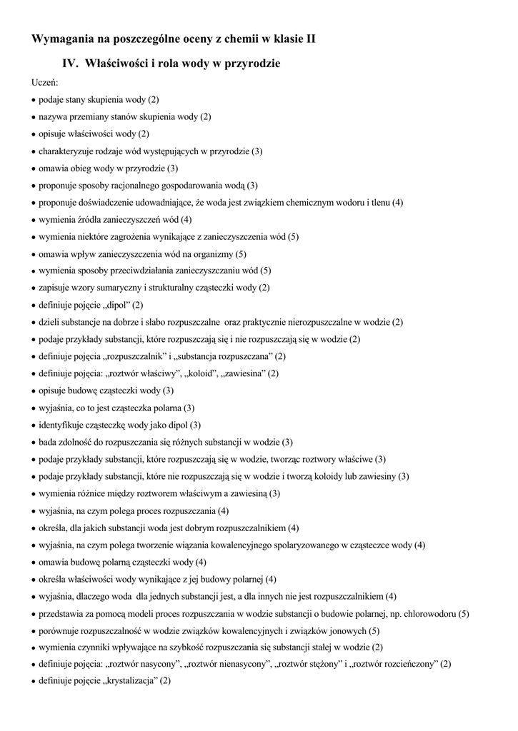Wymagania na poszczególne oceny z chemii w klasie II IV. Właściwości i rola wody w przyrodzie Uczeń: podaje stany skupienia wody (2) nazywa przemiany stanów skupienia wody (2) opisuje właściwości wody (2) charakteryzuje rodzaje wód występujących w przyrodzie (3) omawia obieg wody w przyrodzie (3) proponuje sposoby racjonalnego gospodarowania wodą (3) proponuje doświadczenie udowadniające, że woda jest związkiem chemicznym wodoru i tlenu (4) wymienia źródła zanieczyszczeń wód (4) wymienia niektóre zagrożenia wynikające z zanieczyszczenia wód (5) omawia wpływ zanieczyszczenia wód na organizmy (5) wymienia sposoby przeciwdziałania zanieczyszczaniu wód (5) zapisuje wzory sumaryczny i strukturalny cząsteczki wody (2) definiuje pojęcie „dipol” (2) dzieli substancje na dobrze i słabo rozpuszczalne oraz praktycznie nierozpuszczalne w wodzie (2) podaje przykłady substancji, które rozpuszczają się i nie rozpuszczają się w wodzie (2) definiuje pojęcia „rozpuszczalnik” i „substancja rozpuszczana” (2) definiuje pojęcia: „roztwór właściwy”, „koloid”, „zawiesina” (2) opisuje budowę cząsteczki wody (3) wyjaśnia, co to jest cząsteczka polarna (3) identyfikuje cząsteczkę wody jako dipol (3) bada zdolność do rozpuszczania się różnych substancji w wodzie (3) podaje przykłady substancji, które rozpuszczają się w wodzie, tworząc roztwory właściwe (3) podaje przykłady substancji, które nie rozpuszczają się w wodzie i tworzą koloidy lub zawiesiny (3) wymienia różnice między roztworem właściwym a zawiesiną (3) wyjaśnia, na czym polega proces rozpuszczania (4) określa, dla jakich substancji woda jest dobrym rozpuszczalnikiem (4) wyjaśnia, na czym polega tworzenie wiązania kowalencyjnego spolaryzowanego w cząsteczce wody (4) omawia budowę polarną cząsteczki wody (4) określa właściwości wody wynikające z jej budowy polarnej (4) wyjaśnia, dlaczego woda dla jednych substancji jest, a dla innych nie jest rozpuszczalnikiem (4) przedstawia za pomocą modeli proces rozpuszczania w wodzie substancji o budowie polarnej, np. chlorowodoru (5) porównuje rozpuszczalność w wodzie związków kowalencyjnych i związków jonowych (5) wymienia czynniki wpływające na szybkość rozpuszczania się substancji stałej w wodzie (2) definiuje pojęcia: „roztwór nasycony”, „roztwór nienasycony”, „roztwór stężony” i „roztwór rozcieńczony” (2) definiuje pojęcie „krystalizacja” (2) wymienia sposoby otrzymywania roztworu nienasyconego z nasyconego i otrzymywania roztworu nasyconego z nienasyconego (3) planuje doświadczenia wykazujące wpływ różnych czynników na szybkość rozpuszczania się substancji stałych w wodzie (3) wykazuje doświadczalnie wpływ różnych czynników na szybkość rozpuszczania substancji stałej w wodzie (4) opisuje różnice między roztworem rozcieńczonym, stężonym, nasyconym i nienasyconym (4) przeprowadza krystalizację (4) stwierdza doświadczalnie, czy roztwór jest nasycony, czy nienasycony (5) opisuje różnice między roztworem rozcieńczonym, stężonym, nasyconym i nienasyconym (5) definiuje pojęcie „rozpuszczalność” (2) wymienia czynniki, które wpływają na rozpuszczalność (2) określa, co to jest wykres rozpuszczalności (3) odczytuje z wykresu rozpuszczalności rozpuszczalność danej substancji w podanej temperaturze (3) porównuje rozpuszczalność różnych substancji w tej samej temperaturze (3) posługuje się sprawnie wykresem rozpuszczalności (4) oblicza ilość substancji, którą można rozpuścić w określonej ilości wody w podanej temperaturze (4) rozwiązuje zadania dotyczące rozpuszczalności substancji (5) definiuje stężenie procentowe roztworu (2) podaje wzór opisujący stężenie procentowe (2) wykonuje proste obliczenia z wykorzystaniem stężenia procentowego, masy substancji, masy rozpuszczalnika, masy roztworu (2) oblicza masę substancji rozpuszczonej lub masę roztworu, znając stężenie procentowe roztworu (3) wyjaśnia, jak sporządza się roztwór o określonym stężeniu procentowym (np. 100 g 20-procentowego roztworu soli kuchennej (3) oblicza masę wody, znając masę roztworu i jego stężenie procentowe (3) oblicza stężenie procentowe roztworu nasyconego w danej temperaturze (z wykorzystaniem wykresu rozpuszczalności) (4) wymienia czynności, które należy wykonać, aby sporządzić określoną ilość roztworu o określonym stężeniu procentowym (4) sporządza roztwór o określonym stężeniu procentowym (4) rozwiązuje zadania rachunkowe na stężenie procentowe – z wykorzystaniem gęstości (5) oblicza rozpuszczalność substancji w danej temperaturze, znając stężenie procentowe jej roztworu nasyconego w tej temperaturze (5) wymienia sposoby zmniejszania i zwiększania stężenia roztworów (3) oblicza stężenie procentowe roztworu powstałego przez zatężenie lub przez rozcieńczenie roztworu (4) rozwiązuje sprawnie zadania rachunkowe związane ze zmianą stężeń roztworów (5) V. Kwasy , zasady Uczeń: definiuje elektrolit i nieelektrolit(3) wyjaśnia pojęcie „wskaźnik”i wymienia trzy przykładywskaźników (3) opisuje zastosowania wskaźników (4) podaje przykłady elektrolitów i nieelektrolitów (5) planuje doświadczenie pozwalające odróżnić elektrolit i nieelektrolit (5) wymienia zasady BHP dotycząceobchodzenia się z kwasami (2) definiuje pojęcie „kwasy” (2) opisuje budowę kwasów beztlenowych (2) wskazuje wodór i resztę kwasową w kwasie chlorowodorowym (2) wyznacza wartościowość reszty kwasowej (2) zapisuje wzór sumaryczny i strukturalny kwasu chlorowodorowego (2) opisuje właściwości kwasu chlorowodorowego (3) opisuje zastosowanie kwasu chlorowodorowego (3) rozróżnia kwasy od innych substancji za pomocą wskaźników (4) wyjaśnia, dlaczego podczas pracyz kwasami należyzachować szczególną ostrożność (4) zapisuje równanie reakcji otrzymywania 