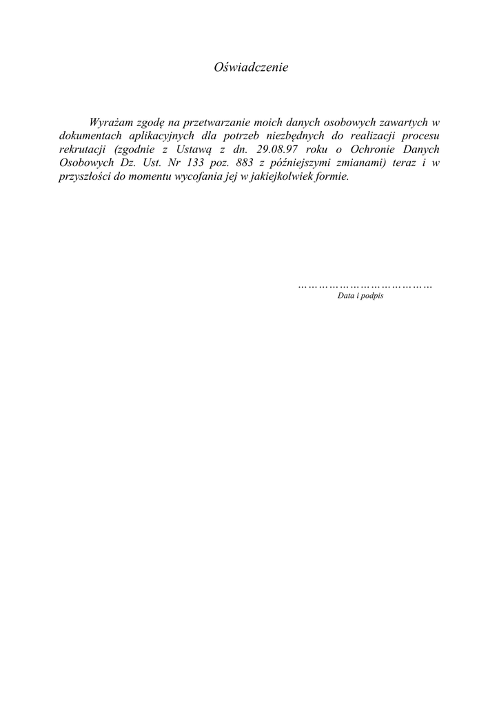 Oświadczenie Wyrażam zgodę na przetwarzanie moich danych osobowych zawartych w dokumentach aplikacyjnych dla potrzeb niezbędnych do realizacji procesu rekrutacji (zgodnie z Ustawą z dn. 29.08.97 roku o Ochronie Danych Osobowych Dz. Ust. Nr 133 poz. 883 z późniejszymi zmianami) teraz i w przyszłości do momentu wycofania jej w jakiejkolwiek formie. ………………………………… Data i podpis