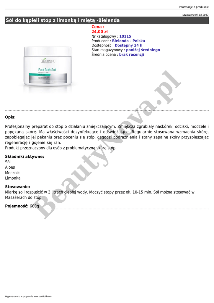 Informacje o produkcie Utworzono 07-03-2017 Sól do kąpieli stóp z limonką i miętą -Bielenda Cena : 24,00 zł a. pl Nr katalogowy : 10115 Producent : Bielenda - Polska Dostępność : Dostępny 24 h Stan magazynowy : poniżej średniego Średnia ocena : brak recenzji ov Opis: ut Składniki aktywne: Sól Aloes Mocznik Limonka yN Profesjonalny preparat do stóp o działaniu zmiękczającym. Zmiękcza zgrubiały naskórek, odciski, modzele i popękaną skórę. Ma właściwości dezynfekujące i odświeżające. Regularnie stosowana wzmacnia skórę, zapobiegając jej pękaniu oraz poceniu się stóp. Łagodzi podrażnienia i stany zapalne skóry przyspieszając regenerację i gojenie się ran. Produkt przeznaczony dla osób z problematyczną skórą stóp. ea Stosowanie: Miarkę soli rozpuścić w 3 litrach ciepłej wody. Moczyć stopy przez ok. 10-15 min. Sól można stosować w Masażerach do stóp. B Pojemność: 600g Wygenerowano w programie www.oscGold.com