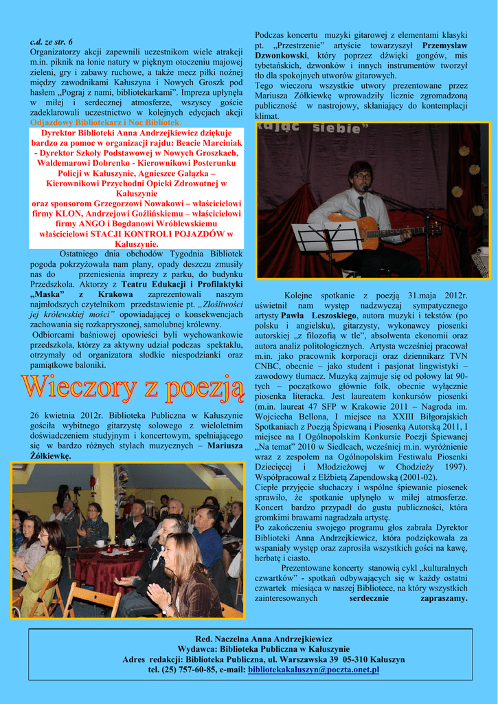 c.d. ze str. 6 Organizatorzy akcji zapewnili uczestnikom wiele atrakcji m.in. piknik na łonie natury w pięknym otoczeniu majowej zieleni, gry i zabawy ruchowe, a także mecz piłki nożnej między zawodnikami Kałuszyna i Nowych Groszk pod hasłem „Pograj z nami, bibliotekarkami”. Impreza upłynęła w miłej i serdecznej atmosferze, wszyscy goście zadeklarowali uczestnictwo w kolejnych edycjach akcji Odjazdowy Bibliotekarz i Noc Bibliotek. Dyrektor Biblioteki Anna Andrzejkiewicz dziękuje bardzo za pomoc w organizacji rajdu: Beacie Marciniak - Dyrektor Szkoły Podstawowej w Nowych Groszkach, Waldemarowi Dobrenko - Kierownikowi Posterunku Policji w Kałuszynie, Agnieszce Gałązka – Kierownikowi Przychodni Opieki Zdrowotnej w Kałuszynie oraz sponsorom Grzegorzowi Nowakowi – właścicielowi firmy KLON, Andrzejowi Goźlińskiemu – właścicielowi firmy ANGO i Bogdanowi Wróblewskiemu właścicielowi STACJI KONTROLI POJAZDÓW w Kałuszynie. Ostatniego dnia obchodów Tygodnia Bibliotek pogoda pokrzyżowała nam plany, opady deszczu zmusiły nas do przeniesienia imprezy z parku, do budynku Przedszkola. Aktorzy z Teatru Edukacji i Profilaktyki „Maska” z Krakowa zaprezentowali naszym najmłodszych czytelnikom przedstawienie pt. „Złośliwości jej królewskiej mości” opowiadającej o konsekwencjach zachowania się rozkapryszonej, samolubnej królewny. Odbiorcami baśniowej opowieści byli wychowankowie przedszkola, którzy za aktywny udział podczas spektaklu, otrzymały od organizatora słodkie niespodzianki oraz pamiątkowe baloniki. 26 kwietnia 2012r. Biblioteka Publiczna w Kałuszynie gościła wybitnego gitarzystę solowego z wieloletnim doświadczeniem studyjnym i koncertowym, spełniającego się w bardzo różnych stylach muzycznych – Mariusza Żółkiewkę. Podczas koncertu muzyki gitarowej z elementami klasyki pt. „Przestrzenie” artyście towarzyszył Przemysław Dzwonkowski, który poprzez dźwięki gongów, mis tybetańskich, dzwonków i innych instrumentów tworzył tło dla spokojnych utworów gitarowych. Tego wieczoru wszystkie utwory prezentowane przez Mariusza Zółkiewkę wprowadziły licznie zgromadzoną publiczność w nastrojowy, skłaniający do kontemplacji klimat. Kolejne spotkanie z poezją 31.maja 2012r. uświetnił nam występ nadzwyczaj sympatycznego artysty Pawła Leszoskiego, autora muzyki i tekstów (po polsku i angielsku), gitarzysty, wykonawcy piosenki autorskiej „z filozofią w tle”, absolwenta ekonomii oraz autora analiz politologicznych. Artysta wcześniej pracował m.in. jako pracownik korporacji oraz dziennikarz TVN CNBC, obecnie – jako student i pasjonat lingwistyki – zawodowy tłumacz. Muzyką zajmuje się od połowy lat 90tych – początkowo głównie folk, obecnie wyłącznie piosenka literacka. Jest laureatem konkursów piosenki (m.in. laureat 47 SFP w Krakowie 2011 – Nagroda im. Wojciecha Bellona, I miejsce na XXIII Biłgorajskich Spotkaniach z Poezją Śpiewaną i Piosenką Autorską 2011, I miejsce na I Ogólnopolskim Konkursie Poezji Śpiewanej „Na temat” 2010 w Siedlcach, wcześniej m.in. wyróżnienie wraz z zespołem na Ogólnopolskim Festiwalu Piosenki Dziecięcej i Młodzieżowej w Chodzieży 1997). Współpracował z Elżbietą Zapendowską (2001-02). Ciepłe przyjęcie słuchaczy i wspólne śpiewanie piosenek sprawiło, że spotkanie upłynęło w miłej atmosferze. Koncert bardzo przypadł do gustu publiczności, która gromkimi brawami nagradzała artystę. Po zakończeniu swojego programu głos zabrała Dyrektor Biblioteki Anna Andrzejkiewicz, która podziękowała za wspaniały występ oraz zaprosiła wszystkich gości na kawę, herbatę i ciasto. Prezentowane koncerty stanowią cykl „kulturalnych czwartków” - spotkań odbywających się w każdy ostatni czwartek miesiąca w naszej Bibliotece, na który wszystkich zainteresowanych serdecznie zapraszamy. Red. Naczelna Anna Andrzejkiewicz Wydawca: Biblioteka Publiczna w Kałuszynie Adres redakcji: Biblioteka Publiczna, ul. Warszawska 39 05-310 Kałuszyn tel. (25) 757-60-85, e-mail: [email protected]