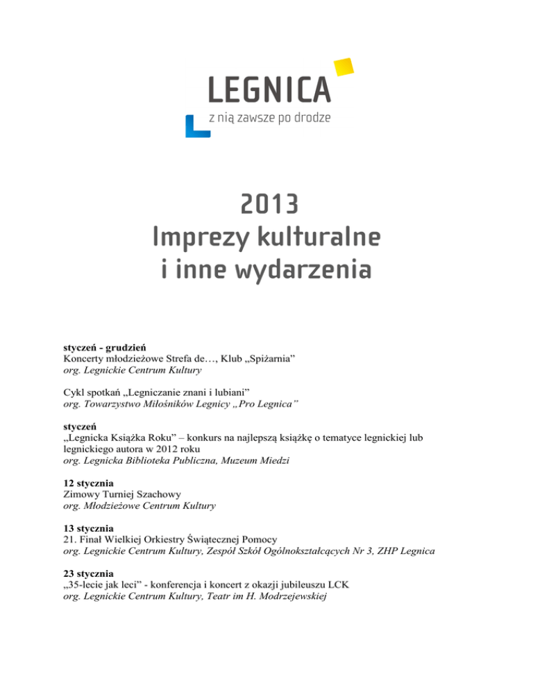 2013 Imprezy kulturalne i inne wydarzenia styczeń - grudzień Koncerty młodzieżowe Strefa de…, Klub „Spiżarnia” org. Legnickie Centrum Kultury Cykl spotkań „Legniczanie znani i lubiani” org. Towarzystwo Miłośników Legnicy „Pro Legnica” styczeń „Legnicka Książka Roku” – konkurs na najlepszą książkę o tematyce legnickiej lub legnickiego autora w 2012 roku org. Legnicka Biblioteka Publiczna, Muzeum Miedzi 12 stycznia Zimowy Turniej Szachowy org. Młodzieżowe Centrum Kultury 13 stycznia 21. Finał Wielkiej Orkiestry Świątecznej Pomocy org. Legnickie Centrum Kultury, Zespół Szkół Ogólnokształcących Nr 3, ZHP Legnica 23 stycznia „35-lecie jak leci” - konferencja i koncert z okazji jubileuszu LCK org. Legnickie Centrum Kultury, Teatr im H. Modrzejewskiej 24 stycznia Jazz Day – „Oleś Brothers” & „Trio Jörgensmann”, Kawiarnia „Ratuszowa” org. Legnickie Centrum Kultury Koncert „Zimowe nastroje” org. Zespół Szkół Muzycznych 25 stycznia - 24 lutego Andrzej Maciejewski – „Garden of Eden” oraz „Weather Report” org. Galeria Sztuki Katarzyna Bąkowska-Roszkowska – wystawa prac org. Galeria Sztuki luty - kwiecień „Nie zamykaj oczu” – interdyscyplinarny konkurs dla młodzieży w wieku gimnazjalnym Filia Dziecięco-Młodzieżowa nr 2 org. Legnicka Biblioteka Publiczna luty Blues Day org. Legnickie Centrum Kultury 22lutego - 2 czerwca „Świat toruńskiego piernika” – wystawa dydaktyczna i warsztaty dla dzieci, gmach główny org. Muzeum Miedzi 15 lutego - 25 czerwca „Via Regia. Szlak wędrówek gatunków” – wystawa przyrodnicza, gmach główny org. Muzeum Miedzi 16 lutego Dolnośląski Konkurs Piosenki „Dzieciopiewy” org. Młodzieżowe Centrum Kultury 17 lutego SLALOM GIGANT – Otwarte Mistrzostwa Legnicy, Pec pod Śnieżką org. Ośrodek Sportu i Rekreacji 20 lutego Mike Greene Acoustic Trio, akademik PWSZ, ul. Mickiewicza org. Jazz Club Blue Monk, Państwowa Wyższa Szkoła Zawodowa 22 lutego - 17 marca Iwona Demko „Obiekty” org. Galeria Sztuki 27 lutego - 24 marca Stanisław Brach „Ceramika” org. Galeria Sztuki marzec - kwiecień IV Przegląd Przedszkolnych Form Teatralnych „Mali aktorzy dla ekologii”, finał 24 kwietnia, Ekobiblioteka org. Legnicka Biblioteka Publiczna marzec Jazz Day org. Legnickie Centrum Kultury 58 Dolnośląski Konkurs Recytatorski dla gimnazjów org. Młodzieżowe Centrum Kultury 2 marca Dolnośląski Przegląd Piosenki Patriotycznej org. Młodzieżowe Centrum Kultury 9 marca Blues Day org. Legnickie Centrum Kultury 14 marca Ogólnopolski Samorządowy Konkurs Nastolatków „Ośmiu Wspaniałych” org. Młodzieżowe Centrum Kultury 22 - 23 marca I Ogólnokrajowy Turniej Gitarowy dla uczniów szkół muzycznych II stopnia, Akademia Rycerska org. Zespół Szkół Muzycznych 20 marca Ogólnopolski Konkurs „Wiosna” org. Młodzieżowe Centrum Kultury 22 marca - 14 kwietnia Alec Shepley „Instalacje i obiekty” org. Galeria Sztuki 23 marca Światowy Dzień Inwalidy i Osób Niepełnosprawnych org. Legnicka Biblioteka Publiczna, SDK „Atrium” 26 marca IV Przegląd Chórów i Zespołów Wokalnych szkół podstawowych, gimnazjalnych i ponadgimnazjalnych „Śpiewająca Legnica” org. Zespół Szkół Muzycznych 27 marca - 21 kwietnia Jarosław Chrabąszcz „Malarstwo” org. Galeria Sztuki 30 - 31 marca III Noc z Andersenem, Ekobiblioteka i Filia Dziecięco-Młodzieżowa nr 1 org. Legnicka Biblioteka Publiczna kwiecień - październik Legnickie Wieczory Organowe org. Legnickie Centrum Kultury 5 - 7 kwietnia Międzynarodowy Konkurs Skrzypcowy „Młody Paganini” org. Zespół Szkół Muzycznych 6 kwietnia 20. Międzynarodowy Turniej Tańca Towarzyskiego o „Złotego Lwa”, hala OSiR, ul. Lotnicza org. Legnickie Centrum Kultury Turniej szachowy org. Młodzieżowe Centrum Kultury 22 kwietnia Rejonowy Konkurs Plastyczny „Przyroda wokół nas - czysta woda” org. Młodzieżowe Centrum Kultury 18 - 19 kwietnia Inauguracja miejskich obchodów 20. rocznicy wyjścia wojsk radzieckich z Legnicy - Zjazd Gmin Gościnnych - spotkanie wspomnieniowe przedstawicieli samorządów gmin, w których stacjonowały wojska PGWAR - Otwarcie plenerowej wystawy planszowej „Odzyskane miasto - radziecka Legnica dziś” - Inauguracja „Szlaku Małej Moskwy” org. Muzeum Miedzi, Urząd Miasta 24 kwietnia Festiwal Zespołów Kameralnych org. Zespół Szkół Muzycznych maj - czerwiec XII Legnickie Spotkania z Ludźmi Książki - Konkurs literacki - 15 maja, - Sesja popularnonaukowa „Kobiety w literaturze” - 22 maja, - Konkurs czytelniczy - 5 czerwca, - „Wzorowy Czytelnik” - finał konkursu czytelniczego dla dzieci i młodzieży, - „Panorama Legnicka Gimnazjalisty Anno Domini 2013” - finał konkursu literackiego na artykuł do czasopisma w ramach obchodów Europejskiego Roku Obywateli, Czytelnia Naukowa org. Legnicka Biblioteka Publiczna maj-czerwiec (wernisaże i imprezy towarzyszące 17-18 maja 2013) LEGNICKI FESTIWAL SREBRO 2013 – 22. Międzynarodowy Konkurs Sztuki Złotniczej BUNT – Sylwetki Twórców - cykl prezentacji wybitnych indywidualności polskiego i międzynarodowego złotnictwa. W tej edycji będą to: Sigurd Bronger – norweski artysta-złotnik z Oslo; Arkadiusz Wolski - polski designer; Maria i Paweł Fietkowiczowie - wystawa retrospektywna złotników z Sopotu; Aneta Lis-Marciniewicz i Adriana Lisowska - projekt konceptualny; Agnieszka Bruzda i Jan Bohdan Suchodolski - wystawa retrospektywna. – Srebrne Szkoły - cykl wystaw prezentujący dorobek artystyczny europejskich szkół złotniczych, tym razem: Gerrit Rietveld Academie (Amsterdam, Holandia) i Alchimia Contemporary Jewellery School (Florencja, Włochy). – Debiuty - cykl pokazujący prace artystów wchodzących na polską i europejską scenę złotniczą i designerską - twórczość absolwentki Akademii Sztuk Pięknych w Łodzi Moniki Miodek. – Prince of Charming i Palace of Happiness 