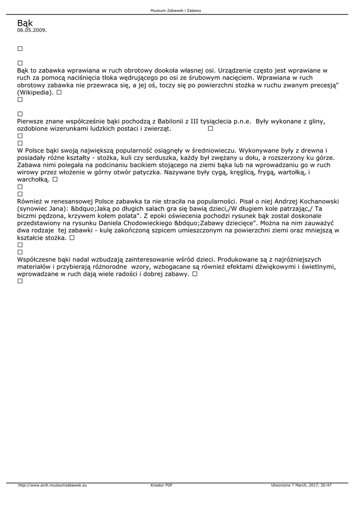 Muzeum Zabawek i Zabawy Bąk 06.05.2009. Bąk to zabawka wprawiana w ruch obrotowy dookoła własnej osi. Urządzenie często jest wprawiane w ruch za pomocą naciśnięcia tłoka wędrującego po osi ze śrubowym nacięciem. Wprawiana w ruch obrotowy zabawka nie przewraca się, a jej oś, toczy się po powierzchni stożka w ruchu zwanym precesją" (Wikipedia). Pierwsze znane współcześnie bąki pochodzą z Babilonii z III tysiąclecia p.n.e. Były wykonane z gliny, ozdobione wizerunkami ludzkich postaci i zwierząt. W Polsce bąki swoją największą popularność osiągnęły w średniowieczu. Wykonywane były z drewna i posiadały różne kształty - stożka, kuli czy serduszka, każdy był zwężany u dołu, a rozszerzony ku górze. Zabawa nimi polegała na podcinaniu bacikiem stojącego na ziemi bąka lub na wprowadzaniu go w ruch wirowy przez włożenie w górny otwór patyczka. Nazywane były cygą, kręglicą, frygą, wartołką, i warchołką. Również w renesansowej Polsce zabawka ta nie straciła na popularności. Pisał o niej Andrzej Kochanowski (synowiec Jana): „Jaką po długich salach gra się bawią dzieci,/W długiem kole patrzając,/ Ta biczmi pędzona, krzywem kołem polata". Z epoki oświecenia pochodzi rysunek bąk został doskonale przedstawiony na rysunku Daniela Chodowieckiego „Zabawy dziecięce". Można na nim zauważyć dwa rodzaje tej zabawki - kulę zakończoną szpicem umieszczonym na powierzchni ziemi oraz mniejszą w kształcie stożka. Współczesne bąki nadal wzbudzają zainteresowanie wśród dzieci. Produkowane są z najróżniejszych materiałów i przybierają różnorodne wzory, wzbogacane są również efektami dźwiękowymi i świetlnymi, wprowadzane w ruch dają wiele radości i dobrej zabawy. http://www.arch.muzeumzabawek.eu Kreator PDF Utworzono 7 March, 2017, 20:47