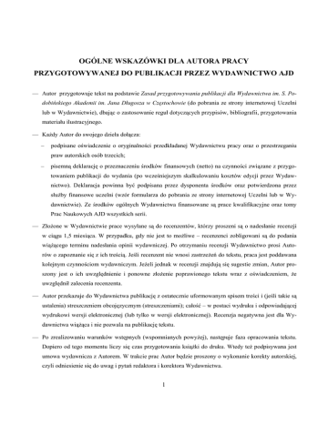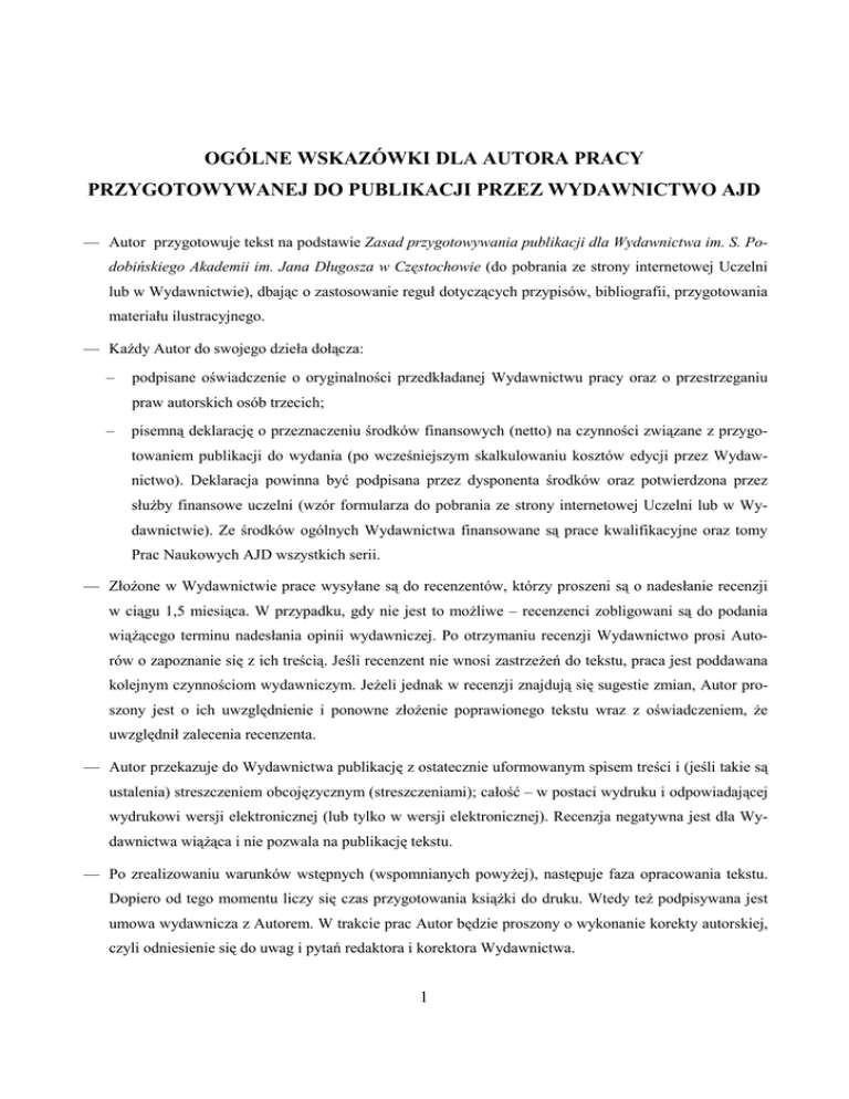 OGÓLNE WSKAZÓWKI DLA AUTORA PRACY PRZYGOTOWYWANEJ DO PUBLIKACJI PRZEZ WYDAWNICTWO AJD — Autor przygotowuje tekst na podstawie Zasad przygotowywania publikacji dla Wydawnictwa im. S. Podobińskiego Akademii im. Jana Długosza w Częstochowie (do pobrania ze strony internetowej Uczelni lub w Wydawnictwie), dbając o zastosowanie reguł dotyczących przypisów, bibliografii, przygotowania materiału ilustracyjnego. — KaŜdy Autor do swojego dzieła dołącza: – podpisane oświadczenie o oryginalności przedkładanej Wydawnictwu pracy oraz o przestrzeganiu praw autorskich osób trzecich; – pisemną deklarację o przeznaczeniu środków finansowych (netto) na czynności związane z przygotowaniem publikacji do wydania (po wcześniejszym skalkulowaniu kosztów edycji przez Wydawnictwo). Deklaracja powinna być podpisana przez dysponenta środków oraz potwierdzona przez słuŜby finansowe uczelni (wzór formularza do pobrania ze strony internetowej Uczelni lub w Wydawnictwie). Ze środków ogólnych Wydawnictwa finansowane są prace kwalifikacyjne oraz tomy Prac Naukowych AJD wszystkich serii. — ZłoŜone w Wydawnictwie prace wysyłane są do recenzentów, którzy proszeni są o nadesłanie recenzji w ciągu 1,5 miesiąca. W przypadku, gdy nie jest to moŜliwe – recenzenci zobligowani są do podania wiąŜącego terminu nadesłania opinii wydawniczej. Po otrzymaniu recenzji Wydawnictwo prosi Autorów o zapoznanie się z ich treścią. Jeśli recenzent nie wnosi zastrzeŜeń do tekstu, praca jest poddawana kolejnym czynnościom wydawniczym. JeŜeli jednak w recenzji znajdują się sugestie zmian, Autor proszony jest o ich uwzględnienie i ponowne złoŜenie poprawionego tekstu wraz z oświadczeniem, Ŝe uwzględnił zalecenia recenzenta. — Autor przekazuje do Wydawnictwa publikację z ostatecznie uformowanym spisem treści i (jeśli takie są ustalenia) streszczeniem obcojęzycznym (streszczeniami); całość – w postaci wydruku i odpowiadającej wydrukowi wersji elektronicznej (lub tylko w wersji elektronicznej). Recenzja negatywna jest dla Wydawnictwa wiąŜąca i nie pozwala na publikację tekstu. — Po zrealizowaniu warunków wstępnych (wspomnianych powyŜej), następuje faza opracowania tekstu. Dopiero od tego momentu liczy się czas przygotowania ksiąŜki do druku. Wtedy teŜ podpisywana jest umowa wydawnicza z Autorem. W trakcie prac Autor będzie proszony o wykonanie korekty autorskiej, czyli odniesienie się do uwag i pytań redaktora i korektora Wydawnictwa. 1 — Z tytułu wydania przez Wydawnictwo publikacji Autor nie otrzymuje honorarium. — Po zakończeniu fazy przygotowania edytorskiego, a więc po czynnościach korektorskich, redakcyjnych i technicznych, Autor zapoznaje się z finalną wersją tomu dostarczoną przez Wydawnictwo w formacie .pdf. Zgłasza zauwaŜone usterki lub akceptuje pisemnie plik .pdf jako gotowy do druku (formularz do podpisu zostanie dostarczony przez Wydawnictwo). 2