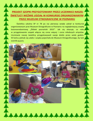 PROJEKT SZOPKI PRZYGOTOWANY PRZEZ UCZENNICE NASZEJ ŚWIETLICY WEŹMIE UDZIAŁ W KONKURSIE ORGANIZOWANYM PRZEZ MUZEUM ETNOGRAFICZNE W POZNANIU Świetlica szkolna SP nr 78 po raz pierwszy wzięła udział w konkursie organizowanym prze Muzeum Etnograficzne w Poznaniu na najpiękniejszą szopkę bożonarodzeniową „Żłóbek poznaoski 2015”. Jak się okazuje, co roku w przygotowanie szopek włącza się coraz więcej i coraz młodszych artystów. Uczniowie naszej świetlicy przygotowywali swoje dzieło przez wiele godzin. W koocu jednak się udało i szopka pojechała do Muzeum Etnograficznego, by tam oceniło ją jury. Rozstrzygnięcie konkursu 5.12.2015 Ekspozycja nagrodzonych i wyróżnionych prac w terminie 5 grudnia 2015 do 24 stycznia 2016 Mamy nadzieję, iż projekt naszej szopki zostanie doceniony i będziemy mied przyjemnośd oglądad go wśród wyróżnionych prac. Gorąco zachęcamy do odwiedzenia wystawy. Wychowawcy świetlicy