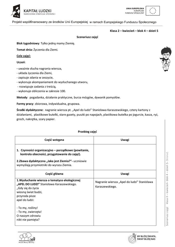 Klasa 2 – kwiecień – blok 4 – dzień 5 Scenariusz zajęć Blok tygodniowy: Tylko jedną mamy Ziemię. Temat dnia: Życzenia dla Ziemi. Cele zajęć: Uczeń: - uważnie słucha nagrania wiersza, - układa życzenia dla Ziemi, - zapisuje zdania w zeszycie, - wykonuje akompaniament do wysłuchanego utworu, - rozwiązuje zadania z treścią, - wykonuje obliczenia w zakresie 100. Metody: pogadanka, działanie praktyczne, burza mózgów, dywanik pomysłów. Formy pracy: zbiorowa, indywidualna, grupowa. Środki dydaktyczne: nagranie wiersza pt. „Apel do ludzi” Stanisława Karaszewskiego, cztery kartony z działaniami, plastikowe butelki, stare gazety, puszki po napojach, plastikowa butelka po jogurcie, kasza, ryż, groch, nakrętka, szary papier. Przebieg zajęć Uwagi 1. Czynności organizacyjno – porządkowe (powitanie, kontrola obecności, przygotowanie do zajęć). 2.Zbawa dydaktyczna „Jaka jest Ziemia?”- uczniowie wymyślają przymiotniki do wyrazu Ziemia. Część główna 1.Wysłuchanie wiersza o tematyce ekologicznej „APEL DO LUDZI” Stanisława Karaszewskiego. „Gdy się do życia wiosną świat budzi, przyroda pisze apel do ludzi: - To my, rośliny! - To my, zwierzęta! O naszym zdrowiu nikt nie pamięta? Uwagi Nagranie wiersza „Apel do ludzi” Stanisława Karaszewskiego. Scenariusz zajęć klasa II – kwiecień- blok 4 – dzień 5- Strona1 Część wstępna Trujące ścieki, trujące dymy, bez tlenu rzeki... ...My się dusimy! A gdy umrzemy w trującym brudzie, na martwej ziemi zginą też ludzie! Chcemy żyć z wami w zgodzie, przyjaźni, niechaj nie zabraknie wam wyobraźni! Tęczowy motyl nad łąką lata, pająk misternie sieć swą uplata. Patrzcie, jak pięknie w lesie, w ogrodzie! Ile jest życia w ziemi i w wodzie! - Kto pisze apel do ludzi? - Dlaczego Ziemia kieruje do nas taki apel? - Jak ludzie postępują wobec planety, na której mieszkamy ? - Co możemy zrobić dla Ziemi? - Jak postępować, aby pomóc naszej planecie? 2. Układanie wiersza 5 zmysłów pt. „Ziemia” – zapisanie wiersza w zeszycie. Wygląda jak …. Smakuje jak …. Pachnie jak …. Dźwięczy w uszach jak …. W dotyku jest jak …. 3.Wspólne układanie życzeń dla Ziemi. Kochana Ziemio! Życzymy Ci mądrych i rozsądnych mieszkańców, którzy zadbają o Ciebie i będą szanować Ciebie i Twoje dary. Uczniowie klasy 2 1 http://przedszkolanka.com/viewpage.php?page_id=34 Scenariusz zajęć klasa II – kwiecień- blok 4 – dzień 5- Strona2 I ty, Pierwszaku, oszczędzaj wodę, nie niszcz i nie śmieć. DBAJ O PRZYRODĘ!”1 „1.Nie warto mieszkać na Marsie, Nie warto mieszkać na Wenus. Na Ziemi jest życie ciekawsze, Powtarzam to każdemu. Ref. Bo Ziemia to wyspa , to wyspa zielona, Wśród innych dalekich planet. To dom jest dla ludzi, dla ludzi i zwierząt, Więc musi być bardzo zadbany. 2.Chcę poznać życie delfinów I wiedzieć co piszczy w trawie. Zachwycać się lotem motyla I z kotem móc się bawić. Ref. Bo Ziemia to wyspa , to wyspa zielona… 3. Posadźmy kwiatów tysiące. Posadźmy krzewy i drzewa, Niech z nieba uśmiecha się słońce, Animacja „Ziemia” Działania przygotowane na czterech kartonach zawieszamy na tablicy lub rozdajemy każdemu uczniowi przygotowane wcześniej osobne kartki z działaniami. Plastikowe butelki, stare gazety, puszki po napojach. Plastikowa butelka po jogurcie, kasza, ryż, groch, nakrętka. Scenariusz zajęć klasa II – kwiecień- blok 4 – dzień 5- Strona3 4. Zapisanie życzeń w zeszycie. Zwrócenie uwagi na poprawność ortograficzną zapisanych zdań oraz pisownię zwrotów grzecznościowych, nagłówka, akapitu oraz podpisu. 5. Praca plastyczna – „Nasza Ziemia”. Dzielimy uczniów na 3 lub 4 grupy. Nauczyciel dla każdej z grup przygotowuje na białych brystolach kontur kuli ziemskiej z zaznaczonymi liniami lądów i oceanów. Uczniowie w grupach kolorują farbami: zieloną i niebieską wyznaczone miejsca. Możemy pokazać uczniom animację kuli ziemskiej z widocznymi kontynentami i oceanami. Sprawdzamy estetykę wykonania. Odwieszamy do wyschnięcia. 6. Zadanko Liczmanka: - Które z działań to różnica? Wpisz znak w odpowiednie miejsce. Jakie znaki trzeba wstawić w pozostałe miejsca, aby wynik działania był prawdziwy? 75 … 5 = 75… 5 = 75 … 5 = 70 75 … 5 = 80 375 15 7. Zabawa ruchowa „Klasowe porządki”. Nauczyciel rozkłada w różnych miejscach papierki, puste butelki lub puszki. Uczniowie na sygnał zbierają śmieci i wrzucają do odpowiedniego pojemnika. 8. Przygotowanie instrumentów z różnych materiałów np. plastikowa butelka, a w niej kasza, groch lub ryż. Zadaniem uczniów jest napełnienie butelek różnymi nasionami i prawidłowe zabezpieczenie. Instrumenty wykorzystujemy przy piosence „Ziemia wyspa zielona”. 9. Nauka piosenki „Ziemia wyspa zielona” – akompaniament z wykorzystaniem wykonanych grzechotek. Pozwólmy ptakom śpiewać. Ref. Bo Ziemia to wyspa , to wyspa zielona…”2 10. Zadanko Liczmanka: - Zagrajcie rzucając dwiema kostkami w grę „Kto nazbiera najwięcej punktów” – zabawa polega na tym, że każdy rzuca kolejno dwiema kostkami. Kto wyrzuci większą sumę oczek zdobywa punkt. Po kilku kolejkach sprawdźcie, po ile punktów zdobyliście. Wygrywa ta osoba, która ma więcej punktów. 11. Ciekawostki Liczmanka: „Magiczne kwadraty, to liczby tak ułożone, że suma liczb w każdej kolumny i rzędzie jest taka sama. Magiczne kwadraty mogą składać się z czterech lub więcej pól. Najpopularniejsze mają zazwyczaj 9 lub 16 pól. Magiczne kwadraty należą do najstarszych znanych łamigłówek. W XV wieku zainteresowanie tymi łamigłówkami przeniosło się z Chin do Europy. 4 9 3 5 8 1 2 7 6”3 12. Rozwiązywanie matematycznych łamigłówek. - „Oblicz sumę magicznego kwadratu: 7 10 4 „4 - Przeczytaj zadanie przepisz je do zeszytu i rozwiąż. Janek ma 4 pudełka plasteliny po 6 plastelin w każdym. Antek ma tylko 2 pudełka, po 4