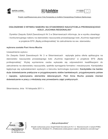Projekt współfinansowany przez Unię Europejską ze środków Europejskiego Funduszu Społecznego OGŁOSZENIE O WYNIKU NABORU NA STANOWISKO NAUCZYCIELA PROWADZĄCEGO KOŁO „KUCHNIA REGIONALNA” Dyrektor Zespołu Szkół Zawodowych Nr 3 w Skierniewicach informuje, że w wyniku otwartego i konkurencyjnego naboru na stanowisko nauczyciela prowadzącego koło „Kuchnia regionalna” w projekcie EFS „Będę profesjonalistą” do zatrudnienia na ww. stanowisku wybrana została Pani Anna Mucha Uzasadnienie wyboru: Do Zespołu Szkół Zawodowych Nr 3 w Skierniewicach wpłynęła jedna oferta aplikacyjna na stanowisko nauczyciela prowadzącego koło „Kuchnia regionalna” w projekcie EFS „Będę profesjonalistą”. Wyżej wymienione osoba wykazała się odpowiednimi kwalifikacjami do zatrudnienia na stanowisku nauczyciela, spełniła wymagania formalne i merytoryczne. Kandydatka legitymuje się wykształceniem wyższym o kierunku technologia żywności. Kandydatka ma bardzo duże doświadczenie praktyczne w przygotowywaniu stołów bankietowych, przygotowywaniu potraw i napojów, wykonywaniu elementów dekoracyjnych. Pani Anna Mucha posiada również doświadczenie w pracy z młodzieżą oraz prowadzeniu zajęć praktycznych. Skierniewice, dnia 16 listopada 2011 r. „ Będę profesjonalistą” Projekt realizowany przez Zespół Szkół Zawodowych Nr 3 w Skierniewicach w ramach POKL Priorytet IX, Działanie 9.2 „Podniesienie atrakcyjności i jakości szkolnictwa zawodowego” ul. Działkowa 10, 96-100 Skierniewice