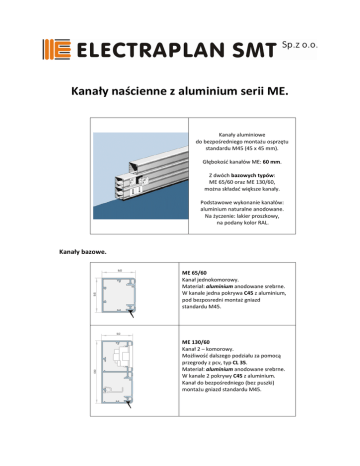 Kanały naścienne z aluminium serii ME. Kanały aluminiowe do bezpośredniego montażu osprzętu standardu M45 (45 x 45 mm). Głębokość kanałów ME: 60 mm. Z dwóch bazowych typów: ME 65/60 oraz ME 130/60, można składać większe kanały. Podstawowe wykonanie kanałów: aluminium naturalne anodowane. Na życzenie: lakier proszkowy, na podany kolor RAL. Kanały bazowe. ME 65/60 Kanał jednokomorowy. Materiał: aluminium anodowane srebrne. W kanale jedna pokrywa C45 z aluminium, pod bezposredni montaż gniazd standardu M45. ME 130/60 Kanał 2 – komorowy. Możliwość dalszego podziału za pomocą przegrody z pcv, typ CL 35. Materiał: aluminium anodowane srebrne. W kanale 2 pokrywy C45 z aluminium. Kanał do bezpośredniego (bez puszki) montażu gniazd standardu M45. Kanały składane. ME 195/60 Kanał 3 – komorowy (3 pokrywy C45). Materiał: aluminium anodowane srebrne. Kanał powstał z połączenia (sklejenia) 2 kanałów bazowych: ME 65/60 oraz ME 130/60. W przegrodzie kanału 130/60, na życzenie, otwory między komorami (16 x 40 mm). Dodatkowy podział komór: poprzez zastosowanie przegrody z pcv, typ CL 35. Montaż gniazd standardu M45: bezpośrednio, w miejsce pokrywy C45. Cokół maskujący z pcv, wpinany w profil (przy podłodze). Cokół można łatwo zdemontować. ME 260/60 Kanał 4 – komorowy. W kanałe 4 pokrywy z aluminium C45. Powstał poprzez połączenie (sklejenie) 2 bazowych kanałów ME 130/60. W przegrodzie każdego kanału 130/60 możliwość wykonania (na życzenie) otworów 16 x 40 mm. Bezpośredni ( bez stosowania puszek) montaż gniazd standardu M45. Cokół maskujący (z pcv), wpinany w profil kanału (przy podłodze). Cokół można łatwo zdemontować. Akcesoria kanałów ME. - pokrywa C45 z aluminium anodowanego (lakier na życzenie),cięta, wg potrzeb - końcówka (zaślepka) kanałów j.w. - kąty (wewnętrzny, zewnętrzny, płaski, trójnik typu T) - przegroda z pcv typ CL 35 - łącznik prosty EA 25, - uziemienie pokryw i korpusów kanału - maskownica przypodłogowa z pcv, szara lub czarna - otwory (16 x 40 mm) w przegrodzie kanałów ME 130/60 (na życzenie). Widok odcinków poszczególnych kanałów serii ME.