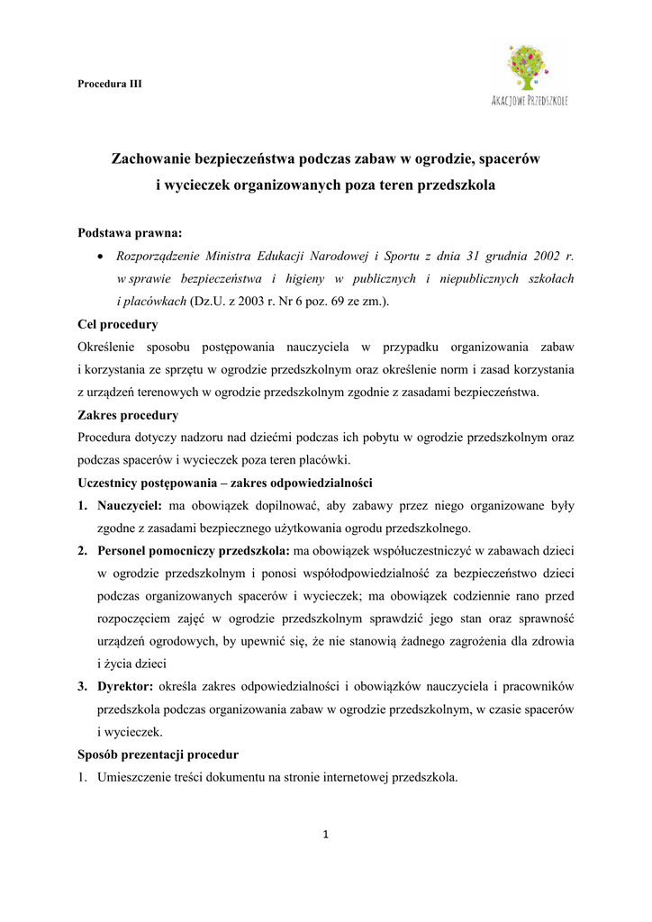 Procedura III Zachowanie bezpieczeństwa podczas zabaw w ogrodzie, spacerów i wycieczek organizowanych poza teren przedszkola Podstawa prawna: • Rozporządzenie Ministra Edukacji Narodowej i Sportu z dnia 31 grudnia 2002 r. w sprawie bezpieczeństwa i higieny w publicznych i niepublicznych szkołach i placówkach (Dz.U. z 2003 r. Nr 6 poz. 69 ze zm.). Cel procedury Określenie sposobu postępowania nauczyciela w przypadku organizowania zabaw i korzystania ze sprzętu w ogrodzie przedszkolnym oraz określenie norm i zasad korzystania z urządzeń terenowych w ogrodzie przedszkolnym zgodnie z zasadami bezpieczeństwa. Zakres procedury Procedura dotyczy nadzoru nad dziećmi podczas ich pobytu w ogrodzie przedszkolnym oraz podczas spacerów i wycieczek poza teren placówki. Uczestnicy postępowania – zakres odpowiedzialności 1. Nauczyciel: ma obowiązek dopilnować, aby zabawy przez niego organizowane były zgodne z zasadami bezpiecznego użytkowania ogrodu przedszkolnego. 2. Personel pomocniczy przedszkola: ma obowiązek współuczestniczyć w zabawach dzieci w ogrodzie przedszkolnym i ponosi współodpowiedzialność za bezpieczeństwo dzieci podczas organizowanych spacerów i wycieczek; ma obowiązek codziennie rano przed rozpoczęciem zajęć w ogrodzie przedszkolnym sprawdzić jego stan oraz sprawność urządzeń ogrodowych, by upewnić się, że nie stanowią żadnego zagrożenia dla zdrowia i życia dzieci 3. Dyrektor: określa zakres odpowiedzialności i obowiązków nauczyciela i pracowników przedszkola podczas organizowania zabaw w ogrodzie przedszkolnym, w czasie spacerów i wycieczek. Sposób prezentacji procedur 1. Umieszczenie treści dokumentu na stronie internetowej przedszkola. 1 2. Zapoznanie rodziców z obowiązującymi w placówce procedurami na zebraniach organizacyjnych we wrześniu każdego roku szkolnego lub podczas podpisywania umowy o świadczenie usług edukacyjnych. 3. Udostępnienie dokumentu na tablicy ogłoszeń w przedszkolu. 4. Zapoznanie wszystkich pracowników przedszkola z treścią procedur. Tryb dokonywania zmian w procedurze 1. Wszelkich zmian w opracowanej procedurze może dokonać z własnej inicjatywy lub na wniosek rady pedagogicznej dyrektor placówki. Wnioskodawcą zmian może być również rodzic. 2. Proponowane zmiany nie mogą być sprzeczne z prawem. 3. Zasady wchodzą w życie z dniem: 01.09.2015r. Opis procedury 1. Podczas pobytu dzieci na terenie ogrodu przedszkolnego od pierwszych dni września uczy się je korzystania z urządzeń terenowych zgodnie z zasadami bezpieczeństwa. Ustala się normy i zasady korzystania z tego sprzętu. 2. Codziennie rano dyrektor lub wyznaczony pracownik przedszkola ma obowiązek sprawdzić, czy urządzenia ogrodowe są sprawne i nie stanowią żadnego zagrożenia dla zdrowia i życia dzieci. 3. W czasie pobytu w ogrodzie nie przewiduje się możliwości gromadzenia nauczycielek w jednym miejscu. Nauczyciele powinni być w bezpośrednim kontakcie ze swoimi podopiecznymi i przebywać w miejscach największych zagrożeń. 4. Podczas zabaw dzieciom nie wolno oddalać się samowolnie z terenu. Dzieci wracają z terenu kolumną prowadzoną przez nauczyciela. Po ustawieniu podopiecznych w kolumnę nauczyciel powinien każdorazowo sprawdzić, czy wszystkie dzieci będące w danym dniu w jego grupie są obecne. 5. Z terenu przedszkolnego można pozwolić dziecku odejść dopiero wtedy, gdy rodzic dotarł na miejsce pobytu grupy. 6. Nauczyciel w przypadku organizowania zabaw w ogrodzie: a) wychodzi do ogrodu po uprzednim sprawdzeniu stanu terenu i sprzętu ogrodowego, 2 b) przestrzega wymogu, aby zabawy były organizowane zgodnie z zasadami bezpiecznego użytkowania ogrodu przedszkolnego, umieszczonymi na drzwiach wejściowych do ogrodu, c) jest zobowiązany sprawdzić liczbę dzieci przed wyjściem do ogrodu i przed powrotem do sali. 7. W przypadku wyjścia na spacer nauczyciel: a) odnotowuje dzień, miejsce i godzinę wyjścia z grupą w zeszycie wycieczek, b) zaopatruje dzieci w kamizelki odblaskowe, c) zapewnia opiekę jednego dorosłego na najwyżej 15 dzieci, d) idzie zawsze od strony ulicy, e) dostosowuje trasę do możliwości dzieci, f) stale sprawdza stan liczebny grupy, zwłaszcza przed wyjściem na spacer, przed powrotem i po powrocie ze spaceru. 8. W przypadku organizowania wycieczki dyrektor przedszkola powołuje spośród nauczycieli kierownika wycieczki, którego obowiązkiem jest: a) zobowiązać nauczycieli prowadzących grupę do zebrania pisemnych zgód rodziców na udział dzieci w wycieczce i do sprawdzenia, czy u dzieci nie występują przeciwwskazania zdrowotne, ograniczające ich uczestnictwo w wycieczce (informacje lub oświadczenia rodziców/opiekunów prawnych), b) sporządzić program i regulamin wycieczki, listę uczestników i opiekunów oraz umieścić te informacje w karcie wycieczki i przedstawić do zatwierdzenia dyrektorowi co najmniej pięć dni przed planowaną wycieczką, c) zapoznać opiekunów grup oraz rodziców/opiekunów prawnych z programem i regulaminem wycieczki, d) powierzyć opiece jednego opiekuna nie więcej niż 15 dzieci, e) dostosować organizację i program wycieczki do wieku, potrzeb, możliwości i zainteresowań dzieci, f) zabrać ze sobą kompletną i sprawdzoną apteczkę pierwszej pomocy oraz zaopatrzyć dzieci w kamizelki odblaskowe, g) czuwać nad przestrzeganiem regulaminu wycieczki, a w razie potrzeby dyscyplinować uczestników, h) w chwili wypadku koordynować przebieg akcji ratunkowej, ponosić pełną odpowiedzialność za podjęte działania. 3 i) bezwzględnie odwołać wyjazd w przypadku burzy, śnieżycy i innych niesprzyjających warunków atmosferycznych, j) nie dopuścić do przewozu dzieci w przypadku stwierdzenia sytuacji zagrażającej bezpieczeństwu zdrowia i życia. 9. Za organizację i przebieg wycieczki są odpowiedzialni także opiekunowie grup, których obowiązkiem jest: a) znać program i regulamin wycieczki i przestrzega