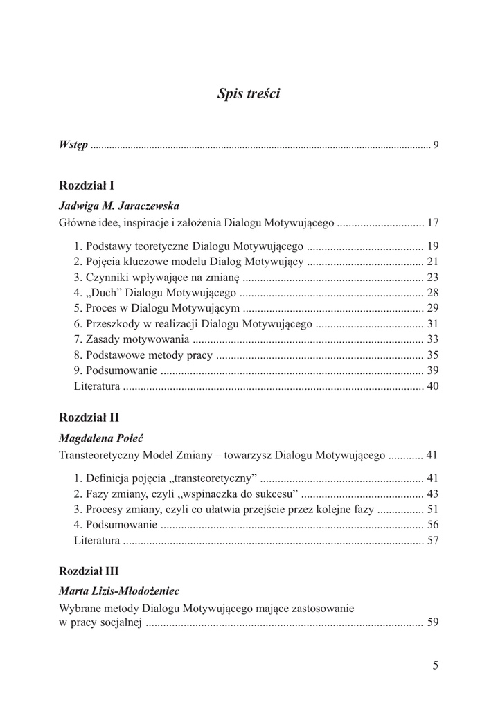 Spis treści Wstęp ................................................................................................................................ 9 Rozdział I Jadwiga M. Jaraczewska Główne idee, inspiracje i założenia Dialogu Motywującego .............................. 17 1. Podstawy teoretyczne Dialogu Motywującego ........................................ 19 2. Pojęcia kluczowe modelu Dialog Motywujący ........................................ 21 3. Czynniki wpływające na zmianę .............................................................. 23 4. „Duch” Dialogu Motywującego ............................................................... 28 5. Proces w Dialogu Motywującym .............................................................. 29 6. Przeszkody w realizacji Dialogu Motywującego ..................................... 31 7. Zasady motywowania ............................................................................... 33 8. Podstawowe metody pracy ....................................................................... 35 9. Podsumowanie .......................................................................................... 39 Literatura ....................................................................................................... 40 Rozdział II Magdalena Połeć Transteoretyczny Model Zmiany – towarzysz Dialogu Motywującego ............ 41 1. Definicja pojęcia „transteoretyczny” ........................................................ 41 2. Fazy zmiany, czyli „wspinaczka do sukcesu” .......................................... 43 3. Procesy zmiany, czyli co ułatwia przejście przez kolejne fazy ................ 51 4. Podsumowanie .......................................................................................... 56 Literatura ....................................................................................................... 57 Rozdział III Marta Lizis-Młodożeniec Wybrane metody Dialogu Motywującego mające zastosowanie w pracy socjalnej ............................................................................................... 59 5 1. Pytania otwarte ......................................................................................... 60 2. Odzwierciedlenia ...................................................................................... 61 3. Dowartościowanie .................................................................................... 62 4. Podsumowanie .......................................................................................... 62 5. Wywoływanie języka zmiany ................................................................... 64 6. Konstruowanie planu działania ................................................................ 67 7. Podsumowanie .......................................................................................... 71 Literatura ....................................................................................................... 71 Rozdział IV Izabela Krasiejko Elementy Dialogu Motywującego w metodycznym działaniu pracowników socjalnych .......................................................................................................... 72 1. Realizacja celów i zadań pracy socjalnej poprzez Dialog Motywujący ... 73 2. Zbieranie danych – rutynowe czy profesjonalne? ..................................... 76 3. Trzy style komunikacji w informowaniu i poradnictwie socjalnym ......... 79 Literatura ....................................................................................................... 92 Rozdział V Beata Kita, Joanna Rutkowska Dialog Motywujący w kontekście systemowej pracy z rodziną ........................ 95 1. Systemowe rozumienie rodziny ................................................................ 96 2. Zastosowanie Dialogu Motywującego w pracy z rodziną ...................... 102 3. Pomoc rodzinie w oparciu o Dialog Motywujący i jej systemowe rozumienie .............................................................................................. 104 4. Przykłady zastosowania Dialogu Motywującego w pracy z systemem rodzinnym ............................................................................................... 109 5. Praca indywidualna z dzieckiem powiązana z pracą z diadą rodzicielską ............................................................................................. 113 6. Zasady pracy z dziećmi w oparciu o Dialog Motywujący i systemowe rozumienie rodziny ................................................................................. 117 7. Podsumowanie ........................................................................................ 120 Literatura ..................................................................................................... 123 6 Rozdział VI Anna Derwich Dialog Motywujący w pracy z młodzieżą ....................................................... 125 1. Powstrzymywanie odruchu naprawiania ................................................ 126 2. Zrozumienie motywacji klienta .............................................................. 128 3. Słuchanie klienta ..................................................................................... 130 4. Wzmacnianie klienta ............................................................................... 132 Literatura ..................................................................................................... 147 Rozdział VII Jadwiga M. Jaraczewska, Izabela Krasiejko Dialog Motywujący w pracy z osobami z problemem uzależnień .................. 149 1. Tradycyjny pogląd na opór i zaprzeczanie ............................................. 150 2. Dialog Motywujący jako nowatorska koncepcja pracy z klientem uzależnionym .......................................................................................... 151 3. Strategie motywujące dla każdej fazy zmiany w pracy z osobą nadużywającą subs