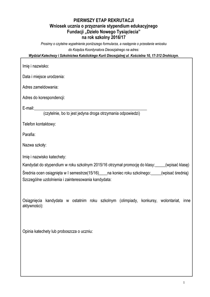 PIERWSZY ETAP REKRUTACJI Wniosek ucznia o przyznanie stypendium edukacyjnego Fundacji „Dzieło Nowego Tysiąclecia” na rok szkolny 2016/17 Prosimy o czytelne wypełnienie poniższego formularza, a następnie o przesłanie wniosku do Księdza Koordynatora Diecezjalnego na adres: Wydział Katechezy i Szkolnictwa Katolickiego Kurii Diecezjalnej ul. Kościelna 10, 17-312 Drohiczyn. Imię i nazwisko: Data i miejsce urodzenia: Adres zameldowania: Adres do korespondencji: E-mail:______________________________________________________ (czytelnie, bo to jest jedyna droga otrzymania odpowiedzi) Telefon kontaktowy: Parafia: Nazwa szkoły: Imię i nazwisko katechety: Kandydat do stypendium w roku szkolnym 2015/16 otrzymał promocję do klasy:_____(wpisać klasę) Średnia ocen osiągnięta w I semestrze(15/16)____na koniec roku szkolnego:_____(wpisać średnią) Szczególne uzdolnienia i zainteresowania kandydata: Osiągnięcia kandydata w ostatnim roku szkolnym (olimpiady, konkursy, wolontariat, inne aktywności): Opinia katechety lub proboszcza o uczniu: 1 OŚWIADCZENIE O SYTUACJI RODZINNEJ I MATERIALNEJ* ucznia, wnioskującego o przyznanie stypendium Imię i nazwisko ucznia ............................................................................................................. PESEL ........................................................... Rodzina moja składa się z niżej wymienionych osób, pozostających we wspólnym gospodarstwie domowym: ** Lp. Imię i nazwisko Data urodzenia Pokrewieństwo Miejsce zatrudnienia lub nauki wnioskujący o stypendium 1. 2. 3. 4. 5. 6. 7. 8. 9. 10. Średni dochód miesięczny (brutto) na jedną osobę, bez zasiłku „500+”. w rodzinie wynosi .......................... PLN** Świadomy odpowiedzialności karnej w przypadku podania nieprawdziwych danych oświadczam, że przedstawione informacje są zgodne ze stanem faktycznym. ....................................................... , dnia ....................................... (miejscowość) ........................................................ (podpis opiekuna prawnego) 2 Kilka wyjaśnień na temat I etapu rekrutacji oraz sposobu wypełnienia wniosku. 1. Jak wygląda rekrutacja kandydatów do Fundacji Dzieło Nowego Tysiąclecia? Rekrutacja przebiega w dwóch etapach. W pierwszym wymagane jest wypełnienie formularza (nie są potrzebne żadne zaświadczenia, świadectwa, dyplomy…). Jeżeli kandydat przejdzie pomyślnie pierwszy etap rekrutacji i zostanie zakwalifikowany do kolejnego, wówczas zostanie poinformowany drogą e-mail, o czynnościach jakie należy wykonać w drugim etapie (ważne jest czytelne wpisanie aktualnego adresu poczty email). Brak odpowiedzi na złożony wniosek może oznaczać, że kandydat nie przeszedł pierwszej weryfikacji lub jest na liście osób oczekujących, które zostaną powiadomione o wprowadzeniu do programu w trakcie semestru, w momencie gdy okaże się, że diecezja może takie osoby wprowadzić. Z tego też powodu kandydat jest informowany tylko w przypadku zakwalifikowania go do drugiego etapu. Regulamin fundacji, formularze do pobrania i inne informacje o stypendiach są dostępne na stronie: www.katecheza.drohiczynska.pl w zakładce: stypendysta. 2. Objaśnienie do „Oświadczenia o sytuacji rodzinnej i materialnej...” * W tabeli należy wymienić wszystkie osoby wspólnie zamieszkujące i gospodarujące. W pozycji nr 1 należy wpisać ucznia, ubiegającego się o stypendium, a następnie pozostałych członków rodziny, określając pokrewieństwo, np. ojciec, matka, dziadek, brat, ojczym itp. ** Wysokość średniego dochodu miesięcznego (brutto) na osobę oblicza się dodając dochody brutto z miesiąca poprzedzającego złożenie oświadczenia wszystkich osób wymienionych w tabeli i dzieląc tę sumę przez liczbę osób. Należy przy tym uwzględnić wszystkie źródła dochodów, jak wynagrodzenia za pracę, zasiłki rodzinne, emerytury, renty inwalidzkie i rodzinne, alimenty i świadczenia z funduszu alimentacyjnego, zasiłki dla bezrobotnych, dochody z gospodarstwa rolnego, dochody z prowadzenia działalności gospodarczej, stałe zasiłki z pomocy społecznej, dodatek mieszkaniowy. Nie wlicza się zasiłku „500+”. Wniosek powinien zostać wypełniony kompletnie(niekompletnych nie rozpatrujemy) i przesłany na adres: Wydział Katechezy i Szkolnictwa Katolickiego Kurii Diecezjalnej Koordynator Fundacji Dzieło Nowego Tysiąclecia ul. Kościelna 10 17-312 Drohiczyn. 3
