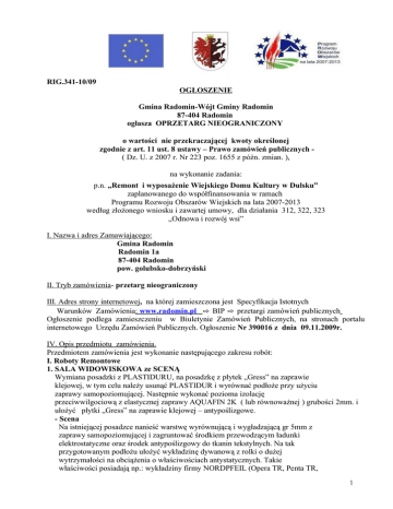 RIG.341-10/09 OGŁOSZENIE Gmina Radomin-Wójt Gminy Radomin 87-404 Radomin ogłasza OPRZETARG NIEOGRANICZONY o wartości nie przekraczającej kwoty określonej zgodnie z art. 11 ust. 8 ustawy – Prawo zamówień publicznych ( Dz. U. z 2007 r. Nr 223 poz. 1655 z późn. zmian. ), na wykonanie zadania: p.n. „Remont i wyposażenie Wiejskiego Domu Kultury w Dulsku” zaplanowanego do współfinansowania w ramach Programu Rozwoju Obszarów Wiejskich na lata 2007-2013 według złożonego wniosku i zawartej umowy, dla działania 312, 322, 323 „Odnowa i rozwój wsi” I. Nazwa i adres Zamawiającego: Gmina Radomin Radomin 1a 87-404 Radomin pow. golubsko-dobrzyński II. Tryb zamówienia- przetarg nieograniczony III. Adres strony internetowej, na której zamieszczona jest Specyfikacja Istotnych Warunków Zamówienia: www.radomin.pl ⇨ BIP ⇨ przetargi zamówień publicznych Ogłoszenie podlega zamieszczeniu w Biuletynie Zamówień Publicznych, na stronach portalu internetowego Urzędu Zamówień Publicznych. Ogłoszenie Nr 390016 z dnia 09.11.2009r. IV. Opis przedmiotu zamówienia. Przedmiotem zamówienia jest wykonanie następującego zakresu robót: I. Roboty Remontowe 1. SALA WIDOWISKOWA ze SCENĄ Wymiana posadzki z PLASTIDURU, na posadzkę z płytek „Gress” na zaprawie klejowej, w tym celu należy usunąć PLASTIDUR i wyrównać podłoże przy użyciu zaprawy samopoziomującej. Następnie wykonać pozioma izolację przeciwwilgociową z elastycznej zaprawy AQUAFIN 2K ( lub równoważnej ) grubości 2mm. i ułożyć płytki „Gress” na zaprawie klejowej – antypoślizgowe. - Scena Na istniejącej posadzce nanieść warstwę wyrównującą i wygładzającą gr 5mm z zaprawy samopoziomującej i zagruntować środkiem przewodzącym ładunki elektrostatyczne oraz środek antypoślizgowy do tkanin tekstylnych. Na tak przygotowanym podłożu ułożyć wykładzinę dywanową z rolki o dużej wytrzymałości na obciążenia o właściwościach antystatycznych. Takie właściwości posiadają np.: wykładziny firmy NORDPFEIL (Opera TR, Penta TR, 1 Kendo TR, Micro TR ( lub równoważne o wymienionych właściwościach wykładziny ). - Schody na zaplecze Wykonać wykładzinę z płytek Gress. Istniejące podłoże przed ułożeniem płytek zagruntować dwukrotnie środkiem wzmacniającym podłoże. Posadzki i schody wykończyć cokolikami z płytek. - Oświetlenie Wymiana 28 lamp oświetleniowych. - Ogrzewanie Wymiana grzejnika na płytowy. - Stolarka Wymiana 2 szt. drzwi jednoskrzydłowych prowadzących na zaplecze na nowe drewniane i drzwi dwuskrzydłowych prowadzących na holl, na nowe z aluminium. - Tynki Wykonanie gładzi gipsowych na tynkach ścian i malowanie farbami emulsyjnymi. 2. REMONT POMIESZCZEŃ NA ZAPLECZE SOCJALNE DLA KOŁA GOSPODYŃ WIEJSKICH WRAZ Z SANITARIATAMI - Tynki Wykonanie gładzi gipsowych i malowanie farbami emulsyjnymi. - Okładziny ścian Skucie istniejących i licowanie na zaprawie klejowej nowymi płytkami na wysokość 200 cm z uprzednim zagruntowaniem preparatami wzmacniającymi podłoże. -Posadzki Skucie istniejących i ułożenie nowych z Gressu antypoślizgowego na zaprawie klejowej wraz z cokolikami z uprzednim zagruntowaniem preparatami wzmacniającymi podłoże. - Stolarka drzwiowa Wymiana okuć w sanitariatach. - Instalacje sanitarne Wymiana muszli na nowe typu „kompakt”, wymiana umywalek i baterii. Wymiana rury wodociągowej. Wymiana grzejników na płytowe. - Instalacje elektryczne Wymiana lamp i części osprzętu. - Wentylacja Montaż wentylatora osiowego w ścianie zewnętrznej. 3. ADAPTACJA POMIESZCZENIA NA WIEJSKIE CENTRUM INFORMATYCZNE. - Tynki Wykonanie gładzi gipsowej i malowanie farbami emulsyjnymi. - Posadzki Zdjęcie istniejącej, wykonanie warstwy wzmacniającej i wyrównującej gr 2mm z zaprawy samopoziomującej i ułożenie posadzki z płytek Gress na zaprawie klejowej. - Instalacje elektryczne Wymiana starych na 3 nowe sufitowe lampy świetlówkowe 2x40W. Montaż 4 gniazd komputerowych wraz z okablowaniem w korytku, 1 włącznika światła i 1 gniazdka do wtyczki. - Instalacja c.o. Wymiana grzejnika na płytowy. 4. HOLL I SANITARIATY - Tynki Wykonanie gładzi gipsowej i malowanie farbami emulsyjnymi i olejnymi lamperii w hollu. Skucie płytek ściennych w sanitariatach i licowanie ścian na nowo płytkami na wysokość 200 cm. - Posadzki Rozebranie istniejących i ułożenie nowych z płytek „Gress” na zaprawie klejowej. 2 - Instalacje c.o. Wymiana grzejników na płytowe. - Instalacje elektryczne Wymiana lamp i części osprzętu. 5. SALA TRENINGOWA - Roboty rozbiórkowe Rozebranie ścianki z cegły na zaprawie cem.-wap. - Tynki Wykonanie gładzi gipsowej i malowanie farbami emulsyjnymi. - Posadzki Rozebranie istniejących i wzmocnienie preparatem gruntującym podłoża i ułożenie posadzki z płytek „Gress” na zaprawie klejowej. - Instalacje elektryczne Zainstalowanie 5 świetlówek 2x40W wraz z zamontowaniem wyłącznika i wtyczki. - Instalacje c.o. Wymiana grzejników na płytowe. - Wentylacja Montaż wentylatora osiowego wraz z kanałem wyrzutowym i nawietrzakiem podokiennym. 6. SCHODY ZEWNĘTRZNE Wzmocnienie podłoża przez zagruntowanie preparatem „CERESIT CT 17” lub „ATLAS UNI- GRUNT” i ułożenie płytek „Gress” na mrozo i wodoodpornej zaprawie klejowej. 7. WYMIANA ZEWNĘTRZNEJ STOLARKI DRZWIOWEJ Projektuje się wymianę zniszczonych drzwi zewnętrznych na nowe z PCV. 8. DACH Wymiana pokrycia z płyt azbestowo-cementowych falistych, na pokrycie z blachodachówki wraz z wymianą obróbek blacharskich, rynien, i rur spustowych. UWAGA! Rozbiórkę pokrycia z płyt azbestowo-cementowych należy zlecić firmie posiadającej odpowiednie uprawnienia i zezwolenia na prowadzenie tego rodzaju robót. 9. TERMORENOWACJA Docieplenie ścian zewnętrznych w Bezspoinowym Systemie Ociepleń, (usunięcie ewentualnych odparzeń tynków i uzupełnienie ubytków, zmycie wodą lub oczyszczenie z brudu i kurzu, zagruntowan
