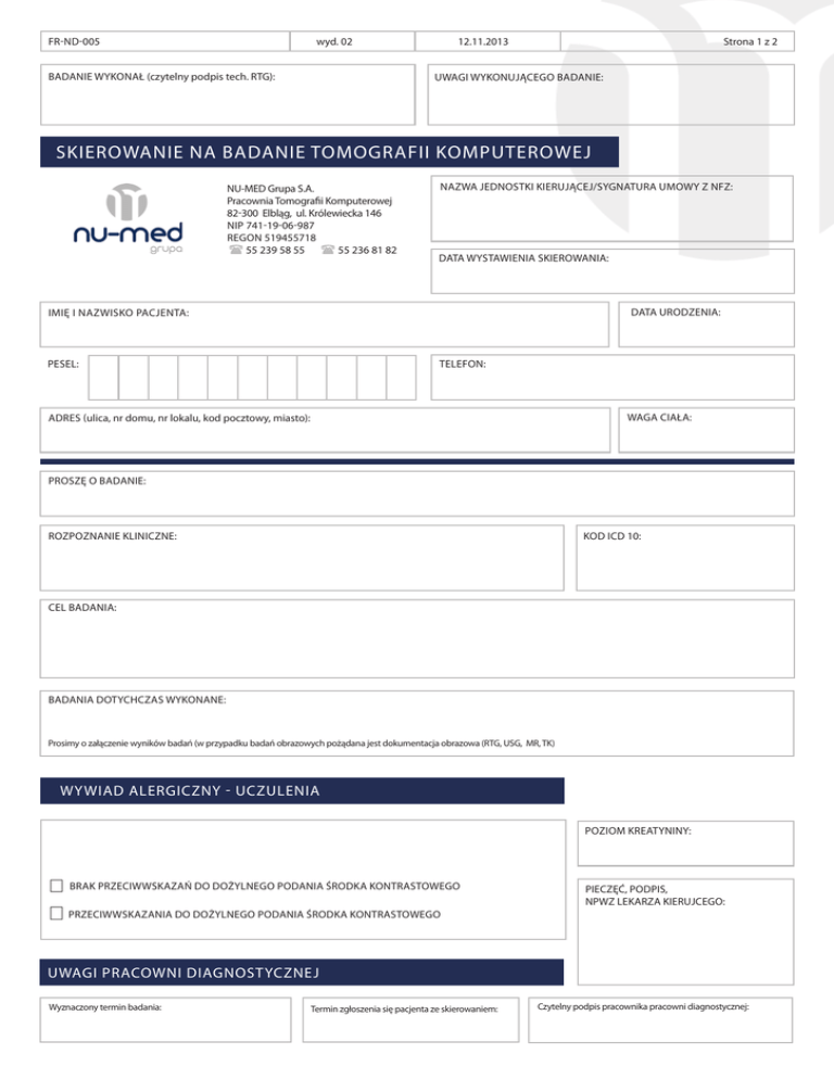 FR-ND-005 wyd. 02 BADANIE WYKONAŁ (czytelny podpis tech. RTG): 12.11.2013 Strona 1 z 2 UWAGI WYKONUJĄCEGO BADANIE: SKIEROWANIE NA BADANIE TOMOGRAFII KOMPUTEROWEJ NU-MED Grupa S.A. Pracownia Tomografii Komputerowej 82-300 Elbląg, ul. Królewiecka 146 NIP 741-19-06-987 REGON 519455718 55 239 58 55 55 236 81 82 NAZWA JEDNOSTKI KIERUJĄCEJ/SYGNATURA UMOWY Z NFZ: DATA WYSTAWIENIA SKIEROWANIA: DATA URODZENIA: IMIĘ I NAZWISKO PACJENTA: PESEL: TELEFON: WAGA CIAŁA: ADRES (ulica, nr domu, nr lokalu, kod pocztowy, miasto): PROSZĘ O BADANIE: ROZPOZNANIE KLINICZNE: KOD ICD 10: CEL BADANIA: BADANIA DOTYCHCZAS WYKONANE: Prosimy o załączenie wyników badań (w przypadku badań obrazowych pożądana jest dokumentacja obrazowa (RTG, USG, MR, TK) WYWIAD ALERGICZNY - UCZULENIA POZIOM KREATYNINY: BRAK PRZECIWWSKAZAŃ DO DOŻYLNEGO PODANIA ŚRODKA KONTRASTOWEGO PIECZĘĆ, PODPIS, NPWZ LEKARZA KIERUJCEGO: PRZECIWWSKAZANIA DO DOŻYLNEGO PODANIA ŚRODKA KONTRASTOWEGO UWAGI PRACOWNI DIAGNOSTYCZNEJ Wyznaczony termin badania: Termin zgłoszenia się pacjenta ze skierowaniem: Czytelny podpis pracownika pracowni diagnostycznej: FR-ND-005 wyd. 02 12.11.2013 Strona 2 z 2 ZGODA NA WYKONANIE BADANIA TK Przed podpisaniem zgody na wykonanie badania, prosimy o zgłoszenie informacji dotyczących nadwrażliwości na leki i wpółistnienia wymienionych poniżej chorób przez zaznaczenie odpowiedzi TAK/NIE. Wykonanie badania TK wymaga donaczyniowego podania środka kontrastowego. Mimio, iż jest to zabieg bezpieczny, mogą wystąpić powikłania, takie jak duszność, wysypka, świąt skóry, wstrząs anafilaktyczny, zapaść. Opisane powikłania mogą wystąpić niezależnie od wszystkich podjętych środków ostrożności. Dlatego też w czasie badania i pobytu w Pracowni Tomografii Komputerowej jest Pan/i pod fachowa opieką lekarzy radiologów (i w razie potrzeby lekarzy anestezjologów). Gabinety rentgenowskie przystosowane są do natychmiastowego udzielenia niezbędnej pomocy. Prosimy o rzetelne wypełnienie formularza. Informacje zawarte w wywiadzie pozwolą na ewentualne odstąpienie od podania kontrastu, gdy będzie podejrzenie o możliwość wystąpienia powikłań. WIEK: WAGA: PROSIMY O RZETELNE WYPEŁNIENIE FORMULARZA, ZAZNACZAJĄC PRAWIDŁOWĄ ODPOWIEDŹ. L.P. TAK 1. Czy jest Pan/i na czczo? 2. Czy kiedykolwiek miał/-a Pan/-i podawane środki kontrastowe? 3. NIE Jeśli tak, to czy wystąpiły reakcje uboczne? Jeżeli tak, to jakie: 4. Czy kiedykolwiek wystąpiło u Pana/-i uczulenie na jod? 5. Czy wystąpiły u Pana/-i reakcje uczuleniowe na leki? 6. Czy choruje Pan/-i na niewydolność nerek, inne choroby nerek? 7. Czy przebył Pan/-i operacje nerek? 8. Czy choruje Pan/-i na nadciśnienie, niewydolność układu krążenia lub oddechowego? 9. Czy choruje Pan/-i na nadczynność tarczycy – inne choroby tarczycy? 10. Czy choruje Pan/-i na astmę, alergie – inne? 11. Czy choruje Pan/-i na szpiczaka mnogiego, proteinurię? 12. Czy choruje Pan/-i na cukrzycę, padaczkę? 13. Czy jest Pani w ciąży? PROSIMY O PODPISANIE WŁAŚCIWEGO OŚWIADCZENIA: JA, NIŻEJ PODPISANY ZOSTAŁEM POINFORMOWANY/-A O UBOCZNYM DZIAŁANIU PROMIENIOWANIA RENTGENOWSKIEGO I POMIMO TEGO WYRAŻAM ZGODĘ NA JEGO WYKONANIE. (czytelny podpis pacjenta, rodziców, opiekunów) JA, NIŻEJ PODPISANY ZOSTAŁEM POINFORMOWANY/-A O MOŻLIWOŚCI POWIKŁAŃ PO PODANIU ŚRODKA CIENIUJĄCEGO STOSOWANEGO W BADANIU TK. ZAGADZAM SIĘ NA DOŻYLNE PODANIE ŚRODKA KONTRASTOWEGO. (czytelny podpis pacjenta, rodziców, opiekunów) JA, NIŻEJ PODPISANY ZOSTAŁEM POINFORMOWANY/-A O MOŻLIWOŚCI POWIKŁAŃ PO PODANIU ŚRODKA CIENIUJĄCEGO STOSOWANEGO W BADANIU TK. NIE ZGADZAM SIĘ NA DOŻYLNE PODANIE ŚRODKA KONTRASTOWEGO (czytelny podpis pacjenta, rodziców, opiekunów) JEDNOCZEŚNIE OŚWIADCZAM, ŻE TREŚĆ ANKIETY JEST DLA MNIE ZROZUMIAŁA, OTRZYMAŁEM WYSTARCZAJĄCE INFORMACJE NA TEMAT POTENCJALNYCH KORZYŚCI I RYZYKA PRZEPROWADZENIA BADANIA DIAGNOSTYCZNEGO, JEGO NASTĘPSTW ORAZ ZANIECHANIA, A PODANE ODPOWIEDZI SĄ ZGODNE ZE STANEM FAKTYCZNYM. ODPOWIEDZIALNOŚĆ ZA EWENTUALNE SKUTKI WYNIKAJĄCE Z PODANIA NIEPRAWDZIWYCH ODPOWIEDZI LUB ZATAJENIA WAŻNYCH INFORMACJI ZWIĄZANYCH Z BADANIEM TOMOGRAFII KOMPUTEROWEJ PONIOSĘ OSOBIŚCIE. (czytelny podpis pacjenta, rodziców, opiekunów) CZY POZOSTAWIŁ/-A PAN/-I POPRZEDNIE WYNIKI BADAŃ? TAK CD SZT. RTG NIE SZT. OPIS SZT. PODPIS OSOBY PRZYJMUJĄCEJ DOKUMENTACJĘ: