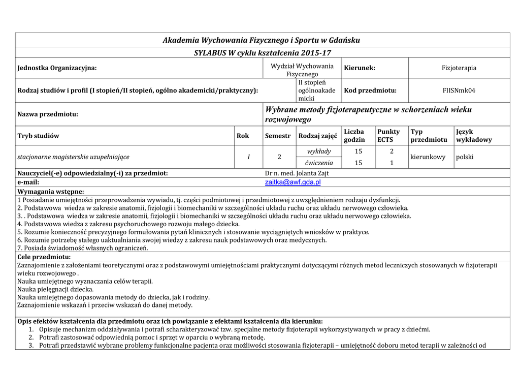 Akademia Wychowania Fizycznego i Sportu w Gdańsku SYLABUS W cyklu kształcenia 2015-17 Jednostka Organizacyjna: Rodzaj studiów i profil (I stopień/II stopień, ogólno akademicki/praktyczny): stacjonarne magisterskie uzupełniające Kierunek: Fizjoterapia Kod przedmiotu: FIISNmk04 Wybrane metody fizjoterapeutyczne w schorzeniach wieku rozwojowego Nazwa przedmiotu: Tryb studiów Wydział Wychowania Fizycznego II stopień ogólnoakade micki Rok I Semestr 2 Rodzaj zajęć Liczba godzin Punkty ECTS wykłady 15 2 ćwiczenia 15 1 Typ przedmiotu Język wykładowy kierunkowy polski Nauczyciel(-e) odpowiedzialny(-i) za przedmiot: Dr n. med. Jolanta Zajt [email protected] e-mail: Wymagania wstępne: 1 Posiadanie umiejętności przeprowadzenia wywiadu, tj. części podmiotowej i przedmiotowej z uwzględnieniem rodzaju dysfunkcji. 2. Podstawowa wiedza w zakresie anatomii, fizjologii i biomechaniki w szczególności układu ruchu oraz układu nerwowego człowieka. 3. . Podstawowa wiedza w zakresie anatomii, fizjologii i biomechaniki w szczególności układu ruchu oraz układu nerwowego człowieka. 4. Podstawowa wiedza z zakresu psychoruchowego rozwoju małego dziecka. 5. Rozumie konieczność precyzyjnego formułowania pytań klinicznych i stosowanie wyciągniętych wniosków w praktyce. 6. Rozumie potrzebę stałego uaktualniania swojej wiedzy z zakresu nauk podstawowych oraz medycznych. 7. Posiada świadomość własnych ograniczeń. Cele przedmiotu: Zaznajomienie z założeniami teoretycznymi oraz z podstawowymi umiejętnościami praktycznymi dotyczącymi różnych metod leczniczych stosowanych w fizjoterapii wieku rozwojowego . Nauka umiejętnego wyznaczania celów terapii. Nauka pielęgnacji dziecka. Nauka umiejętnego dopasowania metody do dziecka, jak i rodziny. Zaznajomienie wskazań i przeciw wskazań do danej metody. Opis efektów kształcenia dla przedmiotu oraz ich powiązanie z efektami kształcenia dla kierunku: 1. Opisuje mechanizm oddziaływania i potrafi scharakteryzować tzw. specjalne metody fizjoterapii wykorzystywanych w pracy z dziećmi. 2. Potrafi zastosować odpowiednią pomoc i sprzęt w oparciu o wybraną metodę. 3. Potrafi przedstawić wybrane problemy funkcjonalne pacjenta oraz możliwości stosowania fizjoterapii – umiejętność doboru metod terapii w zależności od dysfunkcji dziecka. 4. Rozumie potrzebę stałego uaktualniania swojej wiedzy z zakresu nauk podstawowych oraz medycznych. 5. Posiada świadomość swoich ograniczeń. 6. Krytycznie ocenia własne i cudze działania oraz dokonuje weryfikacji proponowanych rozwiązań. WIEDZA Zna mechanizm oddziaływania i potrafi scharakteryzować tzw. specjalne metody fizjoterapii, tj. metody W1 reedukacji posturalnej, reedukacji nerwowo- mięśniowej, neurorehabilitacji, terapii neurorozwojowej. K_W20 W2 Zna zagadnienia prawidłowego rozwoju fizycznego i motorycznego dziecka. K_W33 W3 Zna zaburzenia rozwoju fizycznego i motorycznego dziecka oraz podstawy diagnozowania tych zaburzeń i metody fizjoterapii K_W07K-W15 UMIEJĘTNOŚCI U1 U2 U3 Potrafi przedstawić wybrane problemy funkcjonalne pacjenta oraz możliwości stosowania fizjoterapii w formie ustnej, lub pisemnej w sposób przystępny dla odbiorców Potrafi tworzyć, weryfikować i modyfikować program usprawniania osób z różnymi dysfunkcjami narządu ruchu i innych narządów oraz układów, wykorzystując poznane metody fizjoterapeutyczne stosownie do stanu klinicznego i funkcjonalnego dziecka oraz celów kompleksowej rehabilitacji Potrafi programować aktywność ruchową adaptacyjną w rehabilitacji kompleksowej dzieci i młodzieży wykorzystują wiedzę na temat metod i potrafi podtrzymywać sprawność i wydolność dzieci. K_U05 K_U08 K_U09 Potrafi formułować problemy badawcze, konstruować i dobierać adekwatne metody oraz techniki badawcze do pozyskiwania danych. K_U13 K1 Jest świadomy potrzeby do uzupełniania i doskonalenia kwalifikacji - potrafi samodzielnie zdobywać wiedzę i umiejętności w zakresie wybranej specjalności zawodowej z wykorzystaniem wiarygodnych i efektywnych źródeł i metod K_K03 K2 Potrafi podejmować samodzielnie decyzje oraz brać za nie odpowiedzialność K_K08 U4 KOMPETENCJE Kryteria i metody oceny osiągniętych efektów kształcenia: Praktyczny sprawdzian umiejętności (zaliczenie z ocena- ćwiczenia) Egzamin pisemny – test wyboru jednokrotnego Metody i formy realizacji przedmiotu: Treści kształcenia: Wykłady: 1. Zapoznanie studentów z kartą przedmiotu. Przegląd metod fizjoterapeutycznych stosowanych w terapii dzieci wczoraj i dziś. 2. Metody diagnozowania wspomagania rozwoju dzieci z zaburzeniami neurorozwojowymi (NDT Bobath, Metoda Vojty, metoda Integracji sensorycznej, Metoda Domana, metoda Peto) 3. Metody fizjoterapeteczne stosowane u dzieci z zaburzeniami wzrastania kośćca (skoliozy, wady postawy, jałowe martwice kości). Ćwiczenia: 1. Metodyka diagnozowania i terapii w skolioz metodą FITS. 2. Metodyka stosowania w terapii metody FED i metody Scolas 3. Metodyka diagnozowania i usprawniania dzieci z zaburzeniami motorycznymi ( Voyta, Bonath IS) Forma zaliczenia: Egzamin 3 6 6 3 3 9 Literatura: Podstawowa: 1. Zembaty, A. (red): Kinezyterapia. T. 1 i 2. Wyd. Kasper, Kraków, 2003. 2. Orzech, J. Rozwój koncepcji, technik i metod fizjoterapii. Wyd, Sport i rehabilitacja. Tarnów. 2001. Bilans punktów ECTS (1 pkt ECTS – 25-30 godz. pracy studenta): Aktywność Udział w wykładach Samodzielne studiowanie tematyki wykładów Udział w ćwiczeniach Przygotowanie się do ćwiczeń Konsultacje Przygotowanie się do egzaminu Przygotowanie się do zaliczenia umiejętności Całkowite obciążenie pracą studenta Punkty ECTS za przedmiot Wykłady ćwiczenia Obciążenie studenta godz. 15 godz. 10 godz. 15 godz. 10 godz. 5 20 godz. 15 godz. 90 godz. ECTS 2 ECTS 1
